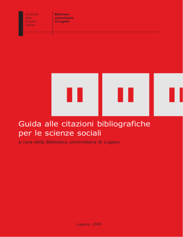 Università della Svizzera italiana Biblioteca universitaria di Lugano Guida alle citazioni bibliografiche per le scienze sociali a cura della Biblioteca universitaria di Lugano Lugano, 2009 Biblioteca Università della Svizzera italiana Lugano [email protected] www.bul.unisi.ch CITAZIONI PER LE SCIENZE SOCIALI Sommario Scopo della guida La struttura della citazione Il riferimento bibliografico Note bibliografiche e riferimenti nel corpo del testo Note esplicative Quale stile di citazione scegliere Il sistema autore-data La struttura del riferimento bibliografico nel corpo del testo La bibliografia Norme generali Monografie in uno o più volumi Contributi in monografie Articoli su periodici Articoli su database Articoli su quotidiani Recensioni Letteratura grigia Opere di consultazione Rapporti Materiale audiovisivo Materiale multimediale Siti Internet Posta elettronica Documenti legislativi Documenti disponibili su diversi supporti Citazioni tratte da fonti secondarie Trattamento del materiale online Abbreviazioni Bibliografia Manuali di stile disponibili in biblioteca Glossario 3 4 6 6 6 7 10 10 13 13 15 17 17 18 19 20 20 21 22 22 23 23 25 26 26 27 28 29 30 30 31 1 2 CITAZIONI PER LE SCIENZE SOCIALI Scopo della guida Ogni produzione scritta, che non sia di pura fantasia, si basa su dati, notizie e informazioni tratte dal lavoro di altri professionisti. In un testo si può inserire ogni tipo d’informazione tratta da diverse fonti: libri, articoli, manoscritti, lettere, notizie biografiche, dati statistici, indirizzi ecc. Queste informazioni possono presentarsi sotto forma di citazioni, ovvero “tratti di testo presi direttamente da un altro contesto e riportati nella forma in cui in esso compaiono” (Lesina 1994, 250), oppure di parafrasi, cioè rielaborazioni del contenuto di un testo altrui. Infine, è possibile riferirsi ad altri testi semplicemente discutendone o commentandone le idee. In ciascuno di questi casi è necessario indicare la fonte dei riferimenti. Questo per diversi motivi molto importanti: • il rispetto della proprietà intellettuale e dei diritti d’autore, evitando quindi il plagio • la possibilità di reperire il testo originale da parte del lettore • la necessità di documentare l’entità e la natura delle proprie ricerche Lo scopo di questa guida è di fornire le indicazioni essenziali su come redigere una citazione e come gestire correttamente i riferimenti bibliografici. Ci riferiremo qui alle tipologie più comuni di pubblicazione. Per tutte le altre tipologie suggeriamo di fare riferimento ai manuali di stile indicati al termine della guida. Inoltre, il personale della biblioteca è a disposizione per fornire consigli su questa materia. Qui di seguito verranno considerati i seguenti argomenti: • come si redige una citazione • come si presenta il sistema di citazione autore-data • quali elementi vanno inclusi nei riferimenti bibliografici • come si presentano i riferimenti bibliografici con il sistema autore-data • come si compila correttamente una bibliografia con il sistema autoredata Per la redazione di questa guida sono stati utilizzati esempi e materiale tratti da Il nuovo manuale di stile di Roberto Lesina (1994) e da The Chicago manual of style della University of Chicago Press (2003; qui di seguito indicato come The Chicago manual of style). 3 CITAZIONI PER LE SCIENZE SOCIALI La struttura della citazione Le citazioni possono essere inserite all’interno del testo sotto forma di inserzioni “in corpo” e “fuori corpo”. Citazioni in corpo Nel caso di citazioni brevi i termini citati vengono integrati nel testo e segnalati da virgolette di apertura e chiusura. Aveva scelto “la pace della solitudine”, imparato che “né un tetto, né una casa, né un letto sono necessari all’esistenza” e imparato a credere in sé stesso. Citazioni fuori corpo Nel caso di citazioni particolarmente lunghe (oltre le otto righe), o di citazioni che devono essere oggetto d’analisi, il passaggio citato va inserito a parte rispetto il testo, senza virgolette, in carattere ridotto, rientrato di un centimetro e con interlinea singola. Di norma se la frase che introduce la citazione non è compiuta essa termina con i due punti. In altri casi, invece, viene compiuta coscientemente un’operazione di rottura e di scelta. Leggiamo infatti: un secolo possiede le parole, un altro le sceglie, un altro ne fa uso e infine un altro, facendovi ricorso, non le possiede più. E’ fondamentale che la trascrizione del testo sia fedele all’originale citato. Citazioni nelle citazioni Se la citazione riportata contiene un’altra citazione è necessario renderlo noto evidenziando la citazione interna con virgolette singole o doppie. Nel caso di citazioni “in corpo” si usano le virgolette singole, ovvero il segno dell’apostrofo. Questi figli della depressione “dominando un linguaggio ‘hanno cessato di aggrapparsi alle gonne di madre Inghilterra’, sono usciti dall’adolescenza e sono diventati uomini”. 4 CITAZIONI PER LE SCIENZE SOCIALI Nel caso di citazioni “fuori corpo” si usano le virgolette doppie. Questi figli della depressione dominando un linguaggio “hanno cessato di aggrapparsi alle gonne di madre Inghilterra”, sono usciti dall’adolescenza e sono diventati uomini. Aggiunte Se si aggiunge del testo all’interno della citazione occorre inserirlo tra parentesi quadre. “Ma nonostante tutto questo [la vita] è bella. Molto bella.” Omissioni L’omissione si segnala con i tre punti di sospensione. L’ordine è, uomini, donne, cittadini, che quando udrete lo squillo delle trombe, o il picchiar del tamburo, accorriate in massa sulla piazza del borgo e applaudiate e osanniate la serena persona del Conte che sfilerà con la carrozza col seguito: chi non obbedirà a questo ordine sarà passibile di multa, di arresto, o di altre punizioni che potranno venire stabilite. L’ordine è, … che quando udrete lo squillo delle trombe …