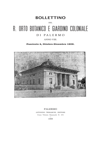 BOLLETTINO DEL R. ORTO BOTANICO E GIARDINO COLONIALE D I PA L E R M O ANNO VIII. Fascicolo 4, Ottobre-Dicembre 1909. PALERMO ANTONINO TRIMARCHI, EDITORE Corso Vittorio Emanuele N. 375 1909 N.° 4 OTTOBRE - DICEMBRE 1909. Vol. VIII. BOLLETTINO DEL R. ORTO BOTANICO E GIARDINO COLONIALE D I PA L E R M O SOMMARIO: 12. Risultati di colture selezionate: 1° Hordeum sativum . . . . . . . . pag. 153 (C. Tropea) . 13. Colture esperimentali di Cotoni del R. Giardino Botanico e Coloniale di Palermo, durante l’anno » 171 1909 (A. Borzì). . . . . . . . 14. Il C h r y s o m p h a l u s d i c t y o s p e r m i var. p i n n u l i f e r a , Mash. negli agrumeti siciliani » 189 (T. De Stefani) . . . . . . . . » 197 15. Altre Acantacee a nettarii estranuziali (G. E. Mattei) . . . . » 199 16. Altre Graminacee a nettarii (G. E. Mattei) . » 207 17. Rassegna della stampa Coloniale agraria (G. E. Mattei). 18. Studii sulle Cattee del R. Orto Botanico di Palermo . . . . . . . » 215 (V. Riccobono) . 19. Plantae Erythraeaea L. Senni annis 1905 - 07 lectae. Continuatio (Recognoverunt D. Lanza et G. E. Mattei) . . . . . . . . . . » 267 20. Indice del Volume VIII. . . . . . . . » 279 PALERMO ANTONINO TRIMARCHI, EDITORE Corso Vittorio Emanuele N. 375 1909 Studii sulle Cattee del R. Orto Botanico di Palermo. Palermo e le sue adiacenze offrono particolari condizioni di clima e di suolo, per cui numerose piante esotiche, coltivate qui in piena terra, presentano una vigorosa vegetazione, ed abbondantemente fioriscono e fruttificano, formando la meraviglia dei numerosi forestieri che visitano la Sicilia. Infatti le stesse piante, nel continente e nelle altre regioni d’Europa, vivono stentatamente, benchè riparate d’inverno, e difficilmente fioriscono. A questo contribuisce il clima di Palermo, mite ed uniforme, la cui temperatura solo eccezionalmente si abbassa fino a zero, come pure la mancanza quasi assoluta di nebbie, e la moderazione dei venti, trattenuti dall’anfiteatro di montagne, che cinge la pianura palermitana, e dalla vicinanza del mare: si aggiunga che il sottosuolo é ricco di acque, per cui il terreno, formato da depositi alluvionali, rimane sempre un poco umidiccio. Numerosi sono quindi le ville ed i giardini, pubblici e privati, ricchissimi di rare piante, le quali, con la loro vigorosa vegetazione danno al forestiere l’impressione di regioni tropicali. Sovra tutti però di gran lunga primeggia l’Orto Botanico, per la quantità veramente grande di specie rare e belle, in esemplari di grande sviluppo, che destano interesse non solo agli scienziati ma ancora ai profani: ciò si deve alla cura posta dai diversi Direttori dell’Orto stesso, e specialmente dell’attuale Direttore Prof. A. Borzì, 216 di volere incessantemente aumentare il numero già ingente di specie qui coltivate, introducendone sempre di nuove, dalle più lontane regioni. Questo Orto Botanico quindi porge qui un materiale vivente di studio, che difficilmente si potrebbe trovare in altri giardini d’Europa, e numerosi studii, pubblicati da insigni botanici, sopra piante qui coltivate, stanno a testimoniare la ricchezza e l’importanza delle nostre collezioni. Io pure in diversi articoli ho richiamato l’attenzione sopra alcune piante rare di questo Orto Botanico, come le Palme, gli Agrumi, le Plumerie ed altre. Una delle collezioni però che ha maggiormente attirato sempre la mia attenzione, ed al cui studio mi sono da parecchi anni dedicato con assiduità, è quella delle Cattee. Da molto tempo si andò qui riunendo il maggior numero possibile di Cattee, di modo che ora costituiscono, per numero e per rarità di esemplari, una delle più complete collezioni esistenti in Europa. Causa la mitezza del clima di Palermo, la maggior parte di esse resistono bene all’aria libera, in vaso od in piena terra, ove crescono rigogliose, formando dei massivi arborei di sorprendente bellezza: poche, in vaso, vengono d’inverno riparate da semplice tettoia. Per la maggior parte fioriscono e fruttificano, rendendosi così facile il loro studio, mentre nelle altre regioni d’Europa male si presentano ad essere studiate, avendo nelle serre uno sviluppo deficiente e raramente colà fiorendo. Ritengo perciò interessante il presente studio sulle Cattee di questo Orto Botanico, avendo potuto sul vivo completare o correggere quanto dicono gli autori per molte specie, fino ad oggi incompletamente conosciute. Per far questo mi sono limitato esclusivamente allo studio delle specie venute in fiore, sospendendo quello delle altre, pure qui coltivate, fino a tanto che non se ne presenti la fioritura. Di ogni specie, oltre alle citazioni bibliografiche ed alla sinonimia, da me potuta accertare, ho creduto opportuno aggiungere una descrizione della pianta a sviluppo completo, dei fiori, e dei frutti quando mi fu possibile vederli, aggiungendo quelle altre osservazioni e notizie che volta per volta erano necessarie. Non posso chiudere questa breve introduzione senza rendere al chiarissimo Prof. A. Borzì, Direttore di questo Regio Orto Botanico, i miei più sentiti ringraziamenti per avermi indirizzato ed incoraggiato nella compilazione di questo lavoro. Al tempo stesso rivolgo il pensiero ed un ringraziamento al Prof. Achille Terracciano, oggi Direttore del R. Orto Botanico di 217 Sassari, che durante il tempo del suo assistentato in Palermo, con vigile cura seguì amorosamente i miei studi. Infine ringrazio il Prof. Gr. E. Mattei, che pure mi prestò assistenza e consigli nella elaborazione di questo lavoro, Classificazione delle Cattee. Gli autori ascrivono a questa famiglia oltre 1000 specie, ma molte di queste sono ancora incerte, non conoscendosene affatto o solo imperfettamente la fioritura. Ne deriva di conseguenza che, mentre dapprima erano classificate in pochi generi, man mano che molte andarono fiorendo furono giudicate atte a costituire nuovi generi, si che ora questi ascendono a circa 40, e certamente altri se ne potranno separare,