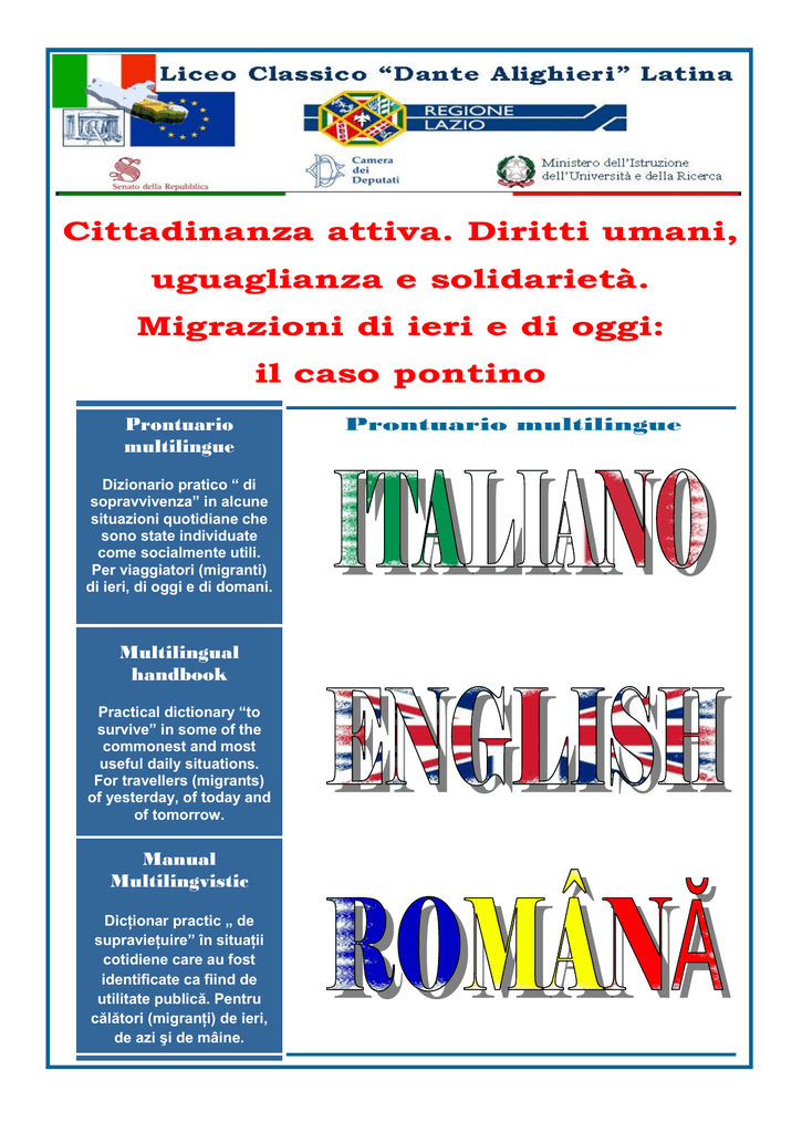 Cittadinanza attiva. Diritti umani, uguaglianza e solidarietà. Migrazioni di ieri e di oggi: il caso pontino Prontuario multilingue Dizionario pratico “ di sopravvivenza” in alcune situazioni quotidiane che sono state individuate come socialmente utili. Per viaggiatori (migranti) di ieri, di oggi e di domani. Multilingual handbook Practical dictionary “to survive” in some of the commonest and most useful daily situations. For travellers (migrants) of yesterday, of today and of tomorrow. Manual Multilingvistic Dicţionar practic „ de supravieţuire” în situaţii cotidiene care au fost identificate ca fiind de utilitate publică. Pentru călători (migranţi) de ieri, de azi şi de mâine. Prontuario multilingue 2 Un ringraziamento a tutti coloro che hanno lavorato a questo dizionario: le docenti di inglese prof.sse Conte Marisa, D'Amore Maria Rosaria, Sicali Angela, Spaghetti Tiziana, Zanchetta Paola; il prof. Magagnoli Giuseppe per il supporto grafico-informatico; le classi IV A-B-C-D-E-F e V A-B-C-D-E-F-G. Un ringraziamento speciale a Andrea Radu della classe IV C per la traduzione in rumeno. Thank-you to all those who have worked at this dictionary: the teachers of English of Liceo Ginnasio: Marisa Conte, Maria Rosaria D'Amore, Angela Sicali, Tiziana Spaghetti, Paola Zanchetta; Giuseppe Magagnoli for the computer graphics; the classes IV A-B-C-D -E-F and V A-B-C-D-E-F-G. A special thank-you to Andrea Radu from IV C for the translation into Rumenian. Un mare mulţumesc a tuturor celor ce au permis, lucrând la şcoală şi acasă, realizarea acestui ghid, profesorii de limba Engleză: Marisa Conte,Maria Rosaria D’Amore, Angela Sicali,Tiziana Spaghetti, Paola Zanchetta; profesorul Giuseppe Magagnoli pentru aspectul grafic-informatic, şi studenţii claselor IV A-B-C-D-E şi V A-B-C-D-E-F. O mulţumire specială merge a eleva Andreea Radu, clasa IV C, care ne-a ajutat cu traducerea în limba română. 3 DIZIONARIO MULTILINGUE La realizzazione di un piccolo dizionario multilingue (italiano/inglese/rumeno) per la vita quotidiana è nata dalla necessità di offrire un dizionario pratico sulle più comuni e utili situazioni di vita quotidiana a quegli stranieri che vivono a Latina. In particolare la scelta delle lingue in cui tradurlo è scaturita oltre che dall'esigenza didattica di far usare agli studenti la lingua inglese che studiano a scuola a scopi comunicativi, dal risultato di una inchiesta sul territorio pontino che ha rilevato la presenza di una forte comunità rumena in questa zona. E numerosi sono anche gli studenti rumeni nel nostro Liceo. Un ringraziamento speciale va a questo proposito ad una di loro Andrea Radu della classe IV C che ci ha aiutato nella traduzione in rumeno. MULTILINGUAL DICTIONARY This project developed from the necessity to offer a practical multilingual (Italian/ English/Rumenian) dictionary of the commonest and most useful daily situations to those foreigners who live in Latina. The Rumenian has been chosen after a survey which showed the Rumenian community being the largest one in Latina and in the surroundings. Several Rumenian students are in our school too. A special thank-you to one of them: Andrea Radu class IV C who has been really helpful in translating these pages into the Rumenian language. DICŢIONAR MULTILINGVISTIC Realizarea unui mic dicţionar multilingvistic (italiană/engleză/romană) pentru viaţa cotidiană s-a născut din nevoia de a oferii celor ce trăiesc în Latina un dicţionar practic basat pe cele mai comune şi utile situaţi de viaţă cotidiană. În special alegerea limbiilor de tradus a fost causată de exigenţa ditactică de a face uz studenţiilor de limba Engleză pe care o învaţă la şcoală pentru scopuri comunicative, precum şi rezultaul a unei investigaţii pe teritoriul pontin care a detectat prezenţa a unei mari comunităţi româneşti în aceasta zonă. Şi numeroşi sunt de asemena studenţii români în liceul nostru. O mulţumire specială merge în acest sens, la una dintre ei, eleva Andreea Radu, clasa IV C, care ne-a ajutat cu traducerea în limba română. 4 5 Index Cuprins Useful Language Limba vorbită ● Shopping In a shop Pag ● Cumparaturi ● Eating & Drinking ● Mancare şi băutură ● Accomodation (Can you recommend…?) ● Cazare ● Transport (Travelling) Într -un magazin In a restaurant, pub, bar Într -un restaurant,pub,bar In a hotel Într -un hotel How much is the ticket to…? 12 ● Transport(Călătorii) ● Social services (Bank, Post Office) ● Servici sociale(bancă,poştă) ● Health Care (hospital, doctor, chemistry) ● Cură medicală(spital,farmacie etc.) ● Familiary counseling ●Terapie de familie ● Registry Office ● Oficiul de înregistrări ● The Latina’s Caritas ●Asociaţia Caritas din Latina ● Schools ● Şcoală ● Driving licence and Safety on streets ● Permis de conducere şi siguranţă pe străzi Cât costă un bilet...? At the post office/ bank Într-o bancă /poştă At the doctor La doctor 39 46 50 52 ● Emergency (police) ● Urgenţă At the police station In oficiul politiiei 72 ● Entertainment (disco, cinema, theatre, sport) ● Distracţie (cinema,teatru,sport,discotecă) ● Lifestyle in Latina In a disco/ cinema/ theatre / sport În discotecă,la teatru etc… 75 ● Stilul de viaţă în Latina 7 17 21 26 29 33 59 At the registry Office Într -un oficiu de inregistari 61 62 63 At the schools Într -o scoala 65 67 70 77 81 82 6 Shopping 7 Useful Language: in a shop ITALIAN ENGLISH Sto cercando un paio di … I’m looking for a pair of … Vorrei qualcosa che stia bene con questo La mia taglia è … I’d like something to go with this Posso provarmelo ? Can I try this on ? Dove sono i camerini ? Where are the changing rooms ? Non mi va bene It doesn’t fit me E’ troppo grande It’s too big E’ troppo stretto It’s too tight I take a size … Have you got a bigger/smaller size ? Avete lo stesso modello , 