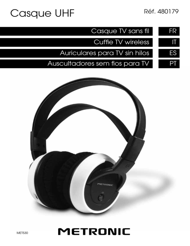 Casque UHF MET530 Réf. 480179 Casque TV sans fil FR Cuffie TV wireless IT Auriculares para TV sin hilos ES Auscultadores sem fios para TV PT FR 1 - Généralités Vous venez d’acquérir un produit METRONIC, nous vous remercions pour votre confiance. Nous sommes persuadés que l’appareil vous donnera entière satisfaction. Si vous rencontrez un problème durant l’installation ou l’utilisation, n’hésitez pas à contacter nos techniciens de support : - Par courrier électronique à l’adresse [email protected] - Par téléphone Pour préserver votre audition, maintenez un volume faible. Pour éviter un choc acoustique, respectez scrupuleusement la procédure décrite au paragraphe 4. La transmission utilise des fréquences utilisées par d’autres équipements. Une perturbation, de l’émetteur vers l’équipement, ou de l’équipement vers le casque est donc possible. Dans ce cas, changez de canal comme expliqué plus bas pour tenter de résoudre le problème. L’utilisation de ce produit est limité à l’intérieur des bâtiments. 2 - Contenu de l’emballage - Base de charge Casque Alimentation socle: 8V 0,2A Alimentation casque : 2 x AAA Ni-MH – 1,2V 3 - Descriptif 1 2 2 Bouton auto scan : Bouton de recherche automatique du canal Marche / arrêt 3 Contrôle du volume 4 Contact de charge 5 Indicateur de charge 6 Indicateur de transmission 7 Prise d’alimentation 8 Interrupteur ON / OFF de la base 9 Câble audio jack 10 Sélecteur de canaux 1 2 3 Assistance technique : 0892 350 315 prix d’appel 0,35 € TTC + prix d’appel Écouteur Gauche FR Écouteur Droit 1 2 4 3 6 5 ON DC IN 7 POWER OFF ON CHANNEL 1 2 3 8 Assistance technique : 0892 350 315 prix d’appel 0,35 € TTC + prix d’appel 9 10 3 FR 4 - Avertissement Au volume maximal, l’écoute peut endommager les oreilles. Prenez les précautions suivantes avant de mettre le casque sur les oreilles : •Tenez le casque dans vos mains, sans le poser sur votre tête. •Réglez le volume sonore de la source au tiers environ. •Activez la connexion et vérifiez que le son sort du casque. •Posez le casque sur les oreilles. •Ajustez le volume grâce à la molette du casque et au volume du téléviseur. 5 - Installation de la base •Connectez l’alimentation secteur fournie à la base de charge puis à la prise de courant. •Connectez le câble audio à votre TV, ordinateur, etc. •Allumez la base en poussant l’interrupteur 8 sur ON. •Mettez en marche votre TV, ordinateur, etc. •Le voyant ON 6 s’allume. 6 - Installation du casque Note : Avant de tester le casque, il est nécessaire de le laisser se charger sur la base quelques minutes. Pour bénéficier d’une autonomie optimale, une charge complète (jusqu’à 6 heures) est nécessaire. Lorsque la charge est complète, l’indicateur 5 s’éteint. •Le casque fonctionne sur deux batteries AAA(LR03) Ni-MH 1,2V fournies. •Installez les batteries selon les explications du paragraphe 7. 2 qui s’allume alors en rouge. •Appuyez sur la touche •Appuyez sur la touche AUTO SCAN 1 . Lorsque la base et le casque sont appairés, le voyant AUTO SCAN s’allume en vert. •Lorsque vous posez le casque sur sa base (pour recharger les batteries), le voyant AUTO SCAN s’éteint et le voyant de charge de la base 5 s’allume. 4 Assistance technique : 0892 350 315 prix d’appel 0,35 € TTC + prix d’appel 7 - remplacer les batteries FR Une fois usagées, les piles ou batteries rechargeables ne doivent jamais êtres jetées avec les ordures ménagères, rapportez-les à votre point de vente où un conteneur est mis à votre disposition. •Ouvrez le compartiment à piles situé sur l’écouteur droit (celui avec la touche Marche/Arrêt) et logez-y les piles ou batteries en respectant la polarité indiquée dans le compartiment. •Refermez le compartiment. Le casque peut fonctionner avec des piles salines ou alcalines 1.5V. Néanmoins, nous vous déconseillons fortement d’utiliser de telles piles, car elles pourraient exploser si vous reposez le casque sur sa base de recharge en laissant ces piles à l’intérieur. 8 - Choix du canal Pour éviter des interférences avec d’autres équipements utilisant les liaisons sans fils, vous pouvez changer de canal. Pour cela, sélectionnez un autre canal au moyen du sélecteur 10 situé à l’arrière de la base Appuyez ensuite une fois sur le bouton AUTO SCAN 1 situé sur le côté de l’écouteur gauche du casque. Le récepteur du casque s’accordera automatiquement sur le nouveau canal. 9 - En cas de problème 1 - Le casque ne diffuse aucun son : • Vérifiez que le casque est allumé (bouton 2 allumé rouge) et apparairé avec la base (bouton 1 allumé vert) • Vérifiez que le volume de la source n’est pas au minimum 2 - Le voyant du casque ne s’allume pas : • Essayez avec des piles neuves ou des batteries chargées à fond. • Vérifiez le sens des piles. 3 - La liaison sonore est perturbée : • Essayez un autre canal (voir point 8) • Pour augmenter la portée de l’émetteur, vous pouvez le surélever. Assistance technique : 0892 350 315 prix d’appel 0,35 € TTC + prix d’appel 5 FR 10 - Caractéristiques techniques Nombre de canaux : 3 Canal 1 : 863,5 MHz Canal 2 : 864,0 MHz Canal 3 : 864,5 MHz Puissance : 2 x 20 mW Portée (espace libre) : 70 m Alimentation secteur : 12V 150mA Alimentation casque : 2 x AAA 1,2 - 1,2V Autonomie : plus de 10 heures Ce logo signifie qu’il ne faut pas jeter les appareils hors d’usage avec les ordures ménagères. Les substances dangereuses qu’ils sont susceptibles de contenir peuvent nuire à la santé et à l’environnement. Faites reprendre ces appareils par votre distributeur ou utilisez les moyens de collecte sélective mis à votre disposition par votre commune. L’intérieur de votre équipement contiennent des composants fragiles ; n’ouvrez jamais les appareils, même après avoir débranché le secteur. Pour nettoyer votre casque e