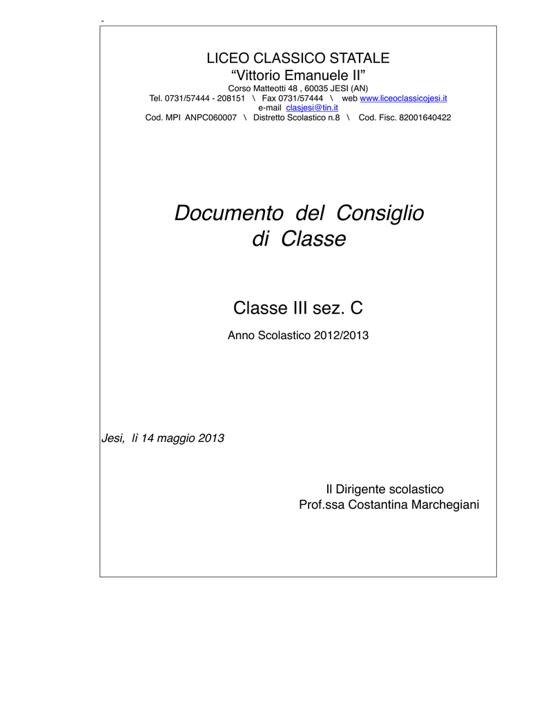 - LICEO CLASSICO STATALE “Vittorio Emanuele II” Corso Matteotti 48 , 60035 JESI (AN) Tel. 0731/57444 - 208151 \ Fax 0731/57444 \ web www.liceoclassicojesi.it e-mail [email protected] Cod. MPI ANPC060007 \ Distretto Scolastico n.8 \ Cod. Fisc. 82001640422 Documento del Consiglio di Classe Classe III sez. C Anno Scolastico 2012/2013 Jesi, lì 14 maggio 2013 Il Dirigente scolastico Prof.ssa Costantina Marchegiani INDICE !2 PRESENTAZIONE DEL CONSIGLIO DI CLASSE 2 PRESENTAZIONE DELLA CLASSE 2 DOCENTI E CONTINUITÀ’ DIDATTICA NEL TRIENNIO 3 STORIA DELLA CLASSE 4 SITUAZIONE DELLA CLASSE ALLA CONCLUSIONE DEL PERCORSO FORMATIVO 5 OBIETTIVI PLURIDISCIPLINARI 5 OBIETTIVI DISCIPLINARI 6 ITALIANO 6 LATINO 7 GRECO 8 INGLESE 9 FILOSOFIA 10 STORIA 11 MATEMATICA 12 FISICA 13 SCIENZE 14 STORIA DELL’ARTE 15 EDUCAZIONE FISICA 16 RELIGIONE 16 METODOLOGIA ATTUATA 17 OBIETTIVI PROGRAMMATI COMUNI A TUTTE LE DISCIPLINE 18 TIPI DI PROVA OGGETTO DI VALUTAZIONE 20 DOCIMOLOGIA 20 GRIGLIA DI VALUTAZIONE PER LA PRIMA PROVA SCRITTA – TIPOLOGIA A 21 GRIGLIA DI VALUTAZIONE PER LA PRIMA PROVA SCRITTA – TIPOLOGIA B 22 GRIGLIA DI VALUTAZIONE PER LA PRIMA PROVA SCRITTA – TIPOLOGIA C 23 GRIGLIA DI VALUTAZIONE PER LA PRIMA PROVA SCRITTA – TIPOLOGIA D 24 GRIGLIA DI VALUTAZIONE PER LA SECONDA PROVA SCRITTA 25 GRIGLIA DI VALUTAZIONE PER LA TERZA PROVA SCRITTA 26 GRIGLIA DI VALUTAZIONE PER IL COLLOQUIO 27 CRITERI UTILIZZATI PER ILCALCOLO DEL VOTO NELLE SINGOLE PROVE 28 ATTIVITA’ INTEGRATIVE DEL PERCORSO FORMATIVO 29 CONTENUTI 30 ITALIANO 30 LATINO 33 GRECO 36 INGLESE 39 FILOSOFIA 42 STORIA 44 MATEMATICA 46 FISICA 47 SCIENZE 49 STORIA DELL’ARTE 51 EDUCAZIONE FISICA 53 RELIGIONE 53 ALLEGATI- DOCUMENTAZIONE RELATIVA ALLA PREPARAZIONE DELLA TERZA PROVA !3 54 PRESENTAZIONE DEL CONSIGLIO DI CLASSE Discipline Docenti RELIGIONE Alessandra Marcuccini ITALIANO Cinzia Pellegrini LATINO Francesca Bertolissi GRECO Vera Valletta STORIA Federico Lecchi FILOSOFIA Federico Lecchi INGLESE Maria Paola Maceratini MATEMATICA Antonella Maggiori FISICA Matteo Cesaroni SCIENZE Maria Giuseppina Sbarbati STORIA DELL’ARTE Lucia Zannini ED. FISICA Gianfranco Latino PRESENTAZIONE DELLA CLASSE Numero totale degli studenti 21 Maschi 3 Femmine 18 Provenienti da questa scuola 21 Provenienti da altra scuola 0 Promossi dalla classe precedente 21 Ripetenti terza liceo // Abbandoni e ritiri durante l’anno // !4 Firme DOCENTI E CONTINUITÀ DIDATTICA NEL TRIENNIO Anno scola stico 20102011 20112012 20122013 !5 GREC O INGLE SE FILOSO FIA STORIA MATEMAT ICA Lecchi Federico ITALIAN O LAT INO Pellegrin i Cinzia Fra nce sca Bert oliss i Pellegrin i Cinzia Fra nce sca Bert oliss i Vallett a Vera Macer atini Maria Paola Lecchi Federico Pellegrin i Cinzia Fra nce sca Bert oliss i Vallett a Vera Macer atini Maria Paola Lecchi Federico Vallett a Vera Macer atini Maria Paola SCIEN ZE ARTE ED.FISIC A Fabrizio Pierella (Supplente Ivelina Bobtcheva Sbarb ati Maria Giusep pina Lucia Zanni ni Latino Gianfranc o Marcuccini Alessandra Maggiori Antonella Sbarb ati Maria Giusep pina Calzol ari Miche la Latino Gianfranc o Marcuccini Alessandra Sbarb ati Maria Giusep pina Lucia Zanni ni Latino Gianfranc o Marcuccini Alessandra Maggiori Antonella FISICA Matteo Cesaroni Matteo Cesaroni RELIGIONE STORIA DELLA CLASSE Storia della classe 3° sez. C Corso Liceo Classico COMPOSIZIONE Totale alunni Ripete nti To t. M F M 5° anno 1 21 3 2012/ 8 13 4° anno 1 21 3 2011/ 8 12 3° anno 1 22 3 9 2010/ 11 2° anno 1 23 4 9 2009/ 10 1° anno 2 26 5 1 2008/ 1 09 !6 ESITI Provenie nti da altra scuola F M F Promoss Non i Promo 2°sessio ssi ne M F M F 1 1 1 1 1 3 3 4 4 2 2 3 Non Ritirat Promo promossi io ssi con 2°sessio trasfe debito ne riti M F M F M F 1 1 1 1 1 1 SITUAZIONE DELLA CLASSE ALLA CONCLUSIONE DEL PERCORSO FORMATIVO Omissis !7 OBIETTIVI PLURIDISCIPLINARI CONOSCENZE Alla conclusione del percorso formativo la classe: o ha ampliato le proprie conoscenze. o si sa orientare con sufficiente autonomia nei contenuti appresi. o sa applicare le conoscenze a specifici problemi. o sa individuare, collegare ed esporre i nuclei portanti anche fra discipline diverse. o sa individuare le strutture di un testo proposto, riconoscere il lessico, l'argomento e il genere testuale. COMPETENZE Alla conclusione del percorso formativo la classe: o si sa esprimere con un lessico appropriato nelle varie discipline. o possiede le competenze necessarie per valutare ed approfondire le affermazioni presenti in un testo, sulla base delle consegne assegnate. o sa contestualizzare i temi e i problemi proposti individuando i principali elementi culturali presenti in un testo. o sa individuare e rielaborare, sulla base del testo proposto, le tesi fondamentali di un autore. CAPACITÀ Alla conclusione del percorso formativo la classe: o sa individuare, in relazione a temi e problemi proposti, gli aspetti essenziali evidenziando fra essi analogie e differenze. (ANALISI) o sa selezionare in modo significativo i collegamenti riorganizzandoli con coerenza.(SINTESI) o sa produrre giudizi critici adeguatamente motivati (VALUTAZIONE) !8 OBIETTIVI DISCIPLINARI CONOSCENZE ITALIANO (per i dettagli vedi programma allegato) Conoscere le linee generali dello sviluppo della letteratura italiana dall’800 al ‘900 Conoscere il Paradiso dantesco attraverso alcuni canti significativi Conoscere della lingua italiana i diversi livelli e registri, gli aspetti morfologici e sintattici, le potenzialità espressive Conoscere le tecniche fondamentali della comunicazione linguistica COMPETENZE Comprensione Essere in grado di comprendere il contenuto di un testo non solo letterario. Riconoscere la tipologia testuale e gli aspetti formali di un testo letterario. Saper individuare le linee evolutive della letteratura. Esposizione Possedere correttezza espressiva orale e scritta. Saper esporre in modo adeguatamente chiaro e funzionale al contesto e alla situazione di comunicazione i concetti. Possedere un’adeguata padronanza del lin