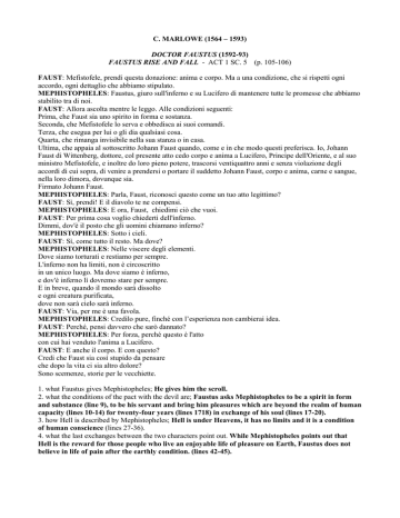 C. MARLOWE (1564 – 1593) DOCTOR FAUSTUS (1592-93) FAUSTUS RISE AND FALL - ACT 1 SC. 5 (p. 105-106) FAUST: Mefistofele, prendi questa donazione: anima e corpo. Ma a una condizione, che si rispetti ogni accordo, ogni dettaglio che abbiamo stipulato. MEPHISTOPHELES: Faustus, giuro sull'inferno e su Lucifero di mantenere tutte le promesse che abbiamo stabilito tra di noi. FAUST: Allora ascolta mentre le leggo. Alle condizioni seguenti: Prima, che Faust sia uno spirito in forma e sostanza. Seconda, che Mefistofele lo serva e obbedisca ai suoi comandi. Terza, che esegua per lui o gli dia qualsiasi cosa. Quarta, che rimanga invisibile nella sua stanza o in casa. Ultima, che appaia al sottoscritto Johann Faust quando, come e in che modo questi preferisca. Io, Johann Faust di Wittenberg, dottore, col presente atto cedo corpo e anima a Lucifero, Principe dell'Oriente, e al suo ministro Mefistofele, e inoltre do loro pieno potere, trascorsi ventiquattro anni e senza violazione degli accordi di cui sopra, di venire a prendersi o portare il suddetto Johann Faust, corpo e anima, carne e sangue, nella loro dimora, dovunque sia. Firmato Johann Faust. MEPHISTOPHELES: Parla, Faust, riconosci questo come un tuo atto legittimo? FAUST: Sì, prendi! E il diavolo te ne compensi. MEPHISTOPHELES: E ora, Faust, chiedimi ciò che vuoi. FAUST: Per prima cosa voglio chiederti dell'inferno. Dimmi, dov'è il posto che gli uomini chiamano inferno? MEPHISTOPHELES: Sotto i cieli. FAUST: Sì, come tutto il resto. Ma dove? MEPHISTOPHELES: Nelle viscere degli elementi. Dove siamo torturati e restiamo per sempre. L'inferno non ha limiti, non è circoscritto in un unico luogo. Ma dove siamo è inferno, e dov'è inferno lì dovremo stare per sempre. E in breve, quando il mondo sarà dissolto e ogni creatura purificata, dove non sarà cielo sarà inferno. FAUST: Via, per me è una favola. MEPHISTOPHELES: Credilo pure, finché con l’esperienza non cambierai idea. FAUST: Perché, pensi davvero che sarò dannato? MEPHISTOPHELES: Per forza, perché questo è l'atto con cui hai venduto l'anima a Lucifero. FAUST: E anche il corpo. E con questo? Credi che Faust sia così stupido da pensare che dopo la vita ci sia altro dolore? Sono scemenze, storie per le vecchiette. 1. what Faustus gives Mephistopheles; He gives him the scroll. 2. what the conditions of the pact with the devil are; Faustus asks Mephistopheles to be a spirit in form and substance (line 9), to be his servant and bring him pleasures which are beyond the realm of human capacity (lines 10-14) for twenty-four years (lines 1718) in exchange of his soul (lines 17-20). 3. how Hell is described by Mephistopheles; Hell is under Heavens, it has no limits and it is a condition of human conscience (lines 27-36). 4. what the last exchanges between the two characters point out. While Mephistopheles points out that Hell is the reward for those people who live an enjoyable life of pleasure on Earth, Faustus does not believe in life of pain after the earthly condition. (lines 42-45). THE CLOCK STRIKES - ACT 5 (p. 107) L 'orologio suona la mezz’ora Mezz’ora è scorsa; Presto sarà la fine! Oh Dio, se non vuoi perdonare la mia anima, per amore di Cristo che col suo sangue mi ha riscattato, fissa un termine almeno ai miei tormenti: Che Faust viva nell’inferno mille anni, centomila, ma infine possa salvarsi. Ah, non c'è termine per le anime dannate! Perché non sei un essere senza anima? Perché è immortale questa anima tua? Se la metempsicosi di Pitagora fosse vera, quest’anima volerebbe lontano da me e io sarei mutato in una bestia. Le bestie sono felici perché quando muoiono, le anime loro presto vengono sciolte in elementi! Ma la mia vivrà nel duro inferno. Maledizione ai genitori che mi hanno generato! No, maledici te, Faust, e Lucifero che ti ha privato delle gioie del cielo. Suona la mezzanotte Oh, suona, suona! Ora, corpo fatti aria, o ti trascina Lucifero all'inferno! Tuoni e lampi Anima, sciogliti in goccioline d’acqua e cadi nell'oceano, così scompari, Entrano i diavoli Dio, mio Dio, non guardarmi così! Vipere e serpenti fatemi respirare! Non aprirti, brutto Inferno! Non venire, Lucifero! Darò fuoco ai miei libri! Ah, Mefistofele! Escono i diavoli con Fausto Enter CHORUS. Entra il Coro. Cut is the branch that might have grown full straight, Spezzato è il ramo che poteva crescere dritto And burned is Apollo's laurel-bough, e bruciata la corona di Apollo That sometime grew within this learned man. che crebbe in questo sapiente. Faustus is gone: regard his hellish fall, Faust se n'è andato. Meditate la Sua caduta. Whose fiendful fortune may exhort the wise, La sua tragedia possa esortare i saggi Only to wonder at unlawful things, a una sacra paura delle cose illegali, Whose deepness doth entice such forward wits le cose profonde che attirano spiriti arditi To practice more than heavenly power permits. a esperire ciò che il cielo ha proibito. TEXT ANALYSIS Comprehension Answer the following questions. 1) What does Faustus do at the beginning of the passage? He speaks to himself and he hopes time may stop and midnight never come 2) What external event calls him back to reality? The clock which strikes the hours (line 11) 3) How long does Faustus still have to live? Only one hour 4) Whose help does he appeal for? He appeals to all terrestrial things in order to avoid his future eternal life in Hell 5) Does he really repent? No, he does not 6) Can you explain what Faustus means by his reference to Pythagoras' metempsychosis (line 42)? He wants to be transformed into an inferior beast in order to avoid eternal damnation 7) What does he do in line 49? He curses himself and Lucifer 8) Why does he say "I will burn my books"? He is ready to give up his knowledge by burning the books about magic arts, but it is too late. 9) Does Faustus save his soul after all? No, he does not. In the last part of his soliloquy Faustus regrets being a man because he cannot avoid damna