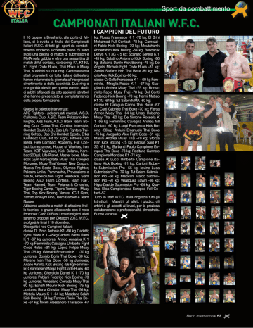 Sport da combattimento CAMPIONATI ITALIANI W.F.C. i campioni del futuro Il 16 giugno a Brugherio, alle porte di Milano, si è svolta la finale dei Campionati Italiani W.F.C. di tutti gli sport da combattimento moderno a contatto pieno. Si sono svolti una decina di match di submission e MMA nella gabbia e oltre una sessantina di match di full contact, kickboxing, K1, K13G, K1 Fight Code Rules, Thai Boxe e Muay Thai, suddivisi su due ring. Centosessanta atleti provenienti da tutta Italia e dall’estero hanno infiammato la giornata all’insegna del divertimento e della sportività. Due ring e una gabbia allestiti per questo evento, dodici arbitri affiancati da otto aspiranti istruttori che hanno presenziato a completamento della propria formazione. Queste le palestre intervenute: AFG Fighters – palestra arti marziali, A.S.D. California Club, A.S.D. Team Polizzano-Perlungher, Ares Team, A.S.D. Black Team, Boxing Club, Cobra Thai, Combat Interstyle, Combat Soul A.S.D., Dao Life Fighters Training School, Dao Shi Combat Sports, Erba Kombact Club, Fit for Fight, FitnessClub Biella, Free Combact Academy, Full Contact Lumezzanese, House of Warriors, Iron Team, KBT Vigevano, Kick Bellano, Kombact200gal, Life Planet, Master boxe, Meesook Gym Garbagnate, Muay Thai Cologno Monzese, Muay Thai Varese, New Dragon, Nuova Pro Sesto Boxe, Olympo Fighter, Palestra Unika, Pammachia, Prevenzione e Salute, Proevolution Fight, Renbukai, Siam Boxing ASD, Team Cortese, Team Fae’, Team Hamed, Team Petarra & Orvasha, Tiger Boxing Camp, Tiger’s Temple – Muay Thai, Top Kick Boxing, Versus, XC-1 Gym, YamabushiGym Rho, Team Barbieri e Team Nasser. Abbiamo assistito a match di altissimo livello tecnico, e grazie all’accordo con il noto Promoter Carlo Di Blasi i nostri migliori atleti saranno proposti per Oktagon 2013. W.F.C. svolgerà le finali il 18 dicembre. Di seguito i neo Campioni Italiani: classe D: Pinto Antonio K1 -60 kg Cadetti; Vyntu Viorel K 1 -45kg Cadetti; Batita Rami K 1 -67 kg Juniores; Amico Annalisa K 1 -70 kg Femminile; Castagna Umberto Fight Code Rules +91 kg; Lopez Felipe Muay Thai -75 kg; Grimaldi Emanuele K 1 -70 kg Juniores; Bosisio Boris Thai Boxe -60 kg; Merene Ivan Thai Boxe -56 kg Juniores; Ariano Aminta Kick Boxing -56 kg Femminile; Osama Ben Marga Fight Code Rules -60 kg Juniores; Ghercioiu Daniel K 1 -70 kg Juniores; Pubiani Federico Kick Boxing -70 kg Juniores; Veneziano Corrado Muay Thai 60 kg; Echaffi Mounir Kick Boxing -75 kg Juniores; Bona Christian Muay Thai -56 kg; Mottola Mauro K 1 -64 kg; Maadane Salah Kick Boxing -64 kg; Perrone Flavio Thai Boxe -67 kg; Nicelli Alessandro Thai Boxe -67 kg; Russo Francesco K 1 -70 kg; El Brini Mohamed Full Contact -78 kg, Camozzini Fabio Kick Boxing -70 kg; Moutaharrik Abderrahim Kick Boxing -64 kg; Bondaruk Denys K 1 3G -75 kg; Scarano Serena K 1 -45 kg; Salatino Antonino Kick Boxing -86 kg; Balsania Danilo Kick Boxing -75 kg; De Angelis Michele Fight Code Rules -81 kg; Zardini Stefano Irish Thai Boxe -81 kg; Negria Alex Kick Boxing -86 kg; classe C: Gollo Francesca K 1 – 60 kg Femminile, Miraglia Rocco K 1 -67 kg, Guagliardo Andrea Muay Thai -75 kg; Romaniello Fabio Muay Thai -70 kg; Del Conti Federico Kick Boxing -70 kg; Nanni Matteo K1 3G -64 kg; Tut Salem MMA -60 kg; classe B: Catagua Carlos Thai Boxe -67 kg; Curti Gabriele Thai Boxe -70 kg; Fjerca Armen Muay Thai -64 kg; Urraci Roberto Muay Thai -60 kg; De Simone Rossella K 1 -56 kg Femminile; Cavagna Andrea full Contact -60 kg; Lungi Francesca Kick Boxing -56kg; Arduini Emanuele Thai Boxe -75 kg; Avogadro Alex Fight Code -61 kg; Masini Andrea Muay Thai -70 kg; Sforza Ivan Kick Boxing -75 kg; Bechari Said K1 3G -81 kg; Barbanti Paolo Campione Europeo Thai Boxe -73 kg; Rositano Carmelo Campione Mondiale K1 -71 kg; classe A: Lucci Umberto Campione Italiano Kick Boxing -91 kg; Carioni Roberta Submission Pro -55 kg; Iovine Luca Submission Pro -70 kg; Tut Salem Submission Pro -60 kg; Maiocchi Marco Submission Pro -91 kg; Velasquez Edwin -86 kg; Nigro Davide Submission Pro -64 kg; Qualizza Elisa Campionessa Europea Full Cotact -57. Tutto lo staff W.F.C. Italia ringrazia tutti gli Istruttori, i Maestri, gli atleti, i giudici, gli arbitri e gli addetti ai lavori, per la preziosa collaborazione e professionalità dimostrata. Buone vacanze. Budo International 53 Sport da combattimento CAMPIONATI ITALIANI di light I10 giugno, Sesto San Giovanni, in provincia di Milano, questa è stata la location scelta per lo svolgimento delle finali dei Campionati Italiani W.F.C. Di tutti gli Sport da Combattimento Moderno a contatto leggero. Sei tatami e una gabbia, oltre 400 atleti provenienti da tutta Italia, 21 arbitri, e una decina aspiranti Istruttori, che hanno affiancato i direttori di gara, per completare la loro formazione. Una festa di colori delle divise dei vari club, all’insegna dello Sport, Lealtà e Amicizia. Queste le palestre intervenute: A.S.D Califor- nia Club, Accademia Europea, Ares Team Pammachia, ASD Black-Team, Black Fighters/Iron Gym, Boxe Chiuro - Fight Club, Boxe Lion, Brianza Fighting, Bulldog Gym, Centro Sportivo Kickboxer, Cobra Thai, Combat Interstyle, Dao Life Fighter Training School, Dragons Academy 88, Fight Gym Club, Fighters Club Capriolo, Fighters Club Fontanella, Figth Club Team di Limbiate, Fitness Club Biella, Free Combat Academy, Fujiyama, Full Contact Lumezzanese, Iron Team, Kamfsportcenter, Kankudojo, KBT Vigevano, Ki Do Riu Kfc, Kick Bellano, Kick Boxing Savate Savona, Kick Boxing Team Cambiago – Club, Kb Kombat2000gal, Molonlabe, Nuova Pro Sesto Boxe, Palestra Di Arte Marziale, Palestra Unika, Pro Evolution Fight, Pro Forma, Reactive Club, Real Combat, Ronin, Team Cherchi, Team Cortese, Team Faè, Team Gandini, Team Predator Kfm, Team Reale, Team Roveda, Team Ruggiero, Team Som, Team Triani, Tiger’s Temple Muay Thai, Twin’s Fighters, Versus, Warriors School, YamabushiGym Rho, Yoseikan Budo Milano e Zeus Team Pammachia. Free Boxing Light Maschile - 65kg