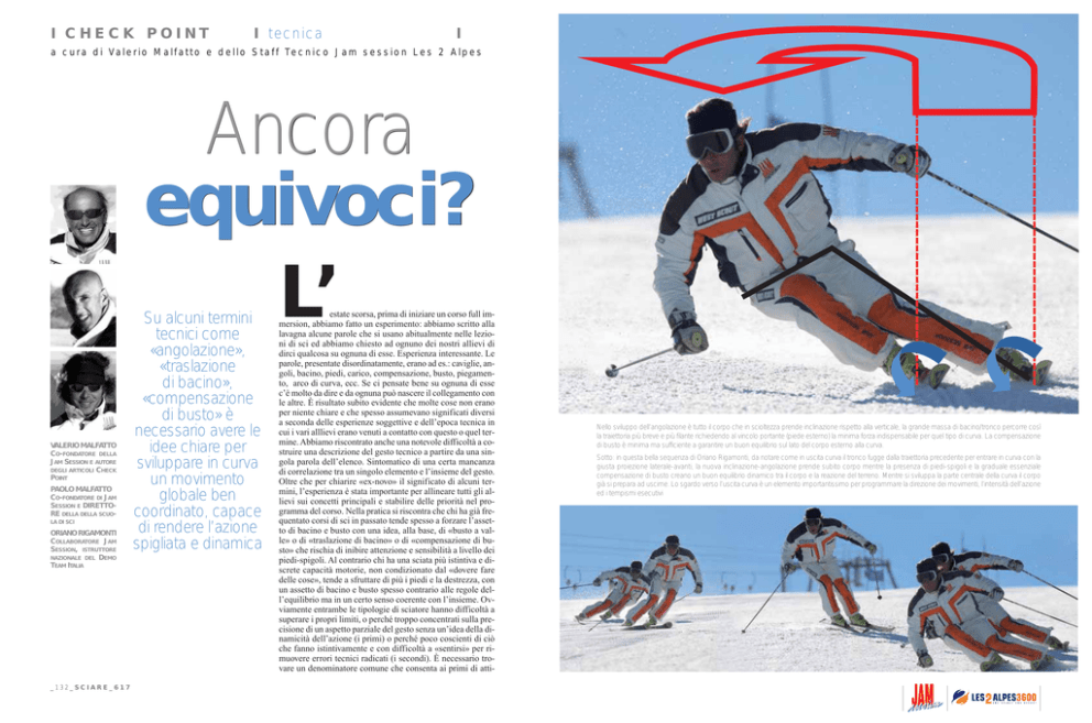 I CHECK POINT I tecnica I a c u r a d i V a l e r i o M a l f a t t o e d e l l o S t a f f Te c n i c o J a m s e s s i o n L e s 2 A l p e s Ancora equivoci? L’ VALERIO MALFATTO CO-FONDATORE DELLA JAM SESSION E AUTORE DEGLI ARTICOLI CHECK POINT PAOLO MALFATTO CO-FONDATORE DI JAM SESSION E DIRETTORE DELLA DELLA SCUOLA DI SCI ORIANO RIGAMONTI COLLABORATORE JAM SESSION, ISTRUTTORE NAZIONALE DEL DEMO TEAM ITALIA _132_SCIARE_617 Su alcuni termini tecnici come «angolazione», «traslazione di bacino», «compensazione di busto» è necessario avere le idee chiare per sviluppare in curva un movimento globale ben coordinato, capace di rendere l’azione spigliata e dinamica estate scorsa, prima di iniziare un corso full immersion, abbiamo fatto un esperimento: abbiamo scritto alla lavagna alcune parole che si usano abitualmente nelle lezioni di sci ed abbiamo chiesto ad ognuno dei nostri allievi di dirci qualcosa su ognuna di esse. Esperienza interessante. Le parole, presentate disordinatamente, erano ad es.: caviglie, angoli, bacino, piedi, carico, compensazione, busto, piegamento, arco di curva, ecc. Se ci pensate bene su ognuna di esse c’è molto da dire e da ognuna può nascere il collegamento con le altre. È risultato subito evidente che molte cose non erano per niente chiare e che spesso assumevano significati diversi a seconda delle esperienze soggettive e dell’epoca tecnica in cui i vari alllievi erano venuti a contatto con questo o quel termine. Abbiamo riscontrato anche una notevole difficoltà a costruire una descrizione del gesto tecnico a partire da una singola parola dell’elenco. Sintomatico di una certa mancanza di correlazione tra un singolo elemento e l’insieme del gesto. Oltre che per chiarire «ex-novo» il significato di alcuni termini, l’esperienza è stata importante per allineare tutti gli allievi sui concetti principali e stabilire delle priorità nel programma del corso. Nella pratica si riscontra che chi ha già frequentato corsi di sci in passato tende spesso a forzare l’assetto di bacino e busto con una idea, alla base, di «busto a valle» o di «traslazione di bacino» o di «compensazione di busto» che rischia di inibire attenzione e sensibilità a livello dei piedi-spigoli. Al contrario chi ha una sciata più istintiva e discrete capacità motorie, non condizionato dal «dovere fare delle cose», tende a sfruttare di più i piedi e la destrezza, con un assetto di bacino e busto spesso contrario alle regole dell’equilibrio ma in un certo senso coerente con l’insieme. Ovviamente entrambe le tipologie di sciatore hanno difficoltà a superare i propri limiti, o perché troppo concentrati sulla precisione di un aspetto parziale del gesto senza un’idea della dinamicità dell’azione (i primi) o perché poco coscienti di ciò che fanno istintivamente e con difficoltà a «sentirsi» per rimuovere errori tecnici radicati (i secondi). È necessario trovare un denominatore comune che consenta ai primi di atti- Nello sviluppo dell’angolazione è tutto il corpo che in scioltezza prende inclinazione rispetto alla verticale, la grande massa di bacino/tronco percorre così la traiettoria più breve e più filante richiedendo al vincolo portante (piede esterno) la minima forza indispensabile per quel tipo di curva. La compensazione di busto è minima ma sufficiente a garantire un buon equilibrio sul lato del corpo esterno alla curva. Sotto: in questa bella sequenza di Oriano Rigamonti, da notare come in uscita curva il tronco fugge dalla traiettoria precedente per entrare in curva con la giusta proiezione laterale-avanti, la nuova inclinazione-angolazione prende subito corpo mentre la presenza di piedi-spigoli e la graduale essenziale compensazione di busto creano un buon equilibrio dinamico tra il corpo e la reazione del terreno. Mentre si sviluppa la parte centrale della curva il corpo già si prepara ad uscirne. Lo sgardo verso l’uscita curva è un elemento importantissimo per programmare la direzione dei movimenti, l’intensità dell’azione ed i tempismi esecutivi I CHECK POINT Grandi sterzate con i piedi e forte controrotazione di bacino/busto sono gli elementi di gran lunga prevalenti, caratteristici di una sciata forzata che sviluppa una «finta» e faticosa angolazione I tecnica I Buona la confidenza con l’inclinazione del corpo e con la presa di spigolo ma lo scarso controllo della rotazione del busto e dell’assetto delle spalle non permettono di anticipare in uscita la proiezione verso la nuova curva Imitazione che enfatizza l’errore classico di chi comincia a saper condurre ma che interpreta l’angolazione come una esasperata compensazione di busto anziché come forte inclinazione generale del corpo con una più moderata e graduale compensazione. La massa bacino/busto percorre una traiettoria inutilmente lunga e blocca lo sviluppo dell’angolazione impedendo allo sciatore di chiudere la curva ed obbligandolo a prolungarla in forte passività Grande e poco utile lavoro di spigolo, di piegamento sulla caviglia esterna e di ricerca di rotazione del bacino, la paura a spostare il tronco verso l’interno della curva porta allo sviluppo di un gran movimento verticale anziché laterale L’inclinazione del corpo verso l’intenro della curva è «tirata» da una forte rotazione delle spalle che impedisce il controllo degli spigoli, i piedi fanno poco mentre le spalle fanno troppo vare un’azione globale più coordinata, meno cavillosa e meno “preoccupata”, ed ai secondi di acquisire maggiore consapevolezza dei propri movimenti per trasformarli in positivo sfruttando le buone capacità motorie. La comprensione senza equivoci del movimento di angolazione è fondamentale e la ricerca di scioltezza e compattezza in questo movimento è il denominatore comune a cui fare riferimento. La cosa più importante è comprendere che l’angolazione è l’inclinazione di tutto il corpo verso l’interno della curva e che in una serie di curve 