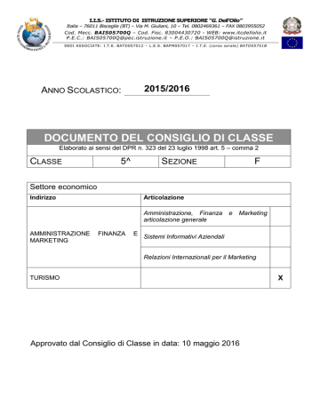 I.I.S.- ISTITUTO DI ISTRUZIONE SUPERIORE “G. Dell’Olio” Italia – 76011 Bisceglie (BT) – Via M. Giuliani, 10 – Tel. 0802469361 – FAX 0803955052 Cod. Mecc. BAIS05700Q – Cod. Fisc. 83004430720 - WEB: www.itcdellolio.it P.E.C.: [email protected] – P.E.O.: [email protected] SEDI ASSOCIATE: I.T.E. BATD057012 – L.E.S. BAPM057017 – I.T.E. (corso serale) BATD05751B ANNO SCOLASTICO: 2015/2016 DOCUMENTO DEL CONSIGLIO DI CLASSE Elaborato ai sensi del DPR n. 323 del 23 luglio 1998 art. 5 – comma 2 CLASSE 5^ SEZIONE F Settore economico Indirizzo Articolazione Amministrazione, Finanza articolazione generale AMMINISTRAZIONE MARKETING FINANZA e Marketing E Sistemi Informativi Aziendali Relazioni Internazionali per il Marketing TURISMO Approvato dal Consiglio di Classe in data: 10 maggio 2016 X I S TI TU TO T E CNI CO E C ONO MI CO S TA T ALE “Giacinto Dell’Olio” – Bisceglie (BT) INDICE 1. Presentazione del profilo professionale dell’indirizzo di studi pag. 3 2. Piano di studi pag. 4 3. Risultati di apprendimento secondo biennio e quinto anno pag. 5 4. Obiettivi formativi generali pag. 8 5. Profilo della classe pag. 9 6. Attività formative nel triennio pag. 11 7. Prospetto numerico riassuntivo del triennio pag. 13 8. Composizione del Consiglio di classe pag. 14 9. Piano di sviluppo delle discipline pag. 15 10. Metodologia didattiche e strumenti adoperati pag. 27 11. Criteri di valutazione pag. 28 12. Simulazione delle prove d’esame pag. 29 13. Elenco allegati pag. 30 14. Delibera di approvazione del Documento pag. 31 15. Allegati Pag. 33 I S TI TU TO T E CNI CO E C ONO MI CO S TA T ALE “Giacinto Dell’Olio” – Bisceglie (BT) Pag. 3/39 1. Presentazione del profilo professionale dell’indirizzo di studi Turismo Il diplomato nel “Turismo” ha competenze specifiche nell’ambito della gestione delle imprese del settore turistico relativamente agli aspetti organizzativi, amministrativi, contabili e commerciali. Ha, inoltre, competenze generali nell’ambito dei macrofenomeni socio-economici, nazionali e internazionali, della normativa civilistica e fiscale, dei sistemi aziendali. Interviene nella valorizzazione integrata e sostenibile del patrimonio culturale, artistico, artigianale, enogastonomico, paesaggistico ed ambientale, integrando le competenze professionali specifiche con quelle linguistiche. I S TI TU TO T E CNI CO E C ONO MI CO S TA T ALE “Giacinto Dell’Olio” – Bisceglie (BT) Pag. 4/39 2. Piano di studi – Indirizzo TURISMO 2.1. Quadro orario del PRIMO BIENNIO ORARIO DISCIPLINE DI STUDIO Religione cattolica o attività alternative Lingua e letteratura italiana Storia Prima lingua straniera: lingua inglese Seconda lingua straniera Matematica Scienze integrate (Biologia) Scienze integrate (Fisica) Scienze integrate (Chimica) Economia aziendale Informatica Geografia Diritto ed Economia Educazione fisica TOTALE ORE SETTIMANALI I II 1 4 2 3 3 4 2 2 --2 2 3 2 2 32 1 4 2 3 3 4 2 --2 2 2 3 2 2 32 2.2. Quadro orario del SECONDO BIENNIO e della CLASSE QUINTA DISCIPLINE DI STUDIO Religione cattolica o attività alternative Lingua e letteratura italiana Storia Prima lingua straniera: lingua inglese Seconda lingua straniera Terza lingua straniera Matematica Geografia Turistica Dirittto e Legislazione Turistica Discipline Turistiche e Aziendali Arte e territorio Educazione Fisica TOTALE ORE SETTIMANALI III ORARIO IV V 1 4 2 3 3 3 3 2 3 4 2 2 32 1 4 2 3 3 3 3 2 3 4 2 2 32 1 4 2 3 3 3 3 2 3 4 2 2 32 I S TI TU TO T E CNI CO E C ONO MI CO S TA T ALE “Giacinto Dell’Olio” – Bisceglie (BT) Pag. 5/39 3. Risultati di apprendimento secondo biennio e quinto anno 3.1. Risultati di apprendimento secondo biennio e quinto anno – Area generale Area Generale (Direttiva MIUR 4 del 16 gennaio 2012) ISTITUTO TECNICO SETTORE ECONOMICO Indirizzo TURISMO Individuare e utilizzare gli strumenti di comunicazione e di team working più appropriati per intervenire nei contesti organizzativi e professionali di riferimento Lingua e letteratura italiana Redigere relazioni tecniche e documentare le attività individuali e di gruppo relative a situazioni professionali Utilizzare gli strumenti culturali e metodologici per porsi con atteggiamento razionale, critico e responsabile di fronte alla realtà, ai suoi fenomeni, ai suoi problemi, anche ai fini dell’apprendimento permanente Correlare la conoscenza storica generale agli sviluppi delle scienze, delle tecnologie e delle tecniche negli specifici campi professionali di riferimento Storia Riconoscere gli aspetti geografici, ecologici, territoriali dell’ambiente naturale ed antropico, le connessioni con le strutture demografiche, economiche, sociali, culturali e le trasformazioni intervenute nel corso del tempo Progettare, documentare e presentare servizi o prodotti turistici Utilizzare e produrre strumenti di comunicazione visiva e multimediale, anche in riferimento alle strategie espressive e agli strumenti tecnici della comunicazione in rete. Lingua Inglese Padroneggiare la lingua inglese e, ove prevista, un’altra lingua comunitaria, per scopi comunicativi e utilizzare i linguaggi settoriali relativi ai percorsi di studio, per interagire in diversi ambiti e contesti professionali, al livello B2 del quadro comune europeo di riferimento per le lingue (QCER) Utilizzare il sistema delle comunicazioni e delle relazioni delle imprese turistiche Utilizzare il linguaggio e i metodi propri della matematica per organizzare e valutare adeguatamente informazioni qualitative e quantitative Matematica Utilizzare le strategie del pensiero razionale negli aspetti dialettici e algoritmici per affrontare situazioni problematiche, elaborando opportune soluzioni Utilizzare le reti e gli strumenti informatici nelle attività di studio, ricerca e approfondimento disciplinare Correlare la conoscenza storica generale agli sviluppi delle scienze, delle tecnologie e delle tecniche negli specifici campi professionali di riferimento Padroneggiare la 