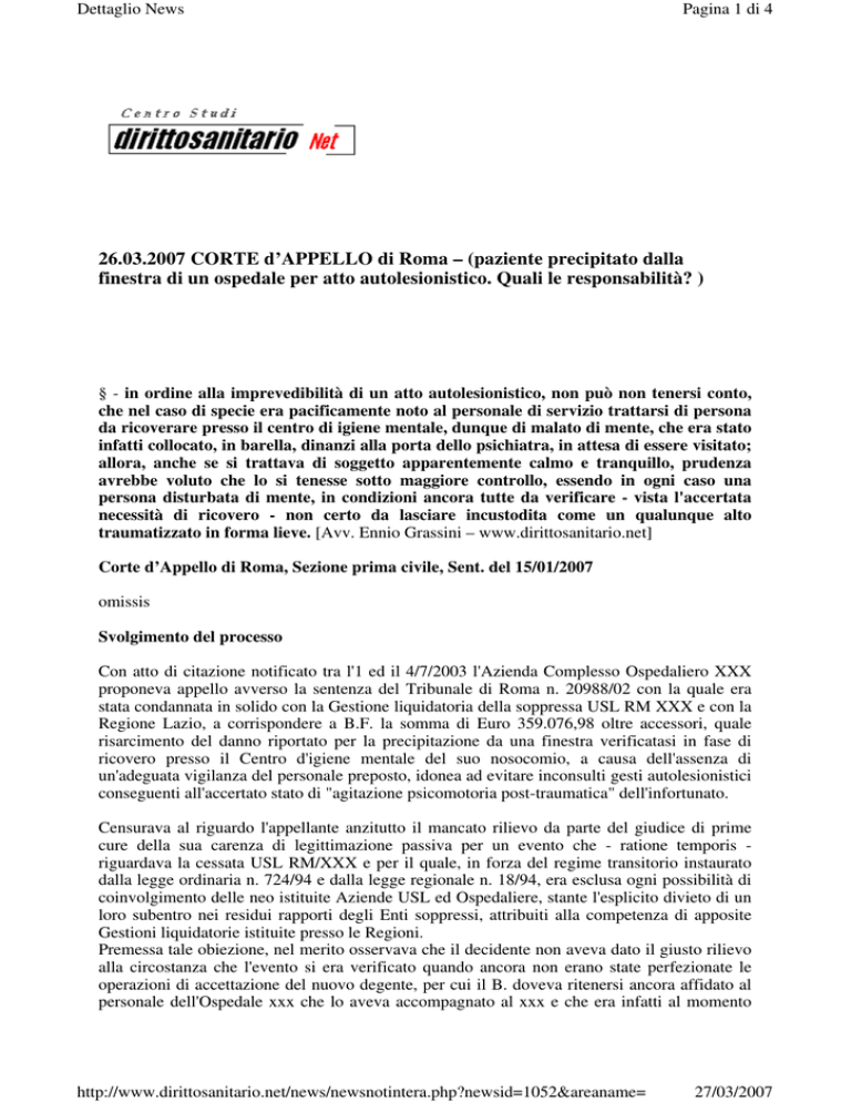 Dettaglio News Pagina 1 di 4 26.03.2007 CORTE d’APPELLO di Roma – (paziente precipitato dalla finestra di un ospedale per atto autolesionistico. Quali le responsabilità? ) § - in ordine alla imprevedibilità di un atto autolesionistico, non può non tenersi conto, che nel caso di specie era pacificamente noto al personale di servizio trattarsi di persona da ricoverare presso il centro di igiene mentale, dunque di malato di mente, che era stato infatti collocato, in barella, dinanzi alla porta dello psichiatra, in attesa di essere visitato; allora, anche se si trattava di soggetto apparentemente calmo e tranquillo, prudenza avrebbe voluto che lo si tenesse sotto maggiore controllo, essendo in ogni caso una persona disturbata di mente, in condizioni ancora tutte da verificare - vista l'accertata necessità di ricovero - non certo da lasciare incustodita come un qualunque alto traumatizzato in forma lieve. [Avv. Ennio Grassini – www.dirittosanitario.net] Corte d’Appello di Roma, Sezione prima civile, Sent. del 15/01/2007 omissis Svolgimento del processo Con atto di citazione notificato tra l'1 ed il 4/7/2003 l'Azienda Complesso Ospedaliero XXX proponeva appello avverso la sentenza del Tribunale di Roma n. 20988/02 con la quale era stata condannata in solido con la Gestione liquidatoria della soppressa USL RM XXX e con la Regione Lazio, a corrispondere a B.F. la somma di Euro 359.076,98 oltre accessori, quale risarcimento del danno riportato per la precipitazione da una finestra verificatasi in fase di ricovero presso il Centro d'igiene mentale del suo nosocomio, a causa dell'assenza di un'adeguata vigilanza del personale preposto, idonea ad evitare inconsulti gesti autolesionistici conseguenti all'accertato stato di "agitazione psicomotoria post-traumatica" dell'infortunato. Censurava al riguardo l'appellante anzitutto il mancato rilievo da parte del giudice di prime cure della sua carenza di legittimazione passiva per un evento che - ratione temporis riguardava la cessata USL RM/XXX e per il quale, in forza del regime transitorio instaurato dalla legge ordinaria n. 724/94 e dalla legge regionale n. 18/94, era esclusa ogni possibilità di coinvolgimento delle neo istituite Aziende USL ed Ospedaliere, stante l'esplicito divieto di un loro subentro nei residui rapporti degli Enti soppressi, attribuiti alla competenza di apposite Gestioni liquidatorie istituite presso le Regioni. Premessa tale obiezione, nel merito osservava che il decidente non aveva dato il giusto rilievo alla circostanza che l'evento si era verificato quando ancora non erano state perfezionate le operazioni di accettazione del nuovo degente, per cui il B. doveva ritenersi ancora affidato al personale dell'Ospedale xxx che lo aveva accompagnato al xxx e che era infatti al momento http://www.dirittosanitario.net/news/newsnotintera.php?newsid=1052&areaname= 27/03/2007 Dettaglio News Pagina 2 di 4 presente sul posto, donde - anche sotto questo profilo - l'estraneità della sua struttura alle responsabilità per quanto occorso. Da ultimo poi obiettava che si sarebbe dovuto tener conto della repentinità ed imprevedibilità del gesto del B., così da indurre ad escludere ogni possibilità di intervento degli addetti alla vigilanza, in una situazione assimilabile all'esimente del caso fortuito o della forza maggiore. Per questo, riforma della decisione di primo grado con esclusione di ogni addebito nei suoi confronti ed il favore delle spese di entrambi i gradi di giudizio. Si costituiva in giudizio l'Azienda Unità Sanitaria Locale Roma XXX che, sull'erroneo presupposto di essere stata anch'essa condannata in solido con la Gestione Liquidatoria della soppressa USL RM/XXX e la Regione Lazio al risarcimento in favore del B., proponeva appello avverso la pronuncia del Tribunale, eccependo la sua carenza di legittimazione passiva in forza dell'estraneità ex lege delle nuove ASL ai rapporti delle cessate USL, cui erano succedute le citate Gestioni liquidatorie appositamente istituite nell'ambito delle Regioni; nel merito poi ribadiva la tesi - peraltro già fatta propria dal giudice di primo grado - circa la responsabilità esclusiva dell'Ospedale xxx nella cui struttura si era verificato l'evento lesivo. Anche la Gestione Liquidatrice delle soppresse USL RM/XXX e RM/XXX si costituiva per sottolineare l'assenza di responsabilità del personale dell'Ospedale xxx per un evento del tutto imprevedibile, laddove nulla poteva far presagire l'attuazione di gesti inconsulti da parte di un malato bisognoso "...si di cure psichiatriche, ma tranquillo, lucido e consapevole...", ma non di una particolare attenzione, anche perché dalla certificazione medica che lo accompagnava, non era dato desumere una grave sindrome psicopatologica in atto; la vigilanza adottata era quindi quella tipica di una situazione ordinaria, per cui nessun addebito di negligenza o imprudenza poteva essere mosso al personale dell'Ospedale, donde la richiesta in via incidentale di integrale riforma della sentenza impugnata. Anche la Regione Lazio insorgeva contro la decisione di primo grado, eccependo la propria carenza di legittimazione passiva dinanzi alla esistenza di un'apposita gestione stralcio delle pendenze delle pregresse USL, soggettivamente autonoma e distinta dalle nuove ASL, dotata altresì ex lege di soggettività processuale e sostanziale nella persona del Commissario liquidatore, estraneo a questi fini - all'istituto regionale. Nel merito poi si allineava alle posizioni degli altri appellati circa l'addebitabilità del sinistro "...esclusivamente all'assurda condotta del paziente il quale, in un momento di inopinata ed imprevedibile crisi psichica, eludeva la sorveglianza e si gettava da una finestra..."; da ciò, appello incidentale per la riforma della decisione, da correggere dunque sia per la carenza della sua legittimazione passiva sia, nel merito, per l'assenza di responsabilità di alcuno per l'accaduto. Anche il B. interveniva per rilevar