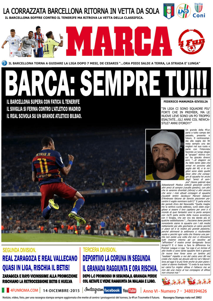 IL BARCELLONA SOFFRE CONTRO IL TENERIFE MA RITROVA LA VETTA DELLA CLASSIFICA. IL BARCELLONA TORNA A GUIDARE LA LIGA DOPO 7 MESI, DE CESARIS “...ORA PIEDI SALDI A TERRA, LA STRADA E’ LUNGA” FEDERICO MANUNZA-SIVIGLIA “IN LIGA CI SONO SQUADRE PIU’ FORTI CHE IN PREMIER, MA LE NUOVE LEVE SONO UN PO TROPPO ESALTATE...GLI ANNI COL NEWCASTLE? ANNI D’ORO!!!” Un grande della 4Fun parla a tutto campo del passato, presente e futuro. Il centrocampista alla soglia dei 40 resta sempre uno dei migliori nel suo ruolo e parte con l’intervista facendo un lungo elogio al “gruppo” storico con cui ha giocato diversi anni “...di stagioni ne ho fatto tante dato che ormai mi avvicino alla soglia dei 40, e le migliori sono state quelle dove oltre che compagni di squadra ho avuto degli "amici di sempre" (leone gabrieli Apa Sebastianelli Modica votto)e giocando contro altri amici di sempre (vavalle pandini), con altri che lo saranno diventati (sforza) e altri ancora che sono i miei attuali compagni di squadra (lucatelli lentini Iacobucci Marrani babusci D'Ambrosio falcone de Sanctis piscionieri piacentini li voglio nominare tutti!!)” E parla anche dei periodi d’oro del Newcastle “Quella maglia me la sentivo cucita addosso, sono stato orgo- glioso si essere il loro capitano per anni e il ricordo di quei fantastici anni lo porto sempre con me”E parla anche della nuova avventura con il Siviglia, che per ora sta dando più di qualche soddisfazione:”...Facciamo bene perché nonostante siamo la squadra con l età media nettamente più alta giochiamo al calcio perché ci piace ed è la nostra più grande passione, perché altrimenti la settimana ci risulterebbe vuota e perché ogni volta che finiamo una partita non esiste una volta che non ci ritroviamo tutti insieme intorno ad un tavolino ad "affrontare" il nostro ormai famigerato 'terzo tempo'!!! E ci tiene a fare la differenza tra Premier League e Liga “La Liga è un torneo di alto livello ci sono tante squadre forti e giovani (le nuove leve forse sono un tantino più "esaltate" rispetto a noi del calcio anni 80 ma credo che molto sia dovuto alle tv) ed il Barcellona ad oggi è la più forte anche se pian piano i valori si stanno livellando “ E svela la sua teoria sul calcio“La miglior difesa è l'attacco ma se non dai una mano al tuo compagno di difesa non vincerai mai “ secondi in classifica permette al boemo di staccare il Vaduz, ultimo, di punti e andare alla pausa invernale all'8° p Ultimo atto della Liga, no ancora no...ma alla 7°giornata, tra recuperi e anticipi, tra promozioni e retrocessioni alle porte, bisogna tirare il primo punto della stagione. E si perché nelle classifiche qualcosa sta di nuov cambiando, almeno in questa stagione. E difatti ritornato il momento de Barcellona, che ritorna protagonista del campionato, e grazie alla vittor sofferta col Tenerife, ritrova il primo posto. Il primo posto del Barcellona è arrivato anche in concomitanza di fortunati eventi, come il pari a sorpresa del Siviglia, fermato da un’orgoglioso Atletico Madrid, ma anche ko del Real Madrid superato da un Atletico Bilbao davvero brillante. Se nella testa della Liga c’è bagarre, nella coda le cose stanno decisamen te peggio. L’Atletico Madrid trova un punto che fa morale ma per centra re la salvezza, ci vuole un mezzo miracolo. Più in gioco sono le possib lità di Altetico Bilbao, Maiorca e Elche, con la Roja che è riuscita ad im porsi con il Real Madrid grazie soprattutto ad un bel gioco, che ha rida di certo un entusiasmo importante per centrare una salvezza, fino a qualche giornata fa, davvero insperata. Spostando gli occhi nella Segunda resta tutto ancora in alto mare, con un campionato che accoglie con grande entusiasmo le new entry Hercules e Real Valladolid, ma ch non da ancora certezze. Unica forse è quella della testa della classifica dove il Real Zaragoza e Rayo Vallecano, per il gioco fatto vedere fino a ora, sembrano più pronte rispetto alle altre, ad andare a giocarsi in Lig Solo in Tercera arriva il primo verdetto stagionale, la promozione del D portivo La Coruna di Pisicchio è davvero meritata, i ragazzi 4 e o vo el ria a il e nabimato e he a ad ga. De- PER LA TERZA STAGIONE CONSECUTIVA, IL BARCA CONTINUA A VOLARE NELLA LIGA PRIMO PUNTO PER I COLCHONEROS,FERMATO IL SIVIGLIA!!; IL BARCA DOPO UN’ANNO E’ DI NUOVO IN FUGA!; IL BILBAO FERMA IL REAL. M! IL BARCELLONA SOFFRE MA NON PERDE DI VISTA LA VETTA DELLA LIGA, DE CESARI E FIORNI AFFONDANO UN OTTIMO TENERIFE; L’AT. MADRID FESTEGGIA IL 1° PUNTO, CONTRO IL GRANDE SIVIGLIA; NON BASTA GESMUNDO, BILBAO TRASCINATO DA MARIOTTI DA SPETTACOLO. Il Barcellona soffre ma non perde. Quando i blaugrana non risultano al top le inseguitrici non ne approfittano. Il Tenerife, forse la squadra più altalenante del torneo, riesce nella titanica impresa di impensierire Tozzi e, al tempo stesso, non subire troppo le folate offensive degli uomini di Luis Enrique. Scusate, sulla panchina del Barca c'è Luis D'Alessio. Errata corrige. De Cesaris e Fiorini (avvoltoio d'area di rigore con il fisico di Akinfenwa) piegano la resistenza del Tete. A nulla serve la prestazione maiuscola di Andrea Pandoli. Troppo nervoso il centrocampista, accusa la pressione. Non per questo però si tira indietro. In cabina di regia dà il via a qualsiasi azione del Tenerife. Peccato che lì davanti Giorgetti pensi troppo a se stesso e, quando ha la palla dell'uno a uno la spari alta. Avrebbe segnato anche Fabio Junior... Ancora Elche! Aggancio degli andalusi ai danni del Maiorca. Proprio nello scontro diretto per la salvezza, l'Elche decide di tirare fuori le unghie e prendersi con tutta la prepotenza possibile i tre punti. Lori e Santoloci ne hanno per tutti. Ora ci toccherà tagliare il pallone in due, visto il doppio hattrick. Ah no, non siamo in Premier, peccato! Non serve a nulla il miglior Hristov al Maiorca. Il suo, è il ruolo dell'attore non protagonista nella commedia degli avversari. Ser
