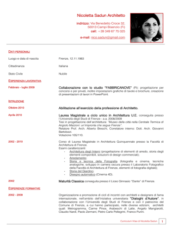 Nicoletta Sadun Architetto indirizzo: Via Benedetto Croce 32, 50013 Campi Bisenzio (Fi) cell: +39 349 67 75 025 e-mail: [email protected] DATI PERSONALI Luogo e data di nascita Firenze, 12.11.1983 Cittadinanza Italiana Stato Civile Nubile ESPERIENZA LAVORATIVA Febbraio - luglio 2009 Collaborazione con lo studio “FABBRICANOVE” (FI): progettazione per concorsi e per privati, inoltre impostazioni grafiche di tavole e brochure, creazione di presentazioni di lavori in PowerPoint. ISTRUZIONE Ottobre 2010 Abilitazione all’esercizio della professione di Architetto. Aprile 2010 Laurea Magistrale a ciclo unico in Architettura U.E. conseguita presso l’Università degli Studi di Firenze - a.a. 2008/2009 Tesi in progettazione dell’architettura: “Museo della città nella Centrale Termica di Angiolo Mazzoni: un’impronta che segue Firenze”. Relatore Prof. Arch. Alberto Breschi, Correlatore interno: Dott. Arch. Giovanni Bartolozzi. Votazione 105/110. 2002 - 2010 Corso di Laurea Magistrale in Architettura Quinquennale presso la Facoltà di Architettura di Firenze. Esami caratterizzanti: Architettura degli Interni (progettazione di elementi di arredo, storia degli elementi componibili, soluzioni di design commerciali); Arredamento; Storia e tecnica della Fotografia (fotografia e cinema, tecniche analogiche, sviluppo in camera oscura presso il Laboratorio Fotografico della Facoltà di Architettura di Firenze, elementi di fotografia digitale); Storia del Giardino; Disegno automatico (Cinema 4D). 2002 Maturità Classica conseguita presso il Liceo Ginnasio “Dante” di Firenze. ESPERIENZE FORMATIVE 2002 - 2009 Organizzazione e promozione di cicli di incontri con architetti e designers di fama internazionale, nell’ambito dell’iniziativa universitaria “Dialoghi d’Autore”, in collaborazione con l’Università degli Studi di Firenze e con il patrocinio del Comune di Firenze, a cui hanno partecipato, nelle diverse edizioni, architetti quali: Metrogramma, Carme Pinos, Arabeschi di Latte, Angelo Mangiarotti, Claudio Nardi, Paolo Zermani, Pietro Carlo Pellegrini, Franco Purini. Curriculum Vitae di Nicoletta Sadun 1 Ideazione e organizzazione del ciclo di incontri “Esperienze di ricerca nella Facoltà di Architettura”, svolto nel 2008, all’interno dei quali sono state affrontate alcune delle tematiche più attuali della ricerca in ambito architettonico (utilizzo innovativo dei materiali tradizionali, simulazione strutturale avanzata). Ideazione, conduzione e organizzazione logistica di numerose visite in luoghi privilegiati per l'approfondimento della passione e del gusto per l’architettura nella condivisione con amici e colleghi: A. Aalto a Riola, Bologna, 2009; Sulle tracce di Michelucci, 2009; Il villaggio di Monterinaldi di Ricci, 2005; Il museo di Castelvecchio, Verona; Biennale di Venezia, 2004 - 2006. Dicembre 2008 Partecipazione alla IX edizione del concorso internazionale per idee d’architettura “tra architettura e città”, con la presentazione di un progetto dal titolo: “Una chiatta sull’acqua: proposta di un elemento rappresentativo della città di Firenze sul fiume Arno”. Agosto 2008 Mostra del lavoro di rilievo del complesso del Santuario della Madonna del Sasso, all’interno delle celebrazioni per la ricorrenza de “La grande apparizione” della Madonna, Pontassieve (FI). Dicembre 2007 Viaggio di studio a Parigi, nel quale ho potuto approfondire la conoscenza di architetture studiate nell’ambito dell’esame di Storia dell'architettura II e Storia dell'architettura contemporanea (in particolare l’Art Nouveau, Jean Nouvel, Perret, Le Corbusier), e la passione per giardini e parchi (Parc Citroën, Parc de Bercy, Parc de la Villette, Jardin Atlantique). Luglio 2005 Proposta progettuale e presentazione alla cittadinanza all’interno di una mostra organizzata dal Comune di Pian di Scò (AR) di un complesso multifunzionale e residenziale in sostituzione di un’ampia area sportiva. Febbraio 2005 Ideazione, organizzazione e presentazione dell’incontro col prof. R. Filippetti “Giotto e l’avventura dello sguardo, viaggio multimediale attraverso la Cappella Scrovegni a Padova”, in collaborazione con ADL Club (Architecture Design and Landscape Club). Maggio 2004 Viaggio di studio: “Le Corbusier Tour”, nell’ambito del Laboratorio di Tecnologia dell’Architettura, prof A. Andreucci e C. Terpollili., P. Felli. (Marsiglia, La Tourette, Lione, Rochamp, Basilea, Zurigo, Como). ALTRE ESPERIENZE 2005 - attuale Graphic Design: progettazione e realizzazione di elementi grafici (manifesti, loghi, inviti, brochures) per cerimonie ed eventi (Festival della Creatività). 2003 - 2009 Organizzazione di corsi e seminari, tenuti anche personalmente, in preparazione al test d’ammissione alla Facoltà di Architettura, in collaborazione con l’Università degli Studi di Firenze. 2003 - 2007 Componente in qualità di soprano del Coro polifonico Fonè, riconosciuto dall’Università degli Studi di Firenze. Il coro è formato da giovani universitari, provenienti da ogni facoltà dell’Ateneo fiorentino, ed organizza incontri e serate culturali su numerosi temi, dal canto popolare italiano al gospel americano, al canto polifonico di contenuto religioso. Curriculum Vitae di Nicoletta Sadun 2 MADRELINGUA ITALIANO CONOSCENZE LINGUISTICHE INGLESE Lettura BUONO Scrittura BUONO Espressione orale SUFFICIENTE CONOSCENZE INFORMATICHE Pacchetto office Word Excel PowerPoint Outlook OTTIMA Autocad 2D Autocad 3D Modellazione e renderizzazione Cinema 4D Fotoritocco e impaginazione Photoshop CS4 Computo metrico/analisi prezzi PriMus - DCF OTTIMA CAPACITÀ E COMPETENZE Possiedo una buona capacità di relazionarmi con i colleghi, riuscendo a coordinare e amministrare le attività di studio e di progettazione (progetti di gruppo, seminari), connessa ad una naturale determinatezza e ad ottime capacità organizzative e metodologiche. INTERESSI E PASSIONI Storia dell’architettura, ar