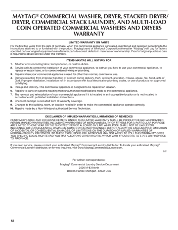 MAYTAG® COMMERCIAL WASHER, DRYER, STACKED DRYER/ DRYER, COMMERCIAL STACK LAUNDRY, AND MULTI-LOAD COIN OPERATED COMMERCIAL WASHERS AND DRYERS WARRANTY LIMITED WARRANTY ON PARTS For the first five years from the date of purchase, when this commercial appliance is installed, maintained and operated according to the instructions attached to or furnished with the product, Maytag brand of Whirlpool Corporation (thereafter “Maytag”) will pay for factory specified parts or original equipment manufacturer parts to correct defects in materials or workmanship. Proof of original purchase date is required to obtain service under this warranty. 1. 2. 3. 4. 5. 6. 7. 8. 9. 10. ITEMS MAYTAG WILL NOT PAY FOR All other costs including labor, transportation, or custom duties. Service calls to correct the installation of your commercial appliance, to instruct you how to use your commercial appliance, to replace or repair fuses, or to correct external wiring or plumbing. Repairs when your commercial appliance is used for other than normal, commercial use. Damage resulting from improper handling of product during delivery, theft, accident, alteration, misuse, abuse, fire, flood, acts of God, improper installation, installation not in accordance with local electrical or plumbing codes, or use of products not approved by Maytag. Pickup and Delivery. This commercial appliance is designed to be repaired on location. Repairs to parts or systems resulting from unauthorized modifications made to the commercial appliance. The removal and reinstallation of your commercial appliance if it is installed in an inaccessible location or is not installed in accordance with published installation instructions. Chemical damage is excluded from all warranty coverage. Changes to the building, room, or location needed in order to make the commercial appliance operate correctly. Repairs made by a Non-Whirlpool authorized Service Technician. DISCLAIMER OF IMPLIED WARRANTIES; LIMITATIONS OF REMEDIES CUSTOMER'S SOLE AND EXCLUSIVE REMEDY UNDER THIS LIMITED WARRANTY SHALL BE PRODUCT REPAIR AS PROVIDED HEREIN. IMPLIED WARRANTIES, INCLUDING WARRANTIES OF MERCHANTABILITY OR FITNESS FOR A PARTICULAR PURPOSE, ARE LIMITED TO ONE YEAR OR THE SHORTEST PERIOD ALLOWED BY LAW. WHIRLPOOL SHALL NOT BE LIABLE FOR INCIDENTAL OR CONSEQUENTIAL DAMAGES. SOME STATES AND PROVINCES DO NOT ALLOW THE EXCLUSION OR LIMITATION OF INCIDENTAL OR CONSEQUENTIAL DAMAGES, OR LIMITATIONS ON THE DURATION OF IMPLIED WARRANTIES OF MERCHANTABILITY OR FITNESS, SO THESE EXCLUSIONS OR LIMITATIONS MAY NOT APPLY TO YOU. THIS WARRANTY GIVES YOU SPECIFIC LEGAL RIGHTS AND YOU MAY ALSO HAVE OTHER RIGHTS, WHICH VARY FROM STATE TO STATE OR PROVINCE TO PROVINCE. If you need service, please contact your authorized Maytag® Commercial Laundry distributor. To locate your authorized Maytag® Commercial Laundry distributor, or for web inquiries, visit www.MaytagCommercialLaundry.com. 1/11 For written correspondence: Maytag® Commercial Laundry Service Department 2000 M-63 North Benton Harbor, Michigan 49022 USA 12 GARANTIE DE LAVE-LINGE, SÈCHE-LINGE, LAVE-LINGE ET SÈCHE-LINGE SUPERPOSÉS À USAGE COMMERCIAL, ENSEMBLE DE BUANDERIE SUPERPOSÉ À USAGE COMMERCIAL, ET LAVE-LINGE ET SÈCHE-LINGE À CHARGE MULTIPLE ET À USAGE COMMERCIAL PAYANTS MAYTAG® GARANTIE LIMITÉE SUR LES PIÈCES Pendant les cinq premières années à compter de la date d’achat, lorsque cet appareil ménager à usage commercial est installé, entretenu et utilisé conformément aux instructions jointes ou fournies avec le produit, la marque Maytag de Whirlpool Corporation (ci-après désignée “Maytag”) paiera pour les pièces spécifiées par l’usine ou pour les pièces originales du fabricant de l’équipement pour corriger tout vice de matériau ou de fabrication. Une preuve de la date d’achat d’origine est exigée pour obtenir un service dans le cadre de la présente garantie. MAYTAG NE PRENDRA PAS EN CHARGE : 1. Tout autre coût y compris la main-d’œuvre, le transport ou les droits de douane. 2. Les visites de service pour rectifier l’installation de l’appareil ménager à usage commercial, montrer à l’utilisateur comment utiliser l’appareil ménager à usage commercial, remplacer ou réparer des fusibles ou rectifier le câblage ou la plomberie du domicile. 3. Les réparations lorsque l’appareil ménager à usage commercial est utilisé à des fins autres qu’un usage commercial normal. 4. Les dommages imputables à : mauvaise manipulation du produit lors de la livraison, vol, accident, modification, usage impropre ou abusif, incendie, inondation, actes de Dieu, installation fautive ou installation non conforme aux codes locaux d’électricité ou de plomberie, ou l’utilisation de produits non approuvés par Maytag. 5. Le ramassage et la livraison. Cet appareil ménager à usage commercial est conçu pour être réparé sur site. 6. Les réparations aux pièces ou systèmes résultant d’une modification non autorisée faite à l’appareil ménager à usage commercial. 7. L’enlèvement et la réinstallation de l’appareil ménager à usage commercial si celui-ci est installé dans un endroit inaccessible ou n’est pas installé conformément aux instructions d’installation fournies. 8. Aucun dommage dû à des produits chimiques n’est couvert par la garantie. 9. Des modifications apportées à l’immeuble, à la pièce ou aux lieux afin de permettre à l’appareil ménager à usage commercial de fonctionner correctement. 10.Réparations effectuées par un technicien de réparation non agréé par Whirlpool. CLAUSE D’EXONÉRATION DE RESPONSABILITÉ AU TITRE DES GARANTIES IMPLICITES; LIMITATION DES RECOURS LE SEUL ET EXCLUSIF RECOURS DU CLIENT DANS LE CADRE DE LA PRÉSENTE GARANTIE LIMITÉE CONSISTE EN LA RÉPARATION PRÉVUE CI-DESSUS. LES GARANTIES IMPLICITES, Y COMPRIS LES GARANTIES APPLICABLES DE QUALITÉ MARCHANDE OU D’APTITUDE À UN USAGE PARTICULIER, SONT LI