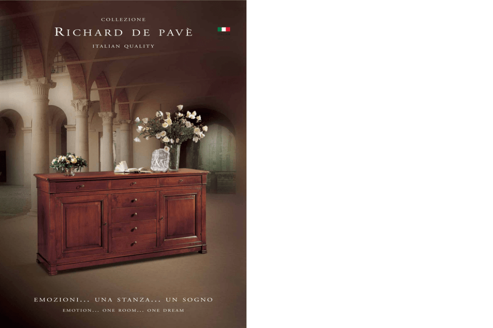 COLLEZIONE RICHARD D E P AV È I TA L I A N Q U A L I T Y E M O Z I O N I . . . U N A S TA N Z A . . . U N S O G N O EMOTION... ONE ROOM... ONE DREAM ITALIAN QUALITY COLLEZIONE RICHARD D E P AV È I TA L I A N Q U A L I T Y I mobili di questa collezione sono ispirati alla prima metà dell’800. Le linee dritte e squadrate, sono ammorbidite dalla forma arrotondata del piano, dei montanti laterali e dei basamenti. La struttura é realizzata in legno, parte in ciliegio e parte lastronato di ciliegio. Tutto ciò, unito al pregio dei materiali ed all ’elevata professionalità dei nostri falegnami, fanno di questa collezione un prodotto di alta ebanisteria capace di creare ambienti carichi di atmosfera. NULLA SI È PERICOLOSO QUANTO L’ESSERE TROPPO MODERNI. RISCHIA DI DIVENTARE IMPROVVISAMENTE FUORI MODA. NOTHING YOU (O. WIDE) IS SO DANGEROUS AS BEING TO MODERN. RUN THE RISK OF SUDDENLY GOING OUT OF FASCION. (O. WIDE) SERIE ANTE CON BUGNA ARTICOLI 1/... SERIES WITH BEVELED PANEL ARTICLE 1/... SERIE ANTE INTARSIATE ARTICOLI 2/... SERIES PANEL WITH INLAY ARTICLE 2/... Particolari preziosi, dettagli e finiture, rendono i nostri mobili particolarmente duttili, grazie anche alla intercambiabilità delle ante. Per una facile lettura del nostro catalogo è da considerarsi la serie con gli art.1/...i mobili con ante bugnate, mentre la serie con gli art. 2/... i mobili con ante intarsiate. E M O Z I O N I . . . U N A S TA N Z A . . . U N S O G N O EMOTION... ONE ROOM... ONE DREAM 3 E M O Z I O N I . . . U N A S TA N Z A . . . U N S O G N O EMOTION... ONE ROOM... ONE DREAM ART. 1/250 Credenza 2 ante bugnate 7 cassetti Sideboard 2 beveled panels 7 drawers cm. 193 x 53 x 94 H. ART. 2/250 Credenza 2 ante intarsiate 7 cassetti Sideboard 2 panels with inlay 7 drawers cm. 193 x 53 x 94 H. L’ARMONIA DI UN AMBIENTE SCOLPITO DALLA LUCE, VISSUTO NEL SUO COLORE CALDO E PREZIOSO CON LA SERENITÀ DELLE OMBRE E LA GRAZIA DELLE LUCI, INTERPRETI DI UNO SPAZIO UNICO. IN UN AMBIENTE CHE SI CONTRADDISTINGUE PER LA PERSONALITÀ ORIGINALE E SOBRIA ALLO STESSO TEMPO, C’É POSTO PER OGNI COSA CHE OCCUPA UN POSTO IMPORTANTE NELLA NOSTRA VITA. ZONA GIORNO L I V I N G RO O M 4 5 RICHARD DE PAVÈ ART. 2/252 Credenza 3 ante intarsiate 3 cassetti Sideboard 3 panels with inlay 3 drawers cm. 193 x 53 x 94 H. ART. 1/252 Credenza 3 ante bugnate 3 cassetti Sideboard beveled 3 panels 3 drawers cm. 193 x 53 x 94 H. ART. 1/251 Sedia tappezzata Chair with upholstered cm. 47 x 44 x 95 H. 6 7 RICHARD DE PAVÈ ART. 1/253 Tavolo rotondo allungabile con 1 allunga da cm. 40 Exstension round table with 1 leaf cm. 40 cm. Ø.120 x 80 H. ART. 1/251 Sedia tappezzata Chair with upholstered cm. 47 x 44 x 95 H. 8 ART. 1/252 Credenza 3 ante bugnate 3 cassetti Sideboard beveled 3 panels 3 drawers cm. 193 x 53 x 94 H. ART. 2/252 Credenza 3 ante intarsiate 3 cassetti Sideboard 3 panels with inlay 3 drawers cm. 193 x 53 x 94 H. 9 RICHARD DE PAVÈ ART. 1/254 Argentiera 2 porte 4 ripiani in legno Silver cabinet 2 doors 4 wooden shelf cm. 135 x 45 x 200 H. 10 ART. 1/255 Credenza 2 ante bugnate 2 cassetti Sideboard 2 beveled panels 2 drawers cm. 162 x 53 x 94 H. ART. 2/255 Credenza 2 ante intarsiate 2 cassetti Sideboard 2 panels with inlay 2 drawers cm. 162 x 53 x 94 H. 11 RICHARD DE PAVÈ ART. 1/253 Tavolo rotondo allungabile con 1 allunga da cm. 40 Exstension round table with 1 leaf cm. 40 cm. Ø.120 x 80 H. ART. 1/251 Sedia tappezzata Chair with upholstered cm. 47 x 44 x 95 H. 12 ART. 1/256 Cristalliera 2 porte legno bugnate 7 cassetti 3 porte Glass cupboard 2 beveled wooden doors 7 drawers 3 doors cm. 193 x 53 x 236 H. ART. 2/256 Cristalliera 2 porte legno intarsiate 7 cassetti 3 porte Glass cupboard 2 wooden doors with inlay 7 drawers 3 doors cm. 193 x 53 x 236 H. 13 RICHARD DE PAVÈ ART. 1/258 Tavolo ovale allungabile con 2 allunghe da cm. 40 Exstension oval table with 2 leaves cm. 40 cm. 165 x 108 x 80 H. ART. 1/257 Sedia tappezzata Chair with upholstered cm. 47 x 44 x 95 H. 14 15 RICHARD DE PAVÈ ART. 1/259 Vetrina 1 porta 1 cassetto Showcase 1 door 1 drawer cm. 96 x 43 x 151 H. 16 E M O Z I O N I . . . U N A S TA N Z A . . . U N S O G N O EMOTION... ONE ROOM... ONE DREAM 17 COLLEZIONE RICHARD D E P AV È I TA L I A N Q U A L I T Y IL COSÌ FASCINO È ESSERE PROTAGONISTA IN OGNI SITUAZIONE. LA CAMERA DA LETTO VIVE DI UNA LUCE NUOVA, TUTTO SEMBRA INVASO DA UN’ARMONIA ESTETICA CHE CONTAGIA. 18 ZONA NOT TE E M O Z I O N I . . . U N A S TA N Z A . . . U N S O G N O B E D RO O M EMOTION... ONE ROOM... ONE DREAM 19 ART. 1/274 Armadio 5 ante battenti con cassettiera interna Wardrobe 5 doors with inner drawer dresser cm. 302 x 69 x 261 H ART. 1/270 Comò 7 cassetti Chest of 7 drawers cm. 120 x 56 x 102 H. ART. 1/272 Specchiera rettangolare Rectangular mirror cm. 82 x 105 H. 20 RICHARD DE PAVÈ ART. C.514 Letto matrimoniale traforato Double bed perforated cm. 185 x 217 x 114 H. ART. 1/271 Comodino 3 cassetti Bed side table 3 drawers cm. 54 x 37 x 62 H. 21 RICHARD DE PAVÈ ART. 1/278 Letto matrimoniale traforato Double bed perforated cm. 185 x 217 x 114 H. ART. 1/271 Comodino 3 cassetti Bed side table 3 drawers cm. 54 x 37 x 62 H. 22 ART. 1/274 Armadio 5 ante battenti con cassettiera interna Wardrobe 5 doors with inner drawer dresser cm. 302 x 69 x 261 H ART. 1/270 Comò 7 cassetti Chest of 7 drawers cm. 120 x 56 x 102 H. ART. 1/272 Specchiera rettangolare Rectangular mirror cm. 82 x 105 H. 23 RICHARD DE PAVÈ ART. 1/273 Letto matrimoniale 2 cassettoni Double bed 2 drawers cm. 172 x 208 x 112 H. ART. 1/271 Comodino 3 cassetti Bed side table 3 drawers cm. 54 x 37 x 62 H. ART. 1/275 Letto matrimoniale 2 cassettoni Double bed 2 drawers cm. 172 x 208 x 112 H. ART. 1/277 Letto matrimoniale 2 cassettoni con testata capitonè Double bed 2 drawers with upholstered headboard cm. 172 x 208 x 112 H. 24 25 RICHARD DE PAVÈ ART. 1/274 Armadio 5 ante battenti con cassettiera interna Wardrobe 5 doors with inner drawer dresser cm. 302 x 69 x 261 H 26 27 RICHARD DE PAVÈ