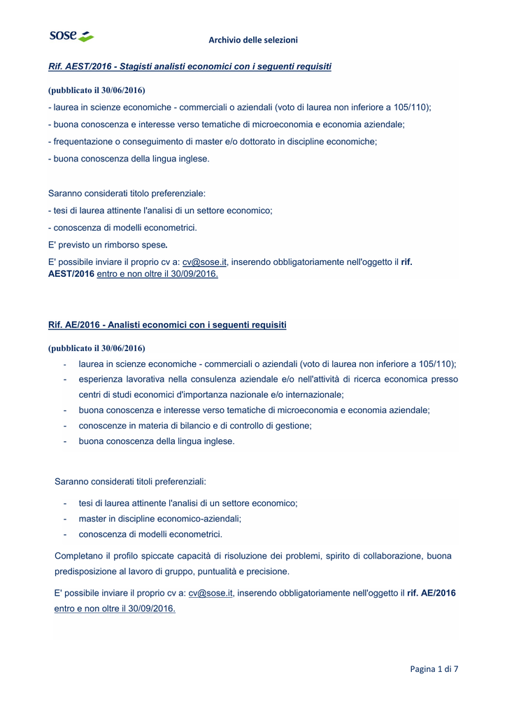 Archivio delle selezioni Rif. AEST/2016 - Stagisti analisti economici con i seguenti requisiti (pubblicato il 30/06/2016) - laurea in scienze economiche - commerciali o aziendali (voto di laurea non inferiore a 105/110); - buona conoscenza e interesse verso tematiche di microeconomia e economia aziendale; - frequentazione o conseguimento di master e/o dottorato in discipline economiche; - buona conoscenza della lingua inglese. Saranno considerati titolo preferenziale: - tesi di laurea attinente l'analisi di un settore economico; - conoscenza di modelli econometrici. E' previsto un rimborso spese. E' possibile inviare il proprio cv a: [email protected], inserendo obbligatoriamente nell'oggetto il rif. AEST/2016 entro e non oltre il 30/09/2016. Rif. AE/2016 - Analisti economici con i seguenti requisiti (pubblicato il 30/06/2016) - laurea in scienze economiche - commerciali o aziendali (voto di laurea non inferiore a 105/110); - esperienza lavorativa nella consulenza aziendale e/o nell'attività di ricerca economica presso centri di studi economici d'importanza nazionale e/o internazionale; - buona conoscenza e interesse verso tematiche di microeconomia e economia aziendale; - conoscenze in materia di bilancio e di controllo di gestione; - buona conoscenza della lingua inglese. Saranno considerati titoli preferenziali: - tesi di laurea attinente l'analisi di un settore economico; - master in discipline economico-aziendali; - conoscenza di modelli econometrici. Completano il profilo spiccate capacità di risoluzione dei problemi, spirito di collaborazione, buona predisposizione al lavoro di gruppo, puntualità e precisione. E' possibile inviare il proprio cv a: [email protected], inserendo obbligatoriamente nell'oggetto il rif. AE/2016 entro e non oltre il 30/09/2016. Pagina 1 di 7 Archivio delle selezioni Rif. STAP/2016 – Stagista analista programmatore (Pubblicato il giorno 20/04/2016) Il candidato dovrà possedere le seguenti caratteristiche: laurea magistrale in ingegneria informatica; conoscenza degli ambienti Java Enterprise (J2EE), Framework Struts e Spring, Tomcat, Liferay; conoscenza linguaggi Java, PHP, XML, JavaScript, HTML, CSS e SQL; conoscenza dei Database Oracle e MySql. Lo stage sarà retribuito. E' possibile inviare il proprio cv a: [email protected], inserendo obbligatoriamente nell'oggetto il rif. STAP/2016 entro e non oltre venerdì 20 maggio 2016. Rif. STASSI/2016 - 1 stagista addetto al servizio assistenza (Pubblicato il giorno 01/04/2016) Il candidato ideale, che sarà inserito nell’area assistenza, dovrà possederei seguenti requisiti: diploma o laurea; ottime capacità relazionali; esperienza in call center o simili; conoscenza del software MS Office; buone conoscenze informatiche per la risoluzione di problemi tecnici occorsi agli utenti; buone capacità di scrittura; disponibilità a lavorare in team. Lo stage è retribuito. E’ possibile inviare il proprio cv a: [email protected], inserendo obbligatoriamente nell’oggetto il rif. STASSI/2016 entro e non oltre il 10/05/2016. Rif. STDATADEVE/2016 – 1 stagista Database Developer da inserire nell’area ICT (Pubblicato il giorno 01/04/2016) Il candidato dovrà possedere le seguenti caratteristiche: laurea magistrale in ingegneria informatica; conoscenza dei linguaggi PL/SQL, SQL, XML, HTML, Java, PHP, JavaScript, RDF, OWL, SPARQL; conoscenza dei sistemi operativi Windows e Linux (principali comandi, competenze di shellscripting); conoscenza di database relazionali di Oracle 11g e MySQL. Lo stage sarà retribuito. E’ possibile inviare il proprio cv a: [email protected], inserendo obbligatoriamente nell’oggetto il rif. STDATADEVE/2016 entro e non oltre il 10/05/2016. Pagina 2 di 7 Archivio delle selezioni Rif. ANALISTAPROGR/2016 - 1 Analista Programmatore (Pubblicato il 01/04/2016) Il candidato, con minimo 5 anni di esperienza, sarà inserito nell'unità ICT e dovrà possedere i seguenti requisiti: laurea magistrale ingegneria informatica; ottima conoscenza degli ambienti Java Enterprise (J2EE); FrameworkStruts e Spring, Tomcat, JBoss, Liferay; ottima conoscenza linguaggi PHP, JavaScript, HTML, CSS e SQL; buona conoscenza dei Database Oracle e MySql. Completano il profilo una buona conoscenza del funzionamento di Web Services, dei principali framework di persistenza e tecniche AJAX e mobile. E’ possibile inviare il proprio cv a: [email protected], inserendo obbligatoriamente nell’oggetto il rif. ANALISTAPROGR/2016 entro e non oltre il 10/05/2016. Rif. DATADEVE - 1 Database Developer (Pubblicato il 01/04/2016) Il candidato, con minimo 5 anni di esperienza, sarà inserito nell'unità ICT e dovrà possedere i seguenti requisiti: laurea magistrale in ingegneria informatica; conoscenza di data base relazionali di Oracle 11g e MySQL; ottima conoscenza dei linguaggi: PL/SQL, SQL , XML, HTML, Java, PHP, JavaScript, RDF, OWL, SPARQL; ottima conoscenza dei sistemi operativi Windows e Linux (principali comandi, competenze di shellscripting); ottima conoscenza dei BigData Management: tecniche di DataWarehousing; tecniche algoritmiche e framework per l'elaborazione, l'analisi e aggregazione dei dati di grandi dimensioni (Hadoop); NoSQLdatabases; Graphdatabases; ottima conoscenza della Business Intelligence/Data Discovery: Oracle BI, QlikView, QlikSense. Completerà il profilo una buona conoscenza di applicativi statistici (SAS/R e STATA). E’ possibile inviare il proprio cv a: [email protected], inserendo obbligatoriamente nell’oggetto il rif. DATADEVE/2016 entro e non oltre il 10/05/2016. Pagina 3 di 7 Archivio delle selezioni Rif. ECOST/2016 – Stagisti economisti con i seguenti requisiti (Pubblicato il giorno 05/02/2016) Stagisti economisti con i seguenti requisiti: laureati in scienze economico-commerciali o aziendali; voto di laurea non inferiore a 105/110; buona conoscenza e interesse verso tematiche di microeconomia ed economia aziendale; frequentazione o conseguimento di master e/o dottorato in discipline