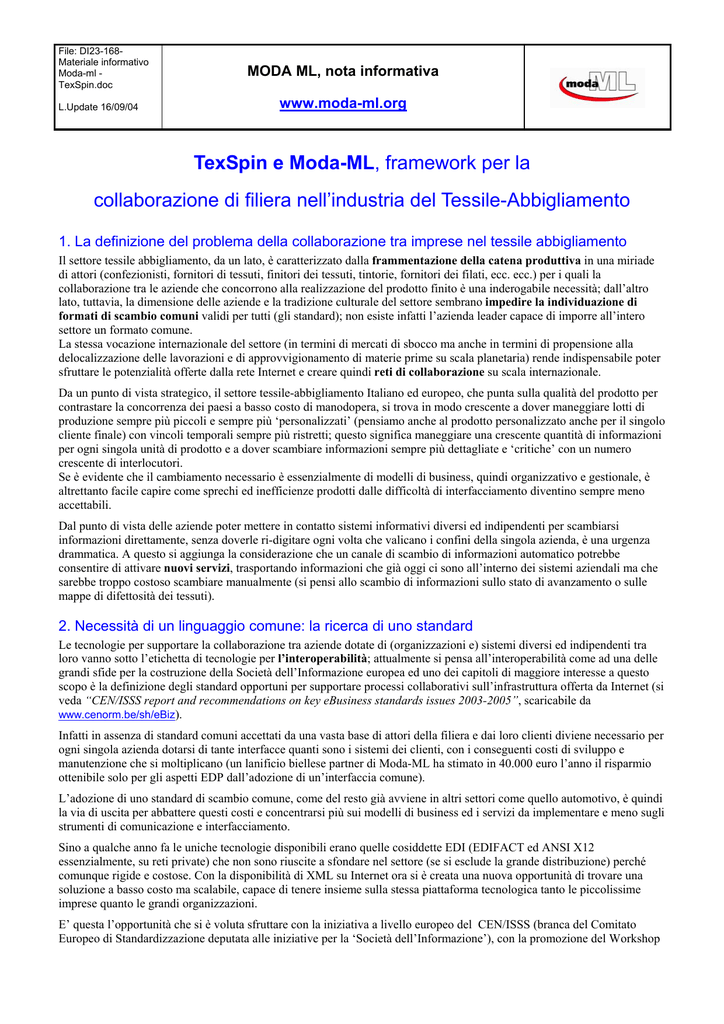 File: DI23-168Materiale informativo Moda-ml TexSpin.doc L.Update 16/09/04 MODA ML, nota informativa www.moda-ml.org TexSpin e Moda-ML, framework per la collaborazione di filiera nell’industria del Tessile-Abbigliamento 1. La definizione del problema della collaborazione tra imprese nel tessile abbigliamento Il settore tessile abbigliamento, da un lato, è caratterizzato dalla frammentazione della catena produttiva in una miriade di attori (confezionisti, fornitori di tessuti, finitori dei tessuti, tintorie, fornitori dei filati, ecc. ecc.) per i quali la collaborazione tra le aziende che concorrono alla realizzazione del prodotto finito è una inderogabile necessità; dall’altro lato, tuttavia, la dimensione delle aziende e la tradizione culturale del settore sembrano impedire la individuazione di formati di scambio comuni validi per tutti (gli standard); non esiste infatti l’azienda leader capace di imporre all’intero settore un formato comune. La stessa vocazione internazionale del settore (in termini di mercati di sbocco ma anche in termini di propensione alla delocalizzazione delle lavorazioni e di approvvigionamento di materie prime su scala planetaria) rende indispensabile poter sfruttare le potenzialità offerte dalla rete Internet e creare quindi reti di collaborazione su scala internazionale. Da un punto di vista strategico, il settore tessile-abbigliamento Italiano ed europeo, che punta sulla qualità del prodotto per contrastare la concorrenza dei paesi a basso costo di manodopera, si trova in modo crescente a dover maneggiare lotti di produzione sempre più piccoli e sempre più ‘personalizzati’ (pensiamo anche al prodotto personalizzato anche per il singolo cliente finale) con vincoli temporali sempre più ristretti; questo significa maneggiare una crescente quantità di informazioni per ogni singola unità di prodotto e a dover scambiare informazioni sempre più dettagliate e ‘critiche’ con un numero crescente di interlocutori. Se è evidente che il cambiamento necessario è essenzialmente di modelli di business, quindi organizzativo e gestionale, è altrettanto facile capire come sprechi ed inefficienze prodotti dalle difficoltà di interfacciamento diventino sempre meno accettabili. Dal punto di vista delle aziende poter mettere in contatto sistemi informativi diversi ed indipendenti per scambiarsi informazioni direttamente, senza doverle ri-digitare ogni volta che valicano i confini della singola azienda, è una urgenza drammatica. A questo si aggiunga la considerazione che un canale di scambio di informazioni automatico potrebbe consentire di attivare nuovi servizi, trasportando informazioni che già oggi ci sono all’interno dei sistemi aziendali ma che sarebbe troppo costoso scambiare manualmente (si pensi allo scambio di informazioni sullo stato di avanzamento o sulle mappe di difettosità dei tessuti). 2. Necessità di un linguaggio comune: la ricerca di uno standard Le tecnologie per supportare la collaborazione tra aziende dotate di (organizzazioni e) sistemi diversi ed indipendenti tra loro vanno sotto l’etichetta di tecnologie per l’interoperabilità; attualmente si pensa all’interoperabilità come ad una delle grandi sfide per la costruzione della Società dell’Informazione europea ed uno dei capitoli di maggiore interesse a questo scopo è la definizione degli standard opportuni per supportare processi collaborativi sull’infrastruttura offerta da Internet (si veda “CEN/ISSS report and recommendations on key eBusiness standards issues 2003-2005”, scaricabile da www.cenorm.be/sh/eBiz). Infatti in assenza di standard comuni accettati da una vasta base di attori della filiera e dai loro clienti diviene necessario per ogni singola azienda dotarsi di tante interfacce quanti sono i sistemi dei clienti, con i conseguenti costi di sviluppo e manutenzione che si moltiplicano (un lanificio biellese partner di Moda-ML ha stimato in 40.000 euro l’anno il risparmio ottenibile solo per gli aspetti EDP dall’adozione di un’interfaccia comune). L’adozione di uno standard di scambio comune, come del resto già avviene in altri settori come quello automotivo, è quindi la via di uscita per abbattere questi costi e concentrarsi più sui modelli di business ed i servizi da implementare e meno sugli strumenti di comunicazione e interfacciamento. Sino a qualche anno fa le uniche tecnologie disponibili erano quelle cosiddette EDI (EDIFACT ed ANSI X12 essenzialmente, su reti private) che non sono riuscite a sfondare nel settore (se si esclude la grande distribuzione) perché comunque rigide e costose. Con la disponibilità di XML su Internet ora si è creata una nuova opportunità di trovare una soluzione a basso costo ma scalabile, capace di tenere insieme sulla stessa piattaforma tecnologica tanto le piccolissime imprese quanto le grandi organizzazioni. E’ questa l’opportunità che si è voluta sfruttare con la iniziativa a livello europeo del CEN/ISSS (branca del Comitato Europeo di Standardizzazione deputata alle iniziative per la ‘Società dell’Informazione’), con la promozione del Workshop File: DI23-168Materiale informativo Moda-ml TexSpin.doc MODA ML, nota informativa www.moda-ml.org L.Update 16/09/04 TEXSPIN (http://www.uninfo.polito.it/WS_TEX-SPIN/default.htm oppure http://www.cenorm.be/isss), coordinato da Euratex (associazione europea delle associazioni industriali di settore) ed a cui hanno contribuito le esperienze di MODAML e di ETEXML. Il CEN Workshop, iniziato nel Luglio 2002, si è concluso nel Luglio 2003. L’obiettivo alla base di TexSpin è stato fornire una piattaforma prenormativa di modelli di scambio dati, messaggi XML e dizionari di termini che coprono i diversi aspetti della filiera, dalla organizzazione di vendita verso la produzione nei suoi diversi aspetti. Ciò significa che TexSpin ha fornito in qualche modo dei modelli di riferimento (suggeriti) ed una ben definita lingua di scambio che ora i fornitori d