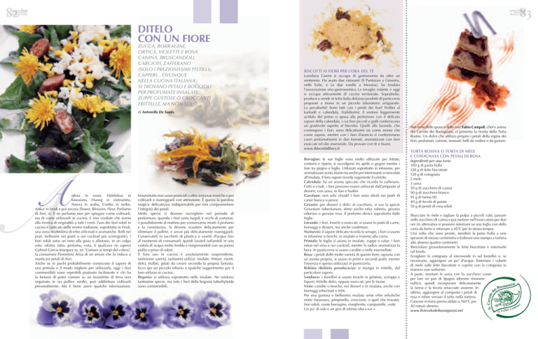 82 83 M AGA ZINE M AGA ZINE DITELo Con un fIoRE zucca, borragine, ortica, violette e rosa canina, bruscanDoli, carciofi, zafferano (solo i preziosissimi pistilli), capperi... ovunque nella cucina italiana si trovano petali e boccioli per profumate insalate, zuppe gustose o croccanti frittelle, ma non solo di Antonella De Santis A A nfissa in russo, Halelehua in hawaiano, Huong in vietnamita, Nawra in arabo, Cvetko in serbo, Ankur in hindi e poi ancora Flower, Blossom, Fleur. Parliamo di fiori, sì. E ne parliamo non per spiegare come coltivarli, ma di come utilizzarli in cucina. E non crediate che siamo alla ricerca di originalità a tutti i costi: l’uso dei fiori eduli in cucina è radicato nelle nostre tradizioni, soprattutto in Friuli, una zona ricchissima di erbe officinali e aromatiche. Belli nei prati, bellissimi nei piatti o nei cocktail più scenografici, i fiori eduli sono un inno alla gioia e allietano, in un colpo solo, olfatto, tatto, profumo, vista. E qualcosa ne sapeva Gabriel Garcia Marquez se, ne “L’amore ai tempi del colera”, fa consumare Florentino Ariza di un amore che lo induce a masticare petali di fiori. Anche se in pochi probabilmente conoscono il sapore di una primula e il modo migliore per utilizzarla, oggi i fiori commestibili sono reperibili piuttosto facilmente e chi ha la fortuna di poter contare su un fazzoletto di terra non inquinato (e un pollice verde), può addirittura coltivarli personalmente. Ma è bene avere qualche informazione. Innanzitutto mai usare pesticidi o altre sostanze tossiche e poi coltivarli e maneggiarli con attenzione. È questa la parolina magica: delicatezza, indispensabile per non compromettere l’integrità dei petali. Molte specie si devono raccogliere nel periodo di prefioritura, quando i fiori sono turgidi e ricchi di sostanze, e possibilmente al mattino per conservarne intatti il profumo e la consistenza. Si devono scuotere delicatamente per eliminare il polline, e ancor più delicatamente maneggiarli. Conservateli in sacchetti di plastica o vasetti d’acqua fino al momento di consumarli, quindi lavateli tuffandoli in una ciotola di acqua molto fredda e tamponandoli con un panno pulito e privo di odori. Il loro uso in cucina è assolutamente sorprendente, tantissime varietà, tantissimi utilizzi: insalate, fritture, risotti, dolci, frullati, gelati da creare secondo la propria fantasia. Ecco qui un piccolo erbario e qualche suggerimento per il loro utilizzo in cucina. Begonia: si utilizza soprattutto nelle insalate. Ne esistono tantissime specie, ma solo i fiori della begonia tuberhybrida sono commestibili. BISCoTTI AI fIoRI PER L’oRA DEL Tè Loredana Carere si occupa di gastronomia da oltre un ventennio. Ha avuto due ristoranti (Il Puntazzo a Ginostra, nelle Eolie, e Le due sorelle a Messina), ha fondato l’associazione eno-gastronomica La tovaglia volante e oggi si occupa attivamente di cucina territoriale. Soprattutto, produce e vende in tutta Italia deliziosi prodotti di pasticceria preparati a mano in un piccolo laboratorio artigianale. La peculiarità? Sono fatti con i petali dei fiori! Frollini al karkadè e calendula, friabilissimi: il sentore leggermente acidulo del primo si sposa alla perfezione con il delicato sapore della calendula, i cui fiori piccoli e gialli conferiscono un gradevole aspetto al biscotto. Quelli alla lavanda, che contengono i fiori, sono delicatissimi sia come aroma che come sapore, mentre con i fiori d’arancio si confezionano cuori profumatissimi in due formati, aromatizzati con fiori essiccati ed olio essenziale. Da provare con tè e tisane. www.ibiscottidilory.it Borragine: le sue foglie sono molto utilizzate per frittate, contorni e ripieni, si raccolgono tra aprile e giugno mentre i fiori tra giugno e luglio. Utilizzati soprattutto in infusione, per aromatizzare aceto, tisane ma anche per interessanti; o mescolati all’insalata, il loro sapore ricorda vagamente il cetriolo. Calendula: ha un aroma spiccato che ricorda lo zafferano. Cotti o crudi, i fiori possono essere utilizzati dall’antipasto al dessert, con uova, in flan e budini. Garofano: non solo chiodi! I fiori sono ideali nei piatti di carne bianca o pesce. Geranio: per dessert e dolci al cucchiaio, si usa la specie Geranium robertianum, detto anche erba roberta, geranio odoroso o geranio rosa. Il profumo deriva soprattutto dalle foglie. Lavanda: i fiori, freschi o essiccati, si usano in piatti di carne, formaggi e dessert, ma anche confetture. nasturzio: il sapore delicato ricorda la senape, i fiori si usano in infusione o freschi, in insalate o insieme alla carne. Primula: le foglie si usano in insalate, zuppe o salse; i fiori infusi nel vino e nei cocktail, mentre la radice aromatizza la birra. In pasticceria si usano candite o nelle marmellate. Rosa: i petali delle molte varietà di questo fiore, ognuna con un aroma proprio, si usano in primi e secondi piatti, mentre l’essenza è spesso utilizzata in pasticceria. Robinia (Robinia pseudacacia): si mangia in frittelle, dal particolare sapore. Sambuco: i fiorellini si usano freschi in gelatine, sciroppi e liquori, frittelle dolci; oppure essiccati, per le tisane. Viola: candite o fresche, nei dessert e in insalata, anche con formaggi erborinati e fritti. Per una gustosa e bellissima insalata unite erbe selvatiche miste (tarassaco, pimpinella, crescione, o quel che trovate), fiori eduli, come borragine, margherite, campanelle, viole. Un po’ di sale e un giro di ottimo olio e.v.o ◆ Nel mese delle spose e delle rose fabio Campoli, chef e anima del Circolo dei Buongustai, ci presenta la ricetta della Torta Rosina. Un dolce che utilizza proprio i petali della regina dei fiori, profumati, carnosi, sensuali: belli da vedere e da gustare. ToRTA RoSInA o ToRTA DI MELE E CoToGnATA Con PETALI DI RoSA Ingredienti per una torta 300 g di pasta frolla 120 g di fette biscottate 120 g di cotognata 2 mele 3 uova 50 g di zucchero di canna 90 g di zucchero bianco 45 g di farina 00 