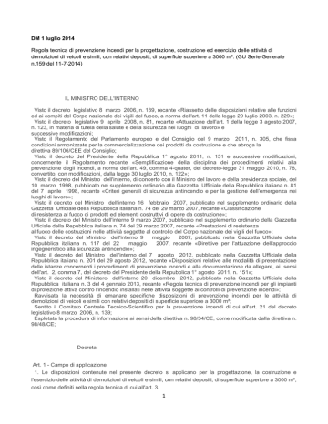 DM 1 luglio 2014 Regola tecnica di prevenzione incendi per la progettazione, costruzione ed esercizio delle attività di demolizioni di veicoli e simili, con relativi depositi, di superficie superiore a 3000 m². (GU Serie Generale n.159 del 11-7-2014) IL MINISTRO DELL'INTERNO Visto il decreto legislativo 8 marzo 2006, n. 139, recante «Riassetto delle disposizioni relative alle funzioni ed ai compiti del Corpo nazionale dei vigili del fuoco, a norma dell'art. 11 della legge 29 luglio 2003, n. 229»; Visto il decreto legislativo 9 aprile 2008, n. 81, recante «Attuazione dell'art. 1 della legge 3 agosto 2007, n. 123, in materia di tutela della salute e della sicurezza nei luoghi di lavoro» e successive modificazioni; Visto il Regolamento del Parlamento europeo e del Consiglio del 9 marzo 2011, n. 305, che fissa condizioni armonizzate per la commercializzazione dei prodotti da costruzione e che abroga la direttiva 89/106/CEE del Consiglio; Visto il decreto del Presidente della Repubblica 1° agosto 2011, n. 151 e successive modificazioni, concernente il Regolamento recante «Semplificazione della disciplina dei procedimenti relativi alla prevenzione degli incendi, a norma dell'art. 49, comma 4-quater, del decreto-legge 31 maggio 2010, n. 78, convertito, con modificazioni, dalla legge 30 luglio 2010, n. 122»; Visto il decreto del Ministro dell'interno, di concerto con il Ministro del lavoro e della previdenza sociale, del 10 marzo 1998, pubblicato nel supplemento ordinario alla Gazzetta Ufficiale della Repubblica italiana n. 81 del 7 aprile 1998, recante «Criteri generali di sicurezza antincendio e per la gestione dell’emergenza nei luoghi di lavoro»; Visto il decreto del Ministro dell'interno 16 febbraio 2007, pubblicato nel supplemento ordinario della Gazzetta Ufficiale della Repubblica italiana n. 74 del 29 marzo 2007, recante «Classificazione di resistenza al fuoco di prodotti ed elementi costruttivi di opere da costruzione»; Visto il decreto del Ministro dell'interno 9 marzo 2007, pubblicato nel supplemento ordinario della Gazzetta Ufficiale della Repubblica italiana n. 74 del 29 marzo 2007, recante «Prestazioni di resistenza al fuoco delle costruzioni nelle attività soggette al controllo del Corpo nazionale dei vigili del fuoco»; Visto il decreto del Ministro dell'interno 9 maggio 2007, pubblicato nella Gazzetta Ufficiale della Repubblica italiana n. 117 del 22 maggio 2007, recante «Direttive per l'attuazione dell'approccio ingegneristico alla sicurezza antincendio»; Visto il decreto del Ministro dell'interno del 7 agosto 2012, pubblicato nella Gazzetta Ufficiale della Repubblica italiana n. 201 del 29 agosto 2012, recante «Disposizioni relative alle modalità di presentazione delle istanze concernenti i procedimenti di prevenzione incendi e alla documentazione da allegare, ai sensi dell'art. 2, comma 7, del decreto del Presidente della Repubblica 1° agosto 2011, n. 151»; Visto il decreto del Ministero dell'interno 20 dicembre 2012, pubblicato nella Gazzetta Ufficiale della Repubblica italiana n. 3 del 4 gennaio 2013, recante «Regola tecnica di prevenzione incendi per gli impianti di protezione attiva contro l'incendio installati nelle attività soggette ai controlli di prevenzione incendi»; Ravvisata la necessità di emanare specifiche disposizioni di prevenzione incendi per le attività di demolizioni di veicoli e simili con relativi depositi di superficie superiore a 3000 m²; Sentito il Comitato Centrale Tecnico-Scientifico per la prevenzione incendi di cui all'art. 21 del decreto legislativo 8 marzo 2006, n. 139; Espletata la procedura di informazione ai sensi della direttiva n. 98/34/CE, come modificata dalla direttiva n. 98/48/CE; Decreta: Art. 1 - Campo di applicazione 1. Le disposizioni contenute nel presente decreto si applicano per la progettazione, la costruzione e l'esercizio delle attività di demolizioni di veicoli e simili, con relativi depositi, di superficie superiore a 3000 m², così come definiti nella regola tecnica di cui all'art. 3. 1 Art. 2 - Obiettivi 1. Ai fini della prevenzione incendi, allo scopo di raggiungere i primari obiettivi di sicurezza relativi alla salvaguardia delle persone e alla tutela dei beni contro i rischi di incendio, le attività di cui all'art. 1 del presente decreto, sono realizzate e gestite in modo da: a) minimizzare le cause di incendio; b) garantire la stabilità delle strutture portanti al fine di assicurare il soccorso agli occupanti; c) limitare la produzione e la propagazione di un incendio all'interno dei locali o edifici; d) limitare la propagazione di un incendio ad edifici, locali aree limitrofe; e) assicurare la possibilità che gli occupanti lascino i locali, gli edifici e le aree indenni o che gli stessi siano soccorsi in altro modo; f) garantire la possibilità per le squadre di soccorso di operare in condizioni di sicurezza. Art. 3 - Disposizioni tecniche 1. Ai fini del raggiungimento degli obiettivi di cui all'art. 2, è approvata la regola tecnica di prevenzione incendi allegata al presente decreto. Art. 4 - Applicazione delle disposizioni tecniche 1. Le disposizioni riportate nel titolo I, capo I della regola tecnica allegata al presente decreto, si applicano alle attività di demolizione veicoli di cui all'art. 1 di nuova realizzazione ed a quelle esistenti nel caso siano oggetto di interventi comportanti la loro completa ristrutturazione. 2. Se gli interventi effettuati su attività esistenti comportano la sostituzione o modifica di impianti di protezione attiva antincendio, la modifica parziale del sistema di vie di uscita o ampliamenti e realizzazioni di nuove strutture, le disposizioni di cui al titolo I, capo I, della regola tecnica allegata al presente decreto, si applicano solo agli impianti ed alle parti dell’attività oggetto di intervento di modifica ovvero di ampliamento. Se l'aumento di superficie da destinare ad attività di demolizione autoveicoli è superiore al 50% di quella esis