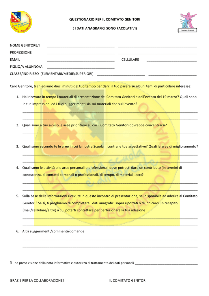 QUESTIONARIO PER IL COMITATO GENITORI ( I DATI ANAGRAFICI SONO FACOLATIVI) NOME GENITORE/I ___________________________________ _________________________________________ PROFESSIONE ___________________________________ _________________________________________ EMAIL ___________________________________ CELLULARE FIGLIO/A ALUNNO/A __________________________ ___________________________________ CLASSE/INDIRIZZO (ELEMENTARI/MEDIE/SUPERIORI) _________________________ _________________________ Caro Genitore, ti chiediamo dieci minuti del tuo tempo per darci il tuo parere su alcuni temi di particolare interesse: 1. Hai ricevuto in tempo i materiali di presentazione del Comitato Genitori e dell’evento del 19 marzo? Quali sono le tue impressioni ed i tuoi suggerimenti sia sui materiali che sull’evento? ___________________________________________________________________________________________ ___________________________________________________________________________________________ 2. Quali sono a tuo avviso le aree prioritarie su cui il Comitato Genitori dovrebbe concentrarsi? ___________________________________________________________________________________________ ___________________________________________________________________________________________ 3. Quali sono secondo te le aree in cui la nostra Scuola incontra le tue aspettative? Quali le aree di miglioramento? ___________________________________________________________________________________________ ___________________________________________________________________________________________ 4. Quali sono le attività o le aree personali o professionali dove potresti dare un contributo (in termini di conoscenza, di contatti personali o professionali, di tempo, di materiali, ecc)? ___________________________________________________________________________________________ ___________________________________________________________________________________________ 5. Sulla base delle informazioni ricevute in questo incontro di presentazione, sei disponibile ad aderire al Comitato Genitori? Se sì, ti preghiamo di completare i dati anagrafici sopra riportati o di indicarci un recapito (mail/celllulare/altro) a cui poterti contattare per perfezionare la tua adesione ___________________________________________________________________________________________ ___________________________________________________________________________________________ 6. Altri suggerimenti/commenti/domande ___________________________________________________________________________________________ ___________________________________________________________________________________________ o ho preso visione della nota informativa e autorizzo al trattamento dei dati personali ____________________________________ GRAZIE PER LA COLLABORAZIONE! IL COMITATO GENITORI Informativa ai sensi dell'art. 13 d.lgs. N. 196/2003 per il trattamento dei dati personali raccolti tramite questionario Finalità La raccolta dei dati contenuti nel presente questionario è finalizzato esclusivamente ad acquisire dati conoscitivi sull’attività del Comitato Genitori dell’Istituto Leonardo Murialdo e alla raccolta di suggerimenti utili allo sviluppo di nuove iniziative dello stesso. Titolare, modalità e Luogo di trattamento dei dati Titolare del trattamento dei dati è il Comitato Genitori dell’Istituto Leonardo Murialdo. I dati personali verranno trattati, in conformità della normativa vigente in materia di protezione dei dati personali, con strumenti manuali e/o automatizzati per il tempo strettamente necessario a conseguire gli scopi per cui sono stati raccolti. Idonee misure di sicurezza sono osservate per prevenire la perdita dei dati, usi illeciti o non corretti ed accessi non autorizzati. Tali trattamenti sono curati solo da personale incaricato del trattamento ed, eventualmente, da personale esterno designato al trattamento dei dati. Il conferimento dei dati è volontario e in assenza di consenso non potrà essere acquisito il questionario che riporti eventuali dati anagrafici facoltativi. In assenza di dati anagrafici facoltativi il questionario verrà comunque trattato dal titolare. Ricevuta l’informativa viene espresso il proprio libero ed informato consenso, barrando l'apposita casella, al trattamento dei dati personali inseriti nel questionario con le modalità e nei limiti di cui all’informativa stessa. Dati personali L'eventuale invio elettronico o postale effettuati in forma facoltativa, esplicita e volontaria comportano la successiva acquisizione dell'indirizzo del mittente, necessario per rispondere alle richieste, nonché degli eventuali altri dati personali inseriti nella missiva. Il Titolare del trattamento dei dati si impegna a mantenere la massima riservatezza su tutti i dati inviati dall'utente. I dati trattati non saranno oggetto di comunicazione/diffusione a terzi. Il mancato conferimento di questi dati personali ha come unica conseguenza l'impossibilità di perseguire in maniera completa le finalità di ricerca ai quali lo studio è finalizzato. Per completezza va ricordato che in alcuni casi l'Autorità Garante della Privacy può richiedere notizie e informazioni ai sensi dell'art. 157 del D.Lgs. 196/2003, ai fini del controllo sul trattamento dei dati personali. In questi casi la risposta è obbligatoria a pena di sanzione amministrativa. Diritti degli interessati In base all'art. 7 del D.Lgs. 196/2003, l'utente ha il diritto, in qualsiasi momento e gratuitamente, di chiedere informazioni in merito ai suoi dati, nonchè a modalità e finalità del trattamento cui sono sottoposti, di farli modificare o cancellare o di opporsi per motivi legittimi al loro ulteriore trattamento ed inoltre di ottenere notizia sulle iniziative di cui è stato reso partecipe. Questi diritti potranno essere esercitati inviando un messaggio di posta elettronica all'indirizzo [email protected] o una lettera all’indirizzo Comitato Genitori – Istituto L.Murialdo, via del