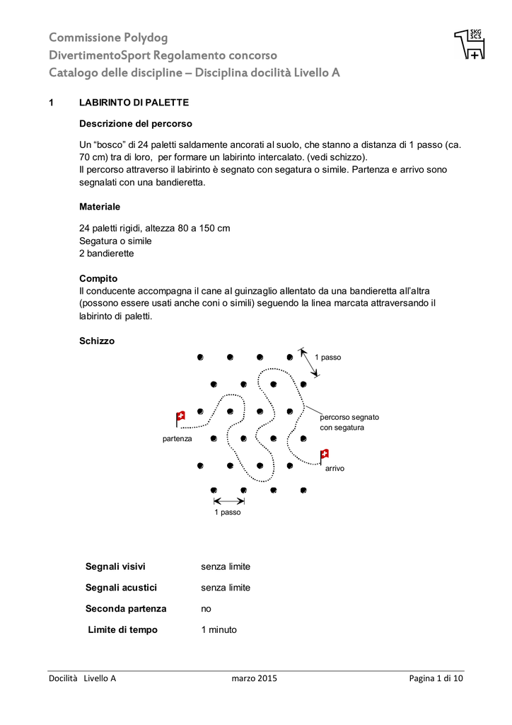 Commissione Polydog DivertimentoSport Regolamento concorso Catalogo delle discipline – Disciplina docilità Livello A 1 LABIRINTO DI PALETTE Descrizione del percorso Un “bosco” di 24 paletti saldamente ancorati al suolo, che stanno a distanza di 1 passo (ca. 70 cm) tra di loro, per formare un labirinto intercalato. (vedi schizzo). Il percorso attraverso il labirinto è segnato con segatura o simile. Partenza e arrivo sono segnalati con una bandieretta. Materiale 24 paletti rigidi, altezza 80 a 150 cm Segatura o simile 2 bandierette Compito Il conducente accompagna il cane al guinzaglio allentato da una bandieretta all’altra (possono essere usati anche coni o simili) seguendo la linea marcata attraversando il labirinto di paletti. Schizzo 1 passo percorso segnato con segatura partenza arrivo 1 passo Segnali visivi senza limite Segnali acustici senza limite Seconda partenza no Limite di tempo 1 minuto Docilità Livello A marzo 2015 Pagina 1 di 10 Commissione Polydog DivertimentoSport Regolamento concorso Catalogo delle discipline – Disciplina docilità Livello A Valutazione del labirinto di paletti Compito Il conducente accompagna il cane al guinzaglio allentato, da una bandieretta all’altra (possono essere usati anche coni o simili) seguendo la linea marcata attraversando il labirinto di paletti. 2 punti – eccellente o Né conducente né cane lasciano il percorso segnato o Il guinzaglio è allentato e non si attorciglia attorno ai paletti 1 punto – molto buono o Massimo 2 brevi correzioni (attorcigliare, guinzaglio tirato) o Il cane completa l’esercizio, ma abbaiando, piagnucolando, ululando o uggiolando diverse volte 0 punti – insufficiente o Superamento del limite di tempo o Più di 2 correzioni cane (attorcigliare, guinzaglio tirato) o Cane e conducente lasciano definitivamente il tratto marcato o Il conduttore tira sul guinzaglio o Toccare il cane o Il cane sporca sul percorso. Docilità Livello A marzo 2015 Pagina 2 di 10 Commissione Polydog DivertimentoSport Regolamento concorso Catalogo delle discipline – Disciplina docilità Livello A 2 DISTACCO Descrizione del percorso Due cassoni di circa 80x80x10 cm sono posati a terra a distanza di 5 passi. A distanza di 10 passi in mezzo la partenza è segnalata con una bandieretta. Materiale 2 cassoni, 1 bandieretta Compito Conducente e cane prendono posizione alla bandieretta. L’EC decide se il cane si deve recare sul cassone destro o sinistro. Il conducente, senza lasciare il posto, invia il cane sul cassone indicatogli. Lì il cane rimane ( seduto, sdraiato, in piedi o cambiando posizione). Dopo 3 secondi il EC dà al conducente l’indicazione di andare a prendere il suo cane. 5 passi Schizzo 10 passi Segnali visivi senza limite Segnali acustici senza limite Seconda partenza no, se il cane torna al cassone prima di aver terminato il compito, non è ammessa una seconda partenza Limite di tempo 1 minuto Docilità Livello A marzo 2015 Pagina 3 di 10 Commissione Polydog DivertimentoSport Regolamento concorso Catalogo delle discipline – Disciplina docilità Livello A Valutazione del distacco Compito Conducente e cane prendono posizione alla bandieretta. L’EC decide se il cane si deve recare sul cassone destro o sinistro. Il conducente, senza lasciare il posto, invia il cane sul cassone indicatogli. Lì il cane rimane ( seduto, sdraiato, in piedi o cambiando posizione). Dopo 3 secondi il EC dà al conducente l’indicazione di andare a prendere il suo cane. 2 punti – eccellente o Cassone giusto o Il cane rimane sul cassone finché il conducente va prenderlo 1 punto – molto buono o Cassone sbagliato, il cane vi rimane però finché il conducente va prenderlo o Cassone giusto, ma il cane non vi rimane oIl cane completa l’esercizio, ma abbaiando, piagnucolando, ululando o uggiolando diverse volte 0 punti – insufficiente o Superamento del limite di tempo o Non sale sul cassone o Lascia il cassone sbagliato prima del tempo o Il conducente urla al cane o Il cane lascia il percorso o Il cane sporca sul percorso. Docilità Livello A marzo 2015 Pagina 4 di 10 Commissione Polydog DivertimentoSport Regolamento concorso Catalogo delle discipline – Disciplina docilità Livello A 3 RESTA Descrizione del percorso Un cerchio della ø di 3 passi è segnato con della segatura per terra. Alla distanza di 15 passi va messa una sedia con lo schienale rivolto verso il cerchio Materiale Segatura o simile, 1 sedia Compito Il conducente, su indicazioni del EC, si reca con il cane nel cerchio. Lì toglie il guinzaglio al cane e lo fa restare in qualsiasi posizione. Il conducente si reca verso la sedia e si siede con la schiena rivolta verso il cane. Dopo 3 secondi, su segnale del EC il conducente torna dal cane e lo mette al guinzaglio. Schizzo cerchio di partenza 15 passi Segnali visivi senza limite Segnali acustici senza limite Seconda partenza no Limite di tempo 1 minuto Docilità Livello A marzo 2015 sedia Pagina 5 di 10 Commissione Polydog DivertimentoSport Regolamento concorso Catalogo delle discipline – Disciplina docilità Livello A Valutazione del resta Compito Il conducente, su indicazioni del EC, si reca con il cane nel cerchio. Lì toglie il guinzaglio al cane e lo fa restare in qualsiasi posizione. Il conducente si reca verso la sedia e si siede con la schiena rivolta verso il cane. Dopo 3 secondi, su segnale del EC il conducente torna dal cane e lo mette al guinzaglio. 2 punti – eccellente oIl cane rimane nel cerchio ( se non lascia il cerchio cambiamenti di posizioni sono permessi) 1 punto – molto buono o Il cane va verso il conducente quando questi si reca dal cane o Il cane lascia il cerchio prima del tempo o Il cane non si lascia mettere al guinzaglio nel cerchio o Il cane completa l’esercizio, ma abbaiando, piagnucolando, ululando o uggiolando diverse volte 0 punti – insufficiente o Superamento del limite di tempo o Il cane non aspetta, si allontana dal cerchio con il conducente o lo lascia mentre il co