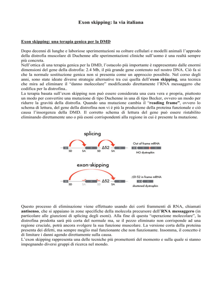 Exon skipping: la via italiana Exon skipping: una terapia genica per la DMD Dopo decenni di lunghe e laboriose sperimentazioni su colture cellulari e modelli animali l’approdo della distrofia muscolare di Duchenne alle sperimentazioni cliniche sull’uomo è una realtà sempre più concreta. Nell’ottica di una terapia genica per la DMD, l’ostacolo più importante è rappresentato dalle enormi dimensioni del gene della distrofia: 2.4 Mb, il più grande gene contenuto nel nostro DNA. Ciò fa si che la normale sostituzione genica non si presenta come un approccio possibile. Nel corso degli anni, sono state ideate diverse strategie alternative tra cui quella dell’exon skipping, una tecnica che mira ad eliminare il “danno molecolare” modificando direttamente l’RNA messaggero che codifica per la distrofina.. La terapia basata sull’exon skipping non può essere considerata una cura vera e propria, piuttosto un modo per convertire una mutazione di tipo Duchenne in una di tipo Becker, ovvero un modo per ridurre la gravità della distrofia. Quando una mutazione cambia il “reading frame”, ovvero lo schema di lettura, del gene della distrofina non vi è più la produzione della proteina funzionale e ciò causa l’insorgenza della DMD. Il corretto schema di lettura del gene può essere ristabilito eliminando direttamente uno o più esoni corrispondenti alla regione in cui è presente la mutazione. Questo processo di eliminazione viene effettuato usando dei corti frammenti di RNA, chiamati antisenso, che si appaiano in zone specifiche della molecola precursore dell’RNA messaggero (in particolare alle giunzioni di splicing degli esoni). Alla fine di questa “operazione molecolare”, la distrofina prodotta sarà più corta del normale ma, se il pezzo eliminato non corrisponde ad una regione cruciale, potrà ancora svolgere la sua funzione muscolare. La versione corta della proteina presenta dei difetti, ma sempre meglio mal funzionante che non funzionante. Insomma, il concetto è di limitare i danni agendo direttamente sulla causa. L’exon skipping rappresenta una delle tecniche più promettenti del momento e sulla quale si stanno impegnando diversi gruppi di ricerca nel mondo. Il team di Irene Bozzoni e Parent Project: un’unione contro la distrofia Il gruppo di ricerca guidato da Irene Bozzoni, professoressa all’Universita’ di Roma “La Sapienza”, e’ da anni schierato in prima linea nella battaglia contro la distrofia muscolare. I suoi studi sono basati sull’utilizzo di vettori costruiti ��� ��� per veicolare, all’interno delle cellule muscolari, le molecole di RNA necessarie per l’exon skipping. I primi importanti risultati sono arrivati nel 2002 e dal 2003 e, da allora, i progetti di Irene Bozzoni sono sostenuti da Parent Project onlus. In particolare, dal 2003 ad oggi, l’associazione ha finanziato la fase pre-clinica della ricerca, ovvero la sperimentazione effettuata sul topo mdx come modello animale per la distrofia di Duchenne, e intende fornire, per il prossimo futuro, i finanziamenti per le prove tossicologiche e la sperimentazione clinica sull’uomo dell’exon skipping. I primi risultati del gruppo di ricerca romano, pubblicati nel 2002 sulla rivista scientifica ����� ������������������������������������������������, sono stati ottenuti su colture di cellule muscolari (i mioblasti) di un paziente DMD con una delezione degli esoni 48, 49 e 50. Questa delezione causa un cambiamento dello schema di lettura del gene della distrofina, cambiamento che puo’ essere annullato con l’eliminazione dell’esone 51. Gli esperimenti sono stati condotti introducendo nei mioblasti dei vettori retrovirali contenenti geni codificanti per molecole di RNA antisenso in grado di riconoscere le giunzioni di splicing specifiche ed eliminare l’esone 51. Questa strategia ha dato risultati molto interessanti: innanzitutto e’ stato dimostrato che le molecole di RNA introdotte nelle cellule sono stabili e la loro azione e’ continuativa nel tempo, secondo si è ottenuto il ripristino della produzione di distrofina che, anche se più corta, e’ funzionante. Visto l’efficacia della strategia messa a punto, lo studio e’ stato esteso al modello animale per la DMD: il topo mdx. Questo topo ha una mutazione puntiforme “non senso”, ovvero la formazione di un codone di stop, nell’esone 23 del gene per la distrofina, con la conseguente produzione di una distrofina non funzionale. In questo caso come “navetta” di trasporto per i geni codificanti gli RNA antisenso sono stati utilizzati vettori Virali Adeno Associati (AAV): un tipo di vettore virale che, non essendo patogenico, viene molto usato in terapia genica. La somministrazione locale (per via intramuscolare) o in tutto il corpo (per via sistemica, mediante la vena nella coda del topo) ha dato risultati molto positivi che sono stati pubblicati su ���� nel 2006. Le analisi molecolari hanno dimostrato la presenza di alti livelli di RNA antisenso nei muscoli del topo, i quali hanno indotto l’exon skipping dell’esone 23 determinando la produzione di distrofina e, soprattutto, il recupero della funzionalità muscolare L’introduzione di virus AAV per via sistemica ha permesso di ottenere un’efficiente trasporto dei geni terapeutici in tutti i distretti muscolari, inclusi il cuore e il diaframma che rappresentano i tessuti più importanti per il trattamento terapeutico dei malati DMD. La possibilita’ di usare il sistema AAV e’ un punto molto importante, questi vettori hanno il vantaggio di non provocare infiammazione e di inserirsi efficientemente all’interno di cellule muscolari, dove il DNA virale viene mantenuto in forma stabile. Successivi esperimenti effettuati sui topi mdx hanno mostrato l’effetto a lungo termine degli RNA antisenso: 18 mesi dopo l’iniezione sistemica 