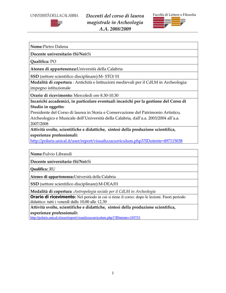 Docenti del corso di laurea magistrale in Archeologia A.A. 2008/2009 Facoltà di Lettere e Filosofia Nome:Pietro Dalena Docente universitario (Si/No):Sì Qualifica: PO Ateneo di appartenenza:Università della Calabria SSD (settore scientifico disciplinare):M- STO/ 01 Modalità di copertura : Antichità e Istituzioni medievali per il CdLM in Archeologia: impegno istituzionale Orario di ricevimento: Mercoledì ore 8.30-10.30 Incarichi accademici, in particolare eventuali incarichi per la gestione del Corso di Studio in oggetto: Presidente del Corso di laurea in Storia e Conservazione del Patrimonio Artistico, Archeologico e Musicale dell’Università della Calabria, dall’a.a. 2003/2004 all’a.a. 2007/2008 Attività svolte, scientifiche e didattiche, sintesi della produzione scientifica, esperienze professionali: http://polaris.unical.it/user/report/visualizzacurriculum.php3?IDutente=497115038 Nome:Fulvio Librandi Docente universitario (Si/No):Sì Qualifica: RU Ateneo di appartenenza:Università della Calabria SSD (settore scientifico disciplinare):M-DEA/01 Modalità di copertura :Antropologia sociale per il CdLM in Archeologia Orario di ricevimento: Nel periodo in cui si tiene il corso: dopo le lezioni. Fuori periodo didattico: tutti i venerdì dalle 10,00 alle 12,30 Attività svolte, scientifiche e didattiche, sintesi della produzione scientifica, esperienze professionali: http://polaris.unical.it/user/report/visualizzacurriculum.php3?IDutente=105752 1 Docenti del corso di laurea magistrale in Archeologia A.A. 2008/2009 Facoltà di Lettere e Filosofia Nome:Maurizio Paoletti Docente universitario (Si/No):Sì Qualifica: PA Ateneo di appartenenza:Università della Calabria SSD (settore scientifico disciplinare): L- ANT/ 07 Modalità di copertura : Storia dell’arte antica per il CdLM in Storia dell’Arte: impegno istituzionale Storia dell’arte antica per il CdLM in Archeologia: impegno istituzionale Orario di ricevimento: dip. di Archeologia e Storia delle arti (mercoledi, h. 17-19; e su appuntamento concordato, previa mail: [email protected]) Incarichi accademici, in particolare eventuali incarichi per la gestione del Corso di Studio in oggetto: Dal dicembre 2008 è Presidente del corso di laurea magistrale in Archeologia dell’Università della Calabria 2005-2008 Vicepresidente del CdL in "Storia e conservazione del patrimonio artistico, archeologico e musicale". Dal 2002 Membro e Segretario del Consiglio della Scuola di Alta Formazione in "Architettura e Archeologia della Città Classica" dell'Università di Reggio Calabria. Attività svolte, scientifiche e didattiche, sintesi della produzione scientifica, esperienze professionali: http://polaris.unical.it/user/report/visualizzacurriculum.php3?IDutente=1432453352 Nome: Giuseppe Roma Docente universitario (Si/No):Sì Qualifica: PO Ateneo di appartenenza:Università della Calabria SSD (settore scientifico disciplinare):L- ANT/ 08 Modalità di copertura : Archeologia cristiana e medievale per il CdLM in Archeologia: impegno istituzionale Orario di ricevimento: Giovedì: 9-11 Incarichi accademici, in particolare eventuali incarichi per la gestione del Corso di Studio in oggetto: Direttore del Dipartimento di Archeologia e Storia delle Arti Attività svolte, scientifiche e didattiche, sintesi della produzione scientifica, esperienze professionali: http://polaris.unical.it/user/report/visualizzacurriculum.php3?IDutente=915765403 2 Docenti del corso di laurea magistrale in Archeologia A.A. 2008/2009 Facoltà di Lettere e Filosofia Nome: Adele Coscarella Docente universitario (Si/No):Sì Qualifica: PA Ateneo di appartenenza: Università della Calabria SSD (settore scientifico disciplinare): L- ANT/ 08 Modalità di copertura : Archeologia medievale per il CdLM in Archeologia: impegno istituzionale Orario di ricevimento: Lunedì e Martedì: 9-10 Incarichi accademici, in particolare eventuali incarichi per la gestione del Corso di Studio in oggetto: Vice Direttore del Dipartimento di Archeologia e Storia delle Arti dal mese di dicembre 2008 Attività svolte, scientifiche e didattiche, sintesi della produzione scientifica, esperienze professionali: http://polaris.unical.it/user/report/visualizzacurriculum.php3?IDutente=1854382050 Nome: Piero Gianfrotta Docente universitario (Si/No):Sì Qualifica: PO Ateneo di appartenenza:Università della Tuscia di Viterbo SSD (settore scientifico disciplinare):L- ANT/ 09 Modalità di copertura : Archeologia subacquea (3 CFU) per il CdLM in Archeologia: supplenza Orario di ricevimento: Martedì 10,00-11,00; Mercoledì 10,00-11,00 Incarichi accademici, in particolare eventuali incarichi per la gestione del Corso di Studio in oggetto: Già Preside della Facoltà di Conservazione dei Beni culturali dell’Università della Tuscia Attività svolte, scientifiche e didattiche, sintesi della produzione scientifica, esperienze professionali: Professore ordinario nel S.S.D. L-ANT/09 (Topografia antica) presso il Dipartimento di Scienze del Mondo antico dell’Università della Tuscia di Viterbo. 3 Docenti del corso di laurea magistrale in Archeologia A.A. 2008/2009 Facoltà di Lettere e Filosofia Nome: Giuseppe Squillace Docente universitario (Si/No):Sì Qualifica: RU Ateneo di appartenenza: Università della Calabria SSD (settore scientifico disciplinare):L- ANT/ 02 Modalità di copertura :Epigrafia greca per il CdLM in Archeologia: affidamento Orario di ricevimento: Martedì dalle ore 9,00 alle ore 10,00. Telefono del docente (studio): 0984.494482; e.mail: [email protected]; [email protected] Attività svolte, scientifiche e didattiche, sintesi della produzione scientifica, esperienze professionali: http://polaris.unical.it/user/report/visualizzacurriculum.php3?IDutente=1037936299 Nome: Antonio Zumbo Docente universitario (Si/No):Sì Qualifica: RU Ateneo di appartenenza:Università della Calabria SSD (settore scientifico disciplinare):L- ANT/ 03 Modalità di copertura : Epigrafia latina: affidamento Orario di rice