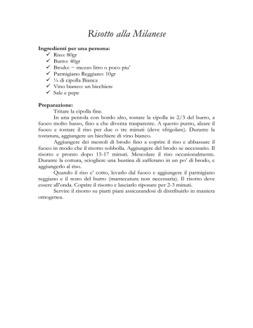 Risotto alla Milanese Ingredienti per una persona: Riso: 80gr Burro: 40gr Brodo: ~ mezzo litro o poco piu’ Parmigiano Reggiano: 10gr ¼ di cipolla Bianca Vino bianco: un bicchiere Sale e pepe Preparazione: Tritare la cipolla fine. In una pentola con bordo alto, tostare la cipolla in 2/3 del burro, a fuoco molto basso, fino a che diventa trasparente. A questo punto, alzare il fuoco e tostare il riso per due o tre minuti (deve sfrigolare). Durante la tostatura, aggiungere un bicchiere di vino bianco. Aggiungere dei mestoli di brodo fino a coprire il riso e abbassare il fuoco in modo che il risotto sobbolla. Aggiungere del brodo se necessario. Il risotto e pronto dopo 15-17 minuti. Mescolare il riso occasionalmente. Durante la cottura, sciogliere una bustina di zafferano in un po’ di brodo, e aggiungerlo al riso. Quando il riso e’ cotto, levarlo dal fuoco e aggiungere il parmigiano reggiano e il resto del burro (mantecatura non necessaria). Il risotto deve essere all’onda. Coprire il risotto e lasciarlo riposare per 2-3 minuti. Servire il risotto su piatti piani assicurandosi di distribuirlo in maniera omogenea. Risotto alla Milanese Ingredients (for one person): Rice (carnaroli o Arborio): 80gr Butter: 40gr. Stock (beef or vegetable): 1/2L or a bit more Grated Parmesan Cheese: 10gr ¼ white onion White wine: a glass Salt and pepper Preparation: Finely chop the onion. In a deep pot, toast the chopped onion in 2/3 of the butter at very low heat, until the onion is transparent. At this stage, increase the heat to high and toast the rice for 2-3 minutes. During this process, add a glass of white whine. Add the stock until the rice is covered, decrease the heat to low so that the rice bubbles (small bubbles). Add more stock as necessary during the cooking. Dilute some sapphron into a glass with some stock, and pour into the cooking rice. Risotto will be ready in 15-17 minutes. Stir occasionally during cooking. When the rice is ready, remove it from the heat, add the parmesan cheese, and the remaining butter (the butter is facultative). Cover the pot and let it rest for 2-3 minutes. The rice should be creamy. Serve the risotto on a flat plate, and make sure to spread it evenly on the plate.
