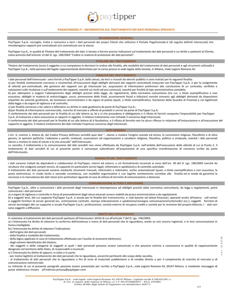 PAGACOMODO.IT - INFORMATIVA SUL TRATTAMENTO DEI DATI PERSONALI (PRIVACY) INFORMAZIONI GENERALI PayTipper S.p.A. raccoglie, tratta e comunica a terzi i dati personali dei propri Clienti che utilizzino il Portale PagaComodo.it (di seguito definiti Interessati) che intrattengono rapporti pre-contrattuali e/o contrattuali con la stessa. PayTipper S.p.A., in qualità di Titolare del trattamento dei dati, è tenuto a fornire precise indicazioni sul trattamento dei dati personali e sui diritti a spettanti al Cliente, come previsto dall’articolo 13 del D. Lgs. 196/2003 “Codice in materia di protezione dei dati personali”. TITOLARE DEL TRATTAMENTO Titolare del trattamento (ossia il soggetto a cui competono le decisioni in ordine alla finalità, alla modalità del trattamento di dati personali e agli strumenti utilizzati) è PayTipper S.p.A., nella persona del legale rappresentante domiciliato per la carica presso la sede legale della Società, in Milano, Viale Legioni Romane 43. FINALITÀ DEL TRATTAMENTO I dati personali dell’Interessato sono forniti a PayTipper S.p.A. dallo stesso, da terzi o ricavati da elenchi pubblici e sono trattati per le seguenti finalità: a) per finalità strettamente connesse e strumentali all’esecuzione degli obblighi derivanti dai rapporti contrattuali instaurati con PayTipper S.p.A. o per lo svolgimento di attività pre-contrattuali, alla gestione dei rapporti con gli Interessati (es. acquisizioni di informazioni preliminari alla conclusione di un contratto, verifiche e valutazioni sulle risultanze e sull’andamento dei rapporti, nonché sui rischi ad essi connessi), nonché per finalità di tipo amministrativo contabile; b) per adempiere o esigere l’adempimento degli obblighi previsti dalla legge, da regolamenti, dalla normativa comunitaria (tra cui, a titolo esemplificativo e non esaustivo, obblighi in materia di antiriciclaggio, usura, prevenzione delle frodi, accertamenti fiscali e tributari) nonché connessi agli obblighi derivanti da disposizioni impartite da autorità giudiziarie, da funzionari amministrativi o da organi di polizia (quali, a titolo esemplificativo, funzionari della Guardia di Finanza) a ciò legittimati dalla legge o da organi di vigilanza e di controllo; c) per finalità connesse a far valere o difendere un diritto in sede giudiziaria da parte di PayTipper S.p.A.; d) per finalità di informazione commerciale, ricerche di mercato e offerte di prodotti e servizi da parte di PayTipper S.p.A. Il conferimento dei dati personali per le finalità di cui alle lettere a), b) e c) che precedono è obbligatorio e il rifiuto di fornirli comporta l’impossibilità per PayTipper S.p.A. di instaurare e dare esecuzione ai rapporti in oggetto. Il relativo trattamento non richiede il consenso degli Interessati. Il conferimento dei dati personali per le finalità di cui alla lettera d) è facoltativo, e il rifiuto di fornirlo non ha alcun riflesso in relazione all’instaurazione e all’esecuzione del rapporto in oggetto. Il relativo trattamento dei dati richiede l’espresso consenso degli Interessati. DATI SENSIBILI L'art. 4, comma 1, lettera d), del Codice Privacy definisce sensibili quei dati “...idonei a rivelare l'origine razziale ed etnica, le convinzioni religiose, filosofiche o di altro genere, le opinioni politiche, l'adesione a partiti, sindacati, associazioni od organizzazioni a carattere religioso, filosofico, politico o sindacale, nonché i dati personali idonei a rivelare lo stato di salute e la vita sessuale” dell’Interessato. La raccolta, il trattamento e la comunicazione del dati sensibili non viene effettuata da PayTipper S.p.A. nell’ambito dell’esecuzione delle attività di cui al Punto 2. Il trattamento di dati sensibili di cui al presente punto è comunque subordinato all’acquisizione di una specifica manifestazione di consenso scritto da parte dell’Interessato. MODALITÀ DEL TRATTAMENTO I dati saranno trattati da dipendenti e collaboratori di PayTipper, interni ed esterni, a ciò formalmente incaricati ai sensi dell’art. 30 del D. Lgs. 196/2003 nonché da strutture che svolgono compiti tecnici, di supporto (in particolare servizi legali, informatici e spedizioni) e di controllo aziendale. Il trattamento dei dati personali avviene mediante strumenti manuali, informatici e telematici, anche automatizzati (quali, a titolo esemplificativo e non esaustivo, la posta elettronica), in modo lecito e secondo correttezza, con modalità organizzative e con logiche strettamente correlate alle finalità ed in modo da garantire la sicurezza e la riservatezza dei dati stessi (con particolare riguardo al caso di utilizzo di tecniche di comunicazione a distanza). COMUNICAZIONE AI TERZI E DIFFUSIONE PayTipper S.p.A., oltre a comunicare i dati personali degli Interessati in ottemperanza ad obblighi previsti dalla normativa comunitaria, da leggi e regolamenti, potrà comunicare i dati personali: a) a organi di vigilanza e controllo in forza di provvedimenti dagli stessi emanati ovvero stabiliti da prassi amministrative o da regolamenti. b) a soggetti terzi, del cui supporto PayTipper S.p.A. si avvale per le finalità del trattamento, e cioè banche ed istituti finanziari, operanti anche all'estero; call center e soggetti fornitori di servizi generali (es. archiviazione contratti, stampa imbustamento e spedizione/consegna comunicazioni/carte/codici ecc.); soggetti fornitori di servizi tecnologici del cui supporto si avvale PayTipper S.p.A.; professionisti, società esterne di recupero crediti e società per la revisione del proprio bilancio. I dati non sono soggetti a diffusione. PayTipper S.p.A. - sede legale: viale Legioni Romane 43, 20147 Milano - Capitale sociale € 368.421,00 i. v. N. iscr. al registro delle imprese di Milano, c.f. e P. IVA 07338820967 – R.E.A. 1951883 Iscritto all’Albo degli Istituti di Pagamento con identificativo 36017.2 1/3 v e r . 1/ 2 0 16 DIRITTI DELL’INTERESSATO In relazione al trattamento dei