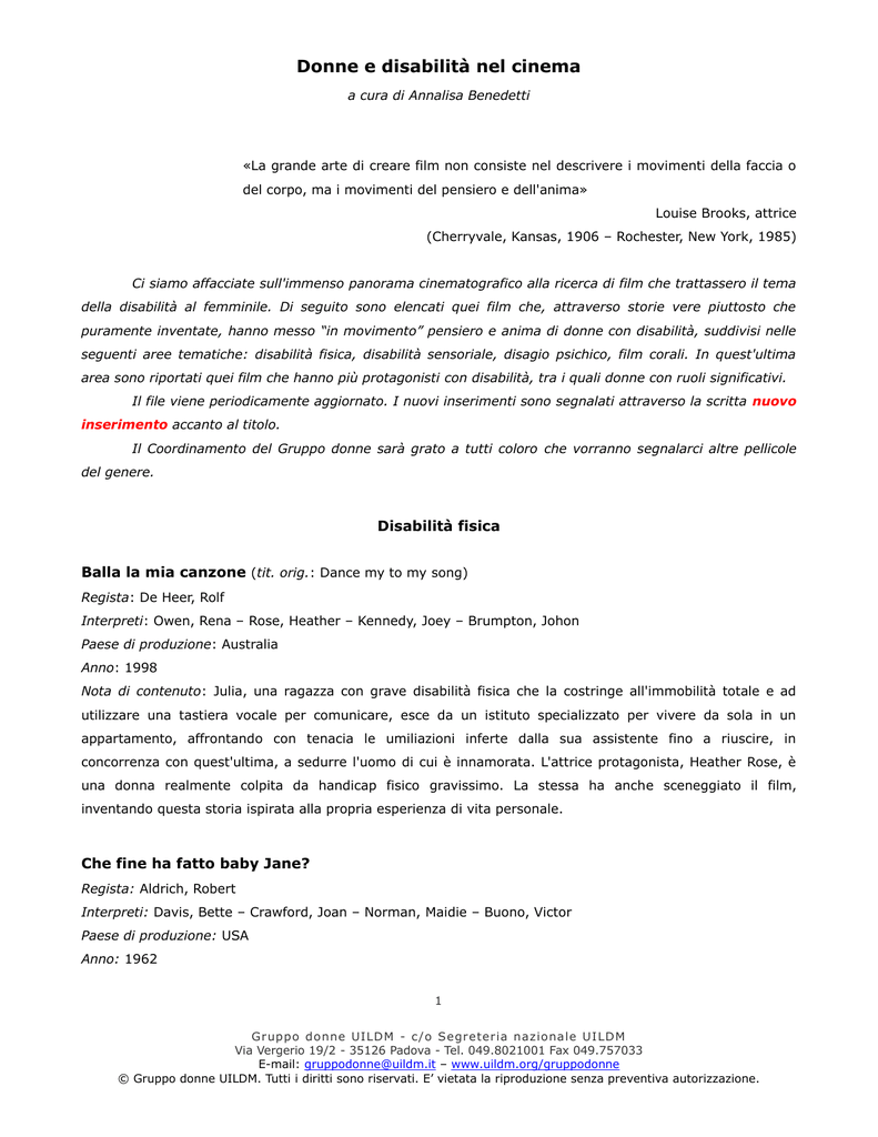 Donne e disabilità nel cinema a cura di Annalisa Benedetti «La grande arte di creare film non consiste nel descrivere i movimenti della faccia o del corpo, ma i movimenti del pensiero e dell'anima» Louise Brooks, attrice (Cherryvale, Kansas, 1906 – Rochester, New York, 1985) Ci siamo affacciate sull'immenso panorama cinematografico alla ricerca di film che trattassero il tema della disabilità al femminile. Di seguito sono elencati quei film che, attraverso storie vere piuttosto che puramente inventate, hanno messo “in movimento” pensiero e anima di donne con disabilità, suddivisi nelle seguenti aree tematiche: disabilità fisica, disabilità sensoriale, disagio psichico, film corali. In quest'ultima area sono riportati quei film che hanno più protagonisti con disabilità, tra i quali donne con ruoli significativi. Il file viene periodicamente aggiornato. I nuovi inserimenti sono segnalati attraverso la scritta nuovo inserimento accanto al titolo. Il Coordinamento del Gruppo donne sarà grato a tutti coloro che vorranno segnalarci altre pellicole del genere. Disabilità fisica Balla la mia canzone (tit. orig.: Dance my to my song) Regista: De Heer, Rolf Interpreti: Owen, Rena – Rose, Heather – Kennedy, Joey – Brumpton, Johon Paese di produzione: Australia Anno: 1998 Nota di contenuto: Julia, una ragazza con grave disabilità fisica che la costringe all'immobilità totale e ad utilizzare una tastiera vocale per comunicare, esce da un istituto specializzato per vivere da sola in un appartamento, affrontando con tenacia le umiliazioni inferte dalla sua assistente fino a riuscire, in concorrenza con quest'ultima, a sedurre l'uomo di cui è innamorata. L'attrice protagonista, Heather Rose, è una donna realmente colpita da handicap fisico gravissimo. La stessa ha anche sceneggiato il film, inventando questa storia ispirata alla propria esperienza di vita personale. Che fine ha fatto baby Jane? Regista: Aldrich, Robert Interpreti: Davis, Bette – Crawford, Joan – Norman, Maidie – Buono, Victor Paese di produzione: USA Anno: 1962 1 Gruppo donne UI LDM - c/o Segreteria nazionale UILDM Via Vergerio 19/2 - 35126 Padova - Tel. 049.8021001 Fax 049.757033 E-mail: [email protected] – www.uildm.org/gruppodonne © Gruppo donne UILDM. Tutti i diritti sono riservati. E’ vietata la riproduzione senza preventiva autorizzazione. Nota di contenuto: La dolce e fragile Blanche, paralizzata alle gambe a causa di un incidente, vive con la sorella Jane, ex bambina prodigio in arte Babe Jane. Quest'ultima, ultrasessantenne, alcolizzata e mentalmente disturbata, sottopone la sorella a macabre angherie, convinta che sia stata lei a “rubarle” la popolarità quando, da adolescente, si afferma anch'essa come attrice nella Hollywood degli anni '30. L’indifesa Blanche tenta in tutti i modi di persuadere la sorella a farsi curare in una clinica psichiatrica, ma Jane non ne vuol sapere e arriva perfino ad uccidere una domestica. A questo punto la situazione precipita. In un momento di regressione infantile, Jane porta la sorella in spiaggia dove crede di esser tornata ai tempi in cui da piccola cantava sulla riva del mare destando l'attenzione e l'ammirazione dei bagnanti. È in questo momento che Blanche, ormai in fin di vita, confessa alla sorella la verità sulla dinamica dell’incidente che la rese invalida: colpo di scena finale! Dalla vita in poi Regista: Lazzotti, Gianfrancesco Interpreti: Capotondi, Cristina – Nigro, Filippo – Romanoff, Nicoletta – Insegno, Pino – Cinelli, Gianni Paese di produzione: Italia Anno: 2010 Nota di contenuto: Danilo, in carcere per scontare una pena di trent'anni, riceve una lettera d'amore al giorno dalla sua fidanzata Rosalba la quale però ricorre alla sua migliore amica Katia – paraplegica in carrozzina – per scriverle. Ben presto Katia, come Cirano De Bergerac, si ritrova innamorata del destinatario. Quando Rosalba e Danilo si lasciano, Katia decide di andarlo a conoscere, lottando contro i rigidi regolamenti del carcere per ottenere il permesso di incontrarlo. Dopo il primo emozionante incontro, ne seguiranno altri, difficili e per niente intimi. Alla fine anche Danilo si innamora di Katia. I due decidono di sposarsi. Danilo tenterà una fuga, ma nel breve periodo di latitanza, ha modo di riflettere sulla propria vita e sul senso di certe scelte, che lo porteranno a prendere una decisione importante e definitiva. Donna scimmia, La Regista: Ferreri, Marco Interpreti: Tognazzi, Ugo – Girardot, Annie – Majeroni, Achille Paese di produzione: Italia: Anno: 1964 Nota di contenuto: Maria, viene ritrovata in un monastero, completamente ricoperta di pelo. Antonio Focaccia decide di sposarla per esporla come un fenomeno da baraccone. Tra i due nasce l'amore. Avranno anche un bambino. Maria muore di parto e il figlio non le sopravvive. Antonio Focaccia continuerà a girare per mostrare le due creature imbalsamate. Il produttore Carlo Ponti impose che quest'ultima parte fosse eliminata. Il film si chiude con la morte della donna barbuta. Esiste anche un'edizione francese con lieto fine, dove Maria perde il pelo. Scritto dal regista Ferreri, con Rafael Arcona. Freak Regista: Browning, Tom 2 Gruppo donne UI LDM - c/o Segreteria nazionale UILDM Via Vergerio 19/2 - 35126 Padova - Tel. 049.8021001 Fax 049.757033 E-mail: [email protected] – www.uildm.org/gruppodonne © Gruppo donne UILDM. Tutti i diritti sono riservati. E’ vietata la riproduzione senza preventiva autorizzazione Interpreti: Ford, Wallace – Ates, Roscoe – Baclanova, Olga Paese di produzione: USA Anno: 1932 Nota di contenuto: la cinica trapezista di un circo, finge di amare un nano, lo sposa per impossessarsi del suo denaro e, con la complicità di un atleta, lo avvelena. La vendetta degli amici del nano è tremenda. Infieriranno sui loro corpi riducendoli dei “mostri”, come loro. Inno alla mostruosità innocente contro la normalità colpevole. Film maledetto e leggendario. Un
