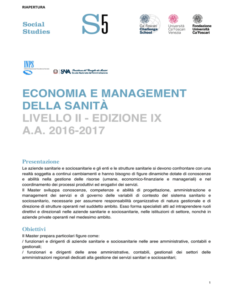 ECONOMIA E MANAGEMENT DELLA SANITÀ LIVELLO II - EDIZIONE IX A.A. 2016-201 2017 Presentazione Le aziende sanitarie e sociosanitarie e gli enti e le strutture sanitarie si devono confrontare con una realtà soggetta a continui cambiamenti e hanno bisogno di figure dinamiche dotate di conoscenze e abilità nella gestione delle risorse (umane, economico-finanziarie economico finanziarie e manageriali) e nel coordinamento dei processi produttivi ed erogativi dei servizi. Il Master sviluppa conoscenze, competenze e abilità di progettazione, amministrazione e management dei servizi e di governo delle variabili di contesto del sistema sanitario e sociosanitario, necessarie per assumere responsabilità organizzative organizzative di natura gestionale e di direzione di strutture operanti nel suddetto ambito. Esso forma specialisti atti ad intraprendere ruoli direttivi e direzionali nelle aziende sanitarie e sociosanitarie, nelle istituzioni di settore, nonché in aziende private operanti peranti nel medesimo ambito. Obiettivi Il Master prepara particolari figure come: / funzionari e dirigenti di aziende sanitarie e sociosanitarie nelle aree amministrative, contabili e gestionali; / funzionari e dirigenti delle aree amministrative, contabili, gestionali dei settori delle amministrazioni regionali dedicati alla gestione dei servizi sanitari e sociosanitari; 1 / funzionari e dirigenti negli ambiti delle amministrazioni locali che si interfacciano con le unità operative delle aziende sanitarie e sociosanitarie; / esperti e consulenti in materia di economia sanitaria e di politiche di integrazione sociosanitaria; / esperti nel campo della ricerca economica e manageriale in ambito sanitario e sociosanitario nazionale ed internazionale; / manager di aziende sanitarie e sociosanitarie aventi carattere privato (cliniche private, centri di diagnostica, case di cura etc.); / manager ed esperti di aziende fornitrici che hanno continuità di relazioni con le aziende sanitarie e sociosanitarie. Questi ruoli professionali sono indirizzati prevalentemente al settore pubblico ma rivestono significativo interesse anche per il settore privato, for profit e non-profit. Articolazione delle attività didattiche INSEGNAMENTO 1 Principi di Economia Politica, Economia aziendale, Statistica Obiettivi: fornire una preparazione di base per omogeneizzare le conoscenze dell’aula sulle diverse discipline coinvolte nel Master. MODULO 1: Economia Aziendale MODULO 2: Economia MODULO 3: Statistica INSEGNAMENTO 2 Analisi economica dei sistemi sanitari e sociosanitari Obiettivi: fornire le conoscenze e le competenze per: • Analisi economica delle macrocomponenti dei sistemi sanitari • Analisi dei fattori demografici ed epidemiologici • Analisi della domanda e dell’offerta di salute. MODULO 1: Analisi economica delle macrocomponenti dei sistemi sanitari MODULO 2: Analisi dei fattori demografici ed epidemiologici MODULO 3: Analisi della domanda e dell’offerta di salute 2 INSEGNAMENTO 3 Laboratorio in Health Technology Assessment Obiettivi: il laboratorio fornisce le conoscenze e le competenze di base per: • Fondamenti della valutazione economica in sanità • Approcci disciplinari all'Health technology assessment • Mercato dei farmaci e la valutazione economica delle innovazioni farmaceutiche • Analisi Costi-Benefici • Analisi Costo-Efficacia e Analisi Costo-Utilità • Metodi per la valutazione economica dei programmi sanitari. MODULO 1: Differenti approcci all'Health Technology assessment MODULO 2: Valutazione economica dei farmaci MODULO 3: Metodi di analisi economica INSEGNAMENTO 4 Governance del Servizio Sanitario Nazionale Obiettivi: fornire le conoscenze riguardanti: • L'evoluzione del SSN e la struttura del sistema • La tutela del diritto alla salute • L'Accountability e il ruolo degli attori istituzionali nei modelli di governance sanitaria. MODULO 1: Evoluzione del SSN e struttura del sistema MODULO 2: La tutela del diritto alla salute MODULO 3: Accountability e ruolo degli attori istituzionali nei modelli di governance sanitaria INSEGNAMENTO 5 Laboratorio di Welfare e Integrazione Sociosanitaria Obiettivi: fornire le conoscenze riguardanti: • Sistemi di welfare, dinamiche e politiche dell’integrazione socio-sanitaria • La progettazione dei servizi di integrazione sociosanitaria • Il monitoraggio e la valutazione dei servizi sociosanitari • Le organizzazioni non-profit che operano nel sociosanitario MODULO 1: Sistemi di welfare e dinamiche dell’integrazione sociosanitaria MODULO 2: Progettazione dei servizi al elevata integrazione sociosanitaria MODULO 3: Il monitoraggio e la valutazione dei servizi sociosanitari MODULO 4: Profili manageriali delle organizzazioni non-profit nel sociosanitario 3 INSEGNAMENTO 6 Management delle aziende sanitarie pubbliche Obiettivi: fornire le conoscenze relative a: • Tipologia e modelli di governance aziendale • Norme e regole per il governo e l’organizzazione • Attività contrattuale e responsabilità • Contabilità e bilancio • Organizzazione, funzioni e attività • Elaborazione dei dati informativi • Gestione dei servizi sanitari MODULO 1: Aziende, assetti istituzionali e modelli di governance aziendale MODULO 2: Norme e regole per il governo e l’organizzazione MODULO 3: Attività contrattuale e responsabilità MODULO 4: Organizzazione e risorse umane MODULO 5: Marketing e comunicazione MODULO 6: Internal audit e risk management nelle aziende sanitarie MODULO 7: Contabilità e bilancio MODULO 8: Elaborazione dei dati informativi MODULO 9: ICT, informatizzazione e e-health MODULO 10: Gestione dei servizi sanitari territoriali ed ospedalieri INSEGNAMENTO 7 Strategie, programmazione e performance management nelle aziende sanitarie pubbliche Obiettivi: fornire le conoscenze e le competenze sull'utilizzo di strumenti e metodi di programmazione e controllo di gestione e di misurazione e valutazione delle performance nelle aziende sanita