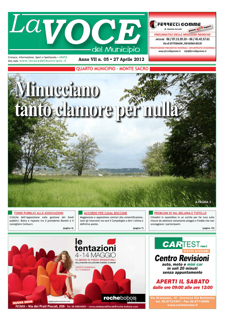 Cronaca, Informazione, Informazione, Sport Cronaca, SporteeSpettacolo Spettacolo••GRATIS GRATIS Sito web: web: w ww ww. w. l a v o c e d e l m muunniicciippiioo..iitt Sito Anno • 27 Aprile 2012 Anno VIVII n. n. 0405 • 25 Febbraio 2011 QUARTO QUARTOMUNICIPIO MUNICIPIO--MONTE MONTESACRO SACRO Quel pasticciaccio delle strade private Minucciano tanto clamore per nulla A PAGINA 8 A PAGINA 3 Costretti a farsi 14 piani a piedi Presto il prolungamento di via Ojetti Edificio occupato per farne uno studentato A largo San Giusto 10, palazzo Ater con ascensore FONDI PUBBLICI ASSOCIAZIONI sempre rotto: arrivatoALLE al piano prescelto le porte Critiche dell’opposizione sulla gestione dei fondi non si aprono I cantieri stanno completando l’opera. ACCORDO PER CASAL con BOCCONE Resta solo la connessione la Nomentana Maggioranza e opposizione contrari alla cementificazione, nei pressi della Citroën È in via Monte Meta 21, uno stabile di proprietà PROBLEMI VAL MELAINA E TUFELLO del Comune, DI inutilizzato da tempo. Ennesimo Cittadini in assemblea in un cortile per far luce sulle confronto politico (pagina 4) (pagina 7) (pagina 10) pubblici. Botta e risposta tra il presidente Bonelli e il (PAGINA 7) consigliere Corbucci. tanti gli interventi ma sarà il Campidoglio a dire l’ultima (PAGINAe12) definitiva parola. misure da adottare nonostante pioggia e freddo (PAGINA che non 14) scoraggiano i partecipanti. APERTI IL SABATO dalle ore 09:00 alle ore 12:00 pagina 2 Venerdì 27 Aprile 2012 Spettacoli, musica ed eventi per festeggiare la città eterna Roma, buon 2765°compleanno Grande festa in via dei Fori Imperiali lo scorso weekend. Tanti gli artisti in scena. A condurre la serata, Pino Insegno. F esta di musica, spettacoli, luci e colori il 21 aprile ai Fori Imperiali per festeggiare il 2765°com- pleanno della città eterna. Presenti Luca Barbarossa, Maurizio Battista, Mario Biondi, Elena Bonelli, Paolo Bonolis, Lorella Cuccarini, Lando Fiorini, Simona Marchini, Enrico Montesano, Andrea Morricone, Ennio Morricone, Andrea Perrozzi e tanti altri personaggi dello spettacolo. Gli artisti si sono esibiti durante la manifestazione “Le stelle di Roma” ai Mercati di Traiano, esprimendo con musica e racconti il loro legame con la città. A condurre la serata il presentatore Pino Insegno. Come ogni anno i romani hanno potuto assistere ai numerosi spettacoli e alle performance musicali o approfittare dell’ingresso gratuito dei musei civici per tutto il weekend. Fitti e variegati gli appuntamenti per ricordare la nascita della città: rievocazioni storiche, mostre, visite didattiche, laboratori per ragazzi e percorsi ad hoc lungo le vi. Tanta la musica. Il “Aeterna Roma” con le sale dello Spazio Roma Circo Massimo è stato performance del Coro Eventi - Fontana di Tre- la cornice del concerto Polifonico dell’associa- Con l’arrivo delle belle giornate è importante evitare acqua stagnante sui balconi e per strada Zanzara tigre, c’è il rischio di malattie infettive Per rendere efficaci le misure, i trattamenti larvicidi devono iniziare già in aprile. Permane l’obbligo di comunicazione al Servizio “Controllo Specie Infestanti “ anche a carico dei condomini C on la bella stagione ritorna all’attacco l’Aedes albopictus, meglio conosciuta come “zanzara tigre”. Il fastidioso insetto giunto nel 1997 dal Sud –Est Asiatico ha trovato subito cittadinanza nel territorio capitolino a causa del clima mite e della vastità delle aree con acqua stagnante. Proprio per contrastare l’infestazione della città, il sindaco di Roma, Gianni Alemanno, ha emanato l’ordinanza n°73 del 14/03/2012. Prevenire la diffusione della zanzara tigre è fondamentale per “intervenire a tutela della salute e dell’igiene pubblica, per prevenire e controllare malattie infettive trasmissibili all’uomo”- chiarisce il testo dell’ordinanza. Soggetti pubblici e privati, imprese, proprietari di cantieri, aree dismesse o di parcheggio, depositi, vivai e allevatori di animali sono chiamati ad evitare l’abbandono di contenitori di qualsiasi natura in luoghi dove potrebbe accumularsi acqua piovana. Ai cittadini si chiede di svuotare vasi e sottovasi in casa e nei cimiteri, di liberare pesci larvivori come i comuni pesci rossi nelle fontane ornamentali o nei laghetti artificiali e di curare la manutenzione di grondaie, tombini e cantine. Occorre pulire con cura i recipienti per evitare che le uova deposte in inverno si schiudano in primavera con l’esposizione di piante sui balconi. Antonella Brandonisio Firmato in Campidoglio un protocollo d’intesa con Confcommercio Roma Invitati i cittadini romani a denunciare gli usurai In programma tra le altre iniziative, il rilancio della rete di protezione degli Sportelli di prevenzione dell’usura e del sovraindebitamento già attivi in varie zone della città F Via Annibale M. di Francia, 62 00138 Roma Anno VII - n.5 - 27 Aprile 2012 Direttore Nicola Sciannamè 392 912 44 74 e-mail: [email protected] Direttore Responsabile Mario Baccianini Editore Edizioni Periodiche Locali Edizione IV Municipio Direzione Via Radicofani, 209 - 00138 Roma Tel. 06.8819301 Pubblicità 392 912 44 74 Redazione e-mail: [email protected] Registrazione presso il Tribunale Civile di Roma n. 263/2005 Stampa: Centro Rotoweb Tivoli Terme irmato in Campidoglio un protocollo d’intesa sulle azioni comuni da intraprendere nella lotta al racket e all’usura. A siglare l’atto, il sindaco di Roma Gianni Ale- manno e il presidente di Confcommercio Roma, Giuseppe Roscioli. Il protocollo avrà durata biennale ed è aperto all’adesione di tutte le associazioni di categoria interessate. Far emergere le estorsioni, incoraggiare le denuncie, sostenere quanti sono caduti nelle mani degli usurai, diffondere la cultura della legalità e offrire soluzioni in caso di necessità sono gli obiettivi dell’iniziativa. Previste anche attività di studio, ricerca e formazione relative ai fenomeni del rack