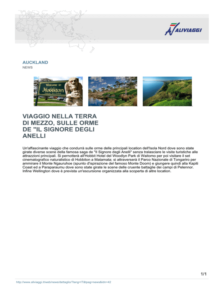 AUCKLAND NEWS VIAGGIO NELLA TERRA DI MEZZO, SULLE ORME DE "IL SIGNORE DEGLI ANELLI Un'affascinante viaggio che condurrà sulle orme delle principali location dell'Isola Nord dove sono state girate diverse scene della famosa saga de "Il Signore degli Anelli" senza tralasciare le visite turistiche alle attrazzioni principali. Si pernotterà all'Hobbit Hotel del Woodlyn Park di Waitomo per poi visitare il set cinematografico naturalistico di Hobbiton a Matamata; si attraverserà il Parco Nazionale di Tongariro per ammirare il Monte Ngauruhoe (spunto d'ispirazione del famoso Monte Doom) e giungere quindi alla Kapiti Coast ed a Paraparaumu dove sono state girate le scene delle cruente battaglie dei campi di Pelennor. Infine Wellington dove è prevista un'escursione organizzata alla scoperta di altre location. 1/1 http://www.aliviaggi.it/web/news/dettaglio/?lang=IT&tpag=news&idn=42