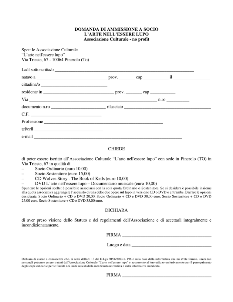 DOMANDA DI AMMISSIONE A SOCIO L’ARTE NELL’ESSERE LUPO Associazione Culturale - no profit Spett.le Associazione Culturale “L’arte nell'essere lupo” Via Trieste, 67 - 10064 Pinerolo (To) La/il sottoscritta/o _____________________________________________________________ nata/o a _______________________________ prov. _______ cap ___________ il ________________ cittadina/o _____________________________ residente in _______________________________ prov. _______ cap ___________ Via ________________________________________________________ n.ro __________ documento n.ro ________________________ rilasciato ______________________________________ C.F. _______________________________ Professione ____________________________________________________ tel/cell ______________________________ e-mail _________________________________________________________________ CHIEDE di poter essere iscritto all’Associazione Culturale “L’arte nell'essere lupo” con sede in Pinerolo (TO) in Via Trieste, 67 in qualità di – Socio Ordinario (euro 10,00) – Socio Sostenitore (euro 15,00) – CD Wolves Story - The Book of Kells (euro 10,00) – DVD L’arte nell’essere lupo – Documentario musicale (euro 10,00) Spuntare le opzioni scelte: è possibile associarsi con la sola quota Ordinario o Sostenitore. Se si desidera è possibile insieme alla quota associativa aggiungere l’acquisto di una delle due opere sul lupo in versione CD o DVD o entrambe. Barrare le opzioni desiderate. Socio Ordinario + CD o DVD 20,00. Socio Ordinario + CD e DVD 30,00 euro. Socio Sostenitore + CD o DVD 25,00 euro. Socio Sostenitore + CD e DVD 35,00 euro. DICHIARA di aver preso visione dello Statuto e dei regolamenti dell'Associazione e di accettarli integralmente e incondizionatamente. FIRMA _______________________________________ Luogo e data ___________________________________ Dichiaro di essere a conoscenza che, ai sensi dell'art. 13 del D.Lgs 30/06/2003 n. 196 e sulla base della informativa che mi avete fornito, i miei dati personali potranno essere trattati dall'Associazione Culturale "L'arte nell'essere lupo" e acconsento al loro utilizzo esclusivamente per il perseguimento degli scopi statutari e per le finalità nei limiti indicati dalla menzionata normativa e dalla informativa suindicata. FIRMA _______________________________________