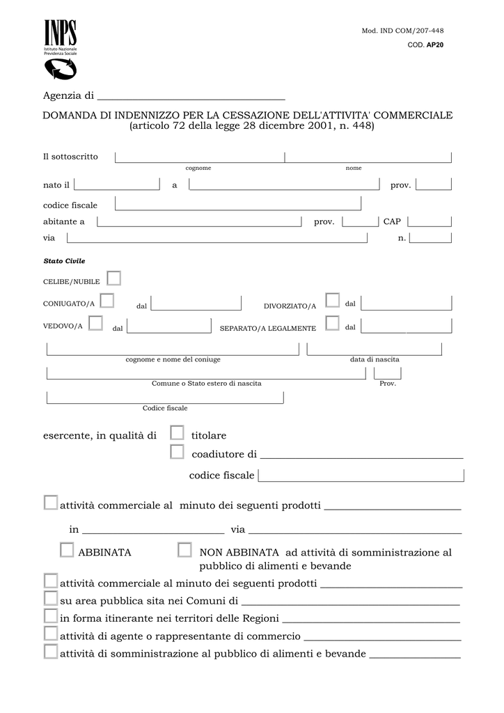 Mod. IND COM/207-448 COD. AP20 Istituto Nazionale Previdenza Sociale Agenzia di _____________________________________ DOMANDA DI INDENNIZZO PER LA CESSAZIONE DELL'ATTIVITA' COMMERCIALE (articolo 72 della legge 28 dicembre 2001, n. 448) Il sottoscritto cognome nato il nome a prov. codice fiscale abitante a prov. CAP via n. Stato Civile o CONIUGATO/A o VEDOVO/A o dal CELIBE/NUBILE dal DIVORZIATO/A SEPARATO/A LEGALMENTE cognome e nome del coniuge Comune o Stato estero di nascita o o dal dal data di nascita Prov. Codice fiscale esercente, in qualità di o o titolare coadiutore di ________________________________________ codice fiscale o attività commerciale al minuto dei seguenti prodotti ___________________________ in ____________________________ via __________________________________________ o ABBINATA o NON ABBINATA ad attività di somministrazione al pubblico di alimenti e bevande o attività commerciale al minuto dei seguenti prodotti ____________________________ o su area pubblica sita nei Comuni di ___________________________________________ o in forma itinerante nei territori delle Regioni ___________________________________ o attività di agente o rappresentante di commercio _______________________________ o attività di somministrazione al pubblico di alimenti e bevande __________________ CHIEDE a norma dell’articolo 72 della legge 28 dicembre 2001, n. 448, l'erogazione dell'indennizzo previsto dal decreto legislativo 28 marzo 1996,n. 207, per la cessazione dell'attività commerciale. Il sottoscritto DICHIARA che: o l'attività commerciale è cessata definitivamente il (gg/mm/aaaa) _______________________; o l'autorizzazione per l'esercizio dell'attività commerciale e per la somministrazione al pubblico di alimenti e bevande è stata riconsegnata al Comune di _______________________________________ il (gg/mm/aaaa)______________(allegare dichiarazione rilasciata dal Sindaco del Comune); o la comunicazione di cessazione dell’attività è stata inviata al Comune di ___________ _________________________________ rilasciata dal Sindaco del Comune; il (gg/mm/aaaa) ______________ (allegare dichiarazione o il titolare dell'attività è stato cancellato dal registro degli esercenti il commercio presso la Camera di commercio, industria, artigianato e agricoltura di _______________________________________ il (gg/mm/aaaa) __________________ (allegare copia dell’attestazione dell’avvenuta cancellazione ovvero dichiarazione, rilasciata dalla Camera di commercio, dell’avvenuta presentazione della domanda di cancellazione); o il titolare dell’attività è stato cancellato dal ruolo provinciale degli agenti e dei rappresentanti di commercio presso la Camera di commercio, industria, artigianato e agricoltura di ______________________________ il (gg/mm/aaaa)______________ (allegare copia dell’attestazione dell’avvenuta cancellazione ovvero dichiarazione, rilasciata dalla Camera di commercio, dell’avvenuta presentazione della domanda di cancellazione); o il titolare dell’attività è stato cancellato dal registro delle imprese presso la Camera di commercio, industria, artigianato e agricoltura di ___________________________________ il (gg/mm/aaaa)_________________________ (allegare copia dell'attestazione dell'avvenuta cancellazione ovvero dichiarazione, rilasciata dalla Camera di Commercio, dell'avvenuta presentazione della domanda di cancellazione). Il sottoscritto dichiara inoltre di NON SVOLGERE nessuna attività di lavoro autonomo o subordinato. Il sottoscritto, consapevole delle sanzioni civili e penali previste per coloro che rendono attestazioni false, dichiara, sotto la propria responsabilità, che le notizie fornite sono complete e veritiere. Il sottoscritto si impegna a comunicare, entro 30 giorni dal suo verificarsi, la ripresa di una attività lavorativa, dipendente o autonoma. Il sottoscritto è consapevole che l'omessa o incompleta comunicazione di fatti influenti sul diritto all'indennizzo comporta, oltre alle responsabilità previste dalla legge, il recupero delle somme riscosse indebitamente. Data _________________ Firma ______________________________________