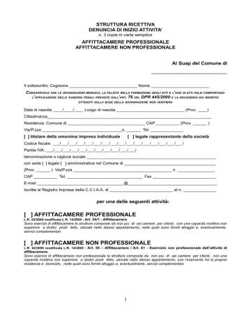 STRUTTURA RICETTIVA DENUNCIA DI INIZIO ATTIVITA’ n. 3 copie in carta semplice AFFITTACAMERE PROFESSIONALE AFFITTACAMERE NON PROFESSIONALE Al Suap del Comune di ___________________________ Il sottoscritto: Cognome _____________________________ Nome _________________________ CONSAPEVOLE CHE LE DICHIARAZIONI MENDACI, LA FALSITÀ NELLA FORMAZIONE DEGLI ATTI E L’USO DI ATTI FALSI COMPORTANO L’APPLICAZIONE DELLE SANZIONI PENALI PREVISTE DALL’ART. 76 DEL DPR 445/2000 E LA DECADENZA DAI BENEFICI OTTENUTI SULLA BASE DELLA DICHIARAZIONE NON VERITIERA Data di nascita ____/____/____ Luogo di nascita _____________________________ (Prov. ____) Cittadinanza______________________________________________________________________ Residenza: Comune di _________________________________ CAP __________ (Prov. ______ ) Via/P.zza __________________________________n. ______ Tel. ______________ [ ] titolare della omonima impresa individuale [ ] legale rappresentante della società Codice fiscale: ___/___/___/___/___/___/___/___/___/___/___/___/___/___/___/___/ Partita IVA: ___/___/___/___/___/___/___/___/___/___/___/ denominazione o ragione sociale _______________________________________________________ con sede [ ] legale [ ] amministrativa nel Comune di _______________________________________ (Prov. ______ ) Via/P.zza __________________________________________ n. ________________ CAP __________ Tel. ________________________________ Fax ___________________________ E-mail _____________________________________@______________________________________ Iscritta al Registro Imprese della C.C.I.A.A. di ___________________________ al n. ______________ per una delle seguenti attività: [ ] AFFITTACAMERE PROFESSIONALE L.R. 42/2000 modificata L.R. 14/2005 : Art. 55/1 - Affittacamere Sono esercizi di affittacamere le strutture composte da non piu` di sei camere per clienti, con una capacità ricettiva non superiore a dodici posti letto, ubicate nello stesso appartamento, nelle quali sono forniti alloggio e, eventualmente, servizi complementari. [ ] AFFITTACAMERE NON PROFESSIONALE L.R. 42/2000 modificata L.R. 14/2005 : Art. 55 – Affittacamere / Art. 61 - Esercizio non professionale dell’attività di affittacamere. Sono esercizi di affittacamere non professionale le strutture composte da non piu` di sei camere per clienti, con una capacità ricettiva non superiore a dodici posti letto, ubicate nello stesso appartamento, ove l’esercente ha la propria residenza e domicilio, nelle quali sono forniti alloggio e, eventualmente, servizi complementari. 1 COMUNICA [ ] AVVIO ATTIVITÀ [ ] MODIFICHE (ai locali, alla ricettività…) Breve descrizione dell’operazione: _________________________________________________________ ______________________________________________________________________________________ ______________________________________________________________________________________ ______________________________________________________________________________________ con inizio dell’attività/dell’attività modificata dalla data: [ ] di presentazione della presente DIA [ ] dalla data del ________________ [ ] dalla data che sarà successivamente comunicata tramite l’allegato modello Attenzione: presso la struttura ricettiva deve essere esposta in modo ben visibile all’esterno l’insegna o la targa con la denominazione nonché l’indicazione della tipologia e del livello di classificazione. Il sottoscritto dichiara pertanto di aver presentato: [ ] contestuale domanda di autorizzazione/dia [ ] di essere abilitato all’installazione/mantenimento dell’insegna/targa ai sensi dell’atto del__________ n. ______ rilasciato da _______________________________________________ per l'installazione dell'insegna/targa di esercizio relativa alla presente struttura ricettiva. *(senza necessità che risulti definito il relativo procedimento). DATI RELATIVI AGLI IMMOBILI ED AI TERRENI Struttura sita in ____________________ Via _______________________________ n. _________ Piano: Terreno [ ] Primo [ ] Secondo [ ] Terzo [ ] Quarto [ ] ___________ [ ] [ ] catasto terreni [ ] catasto fabbricati - Foglio di mappa ________________________________ particella/e _________________________________________sub. _________________________. 2 DATI RELATIVI ALLA STRUTTURA RICETTIVA Camere n. ________di cui: Singole con bagno Doppie con bagno Triple con bagno Quadruple con bagno _______ ________ ________ ________ Doppie senza bagno ________ Triple senza bagno Quadruple senza bagno ________ ________ Singole senza bagno _______ Altre camere con posti letto n.________ con bagni Altre camere con posti letto n.________ senza bagno n.________ Note : ______________________________________________________________________________________ ______________________________________________________________________________________ ______________________________________________________________________________________ Totale posti letto n. _________ Totale bagni Privati n. ______ Totale bagni Comuni n. _____ DICHIARA: - che la DENOMINAZIONE della struttura ricettiva è _________________________________ _______________________________________________________________________________; nel rispetto di quanto previsto dall’art. 13 del Regolamento Regionale di attuazione della Legge Regionale n. 42/2000; - che la struttura ricettiva è in possesso dei requisiti igienico edilizi previsti per le case di civile abitazione, nonché i requisiti minimi previsti dal regolamento regionale di attuazione della L.R.42/2000; - che la struttura ricettiva è in possesso dei requisiti in materia di igiene e sanità, urbanistica ed edilizia e rispetta quanto previsto dalle vigenti disposizioni normative, anche per quanto attiene alla prevenzione incendi; [ ] che è stata rilasciata la certificazione di abitabilità/agibilità come risulta dalla seguente documentazione:________________________________________________________________________ ________________________________