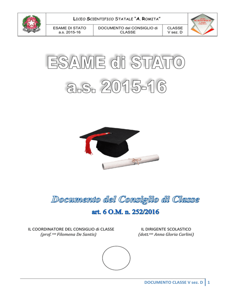 IL COORDINATORE DEL CONSIGLIO di CLASSE (prof. ssa Filomena De Santis) IL DIRIGENTE SCOLASTICO (dott.ssa Anna Gloria Carlini) DOCUMENTO CLASSE V sez. D 1 LICEO SCIENTIFICO STATALE “A. ROMITA”