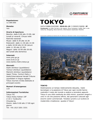 #THECITY# Do you want to reach everyone from Italy that travels abroad? Our unique media can help! Contact: [email protected] #DOANDSEE# Make your trip start at home | www.arrivalguides.com Make your trip start at home | www.arrivalguides.com #EATING# Make your trip start at home | www.arrivalguides.com #CAFES# Make your trip start at home | www.arrivalguides.com #BARSANDNIGHTLIFE# Make your trip start at home | www.arrivalguides.com #SHOPPING# Make your trip start at home | www.arrivalguides.com #SLEEPING# Make your trip start at home | www.arrivalguides.com Make your trip start at home | www.arrivalguides.com Make your trip start at home | www.arrivalguides.com Make your trip start at home | www.arrivalguides.com uk u ni-d ōr i A B Me jiro -dō Science Museum (Kagaku Gijutsukan) KITANOMARUKŌEN National Garden (Kitanomarukōen) HITOTSUBASHI C K MITOSHIROCHŌ Lo op KANDANISHIKICHŌ Inn er ay K TACHŌ K TSUKASA- ri ib Uch dō ori- Ötebori D K KITANORIMONOCHŌ NIHOMBASHIMUROMACHI an jō sen o ō ri ku t ri-d so Kō bo Currency Museum hi n k NIHOM- NIHOMBASHI (2) ai- BASHI (1) dō ri Eit ri Chūō Hakusan-dōri Moat ri NIHOMBASHI ri M bo 1 NIHOMBASHI (3) dō Museum of Art (Bridgestone) KYŌBASHI (1) KYŌBASHI (2) a- GINZA (1) K MIKURACHŌ K KONYACHO KAJICHO Y ae su- YAESU (1) Park YAESU ri YAESU (2) -dō National Film Center (Tokyo Kokuritsu Kindai Bijutsukan) KYŌBASHI (3) Ka jiba shi s NIHOMBASHINONGOKUCHŌ to So Central Station dō ri iMACHI eise dah Kan UCHIKANDA a ur Ok ri oa t Tokyo Central -d ō Communications Museum (Teishin Sōgō Hakubutsukan) e ssw Exp r ŌTEMACHI Eit ai-dō ri MARUNOUCHI MARUNOUCHI (2) ōri jibas hi-d Ka Museum of Arts (Idemitsu) su at ri ad ō GINZA (3) of Art GINZA Museum (Ginza Melsa) M ri-dōr i Y as KUDANMINAMI 1 Crafts Gallery (Kogeikan) i YŪRAKUCHŌ Ha i-d ru m ōr i GINZA (5) y MARUNOUCHI (1) Science Museum Hibyia SANBANCHŌ East Garden of the Imperial Palace (Kōkyo Higashi Gyoen) National Museum of Modern Art (Kokuritsu Kindai Bijutsukan) CHIYODA-KU Imperial Palace (Kokyo) KŌKYOGAIEN ri Museum of Art (Yamatane) Imperial Gardens (Fukiage) ku ra d CHIYODA Sa Imperial Palace Plaza (Kōkyomae-Hiroba) Uc Hib h iya i b oridōr Moat i Hibiyakōen Concert Hall (Hibiya) HIBIYAKŌEN ia-dō Hiby ICHIBANCHŌ 2 HAKABUSACHŌ National Theater 3 C1 TORANOMON KASUMIGASEKI Parliamentary Museum (Kensei Kinenkan) NAGATACHŌ 250 m n ōri ōw Sh No ay 4 4 0 ri -Dō ūō Ch ad ose Ch i ōr ad ōw Sh re ss w Exp ri 1U en ūō -Dō ri ri -dō ori tob So Dō ōū -dōri ri oat ri-dōr i oat Sotobo Ch saki M Baba ri by Hi ō ri Uchibo -bori M Hanzo Hongō -dō ori tob d ōr ia- -dō ori hib Uc ri-dōr i -dō ri So ri -dō go Ata a-d ad kur Sa Uchibo