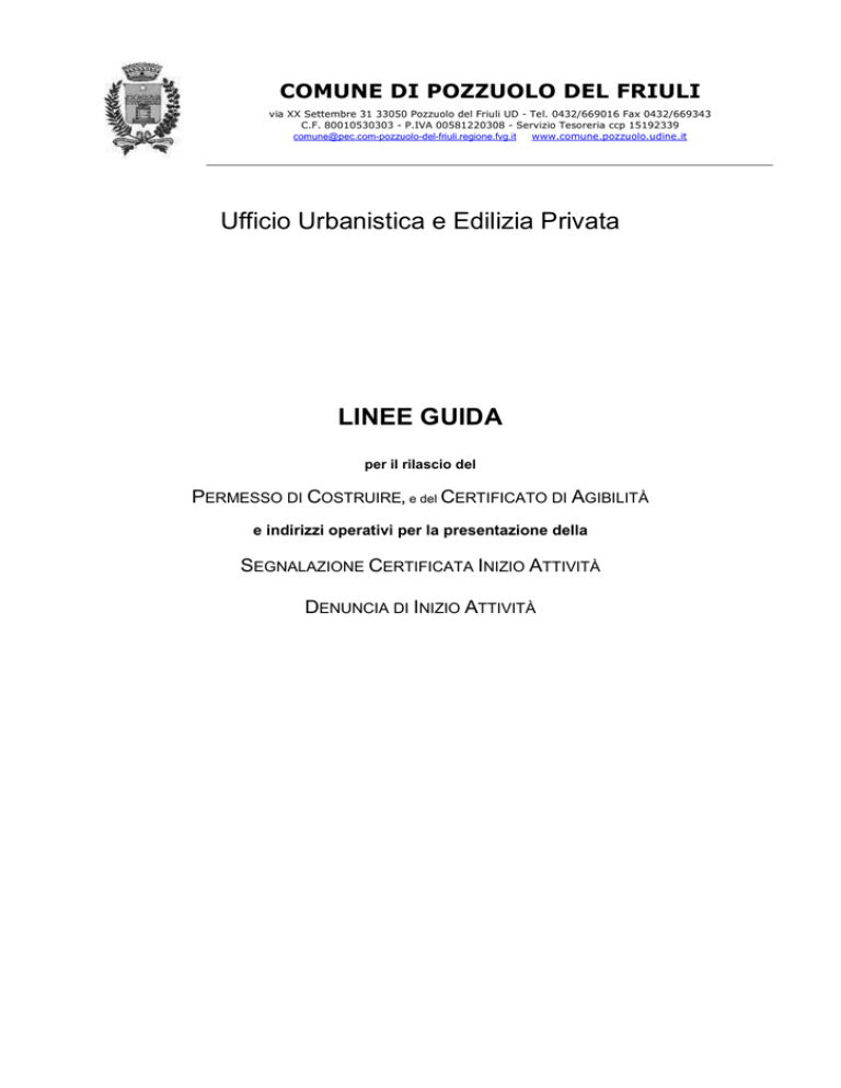COMUNE DI POZZUOLO DEL FRIULI via XX Settembre 31 33050 Pozzuolo del Friuli UD - Tel. 0432/669016 Fax 0432/669343 C.F. 80010530303 - P.IVA 00581220308 - Servizio Tesoreria ccp 15192339 [email protected] www.comune.pozzuolo.udine.it Ufficio Urbanistica e Edilizia Privata LINEE GUIDA per il rilascio del PERMESSO DI COSTRUIRE, e del CERTIFICATO DI AGIBILITÀ e indirizzi operativi per la presentazione della SEGNALAZIONE CERTIFICATA INIZIO ATTIVITÀ DENUNCIA DI INIZIO ATTIVITÀ CHI E’ LEGITTIMATO A RICHIEDERE O PRESENTARE PRATICHE PER LA REALIZZAZIONE DI OPERE EDILIZIE A norma dell’art. 21 della L.R. 19/2009 il permesso di costruire è rilasciato al proprietario dell’immobile o a chi abbia titolo per richiederlo. La domanda può essere presentata dal proprietario dell’area o dell’immobile, dal comproprietario con le maggioranze previste dalle leggi civili (con la maggioranza dei 2/3 del valore della cosa - da indicare nella domanda di permesso di costruire - per gli interventi di ampliamento, ristrutturazione, per la realizzazione di pertinenze di edifici esistenti, per la recinzione di fondi), dai titolari di diritti reali di godimento anche se attribuiti da leggi speciali nei limiti in cui tali diritti consentano la facoltà di edificare, da chi vi abbia titolo per provvedimento dell’autorità o del giudice. Possono richiedere il permesso di costruire: − I TITOLARI DI DIRITTI REALI DI GODIMENTO COME IL SUPERFICIARIO, L’ENFITEUTA, L’USUFRUTTUARIO, L’USUARIO, IL TITOLARE DEL DIRITTO REALE DI ABITAZIONE, − IL TITOLARE DI UNA SERVITÙ VOLONTARIA O COATTIVA LIMITATAMENTE ALLE OPERE NECESSARIE PER L’ESERCIZIO DI TALE DIRITTO, − L’ASSEGNATARIO A RISCATTO DI ALLOGGIO ECONOMICO O POPOLARE, − IL LOCATARIO PER RIPARAZIONI URGENTI AI SENSI DELL’ART. 1577 C.C. DANDO CONTEMPORANEAMENTE AVVISO AL LOCATORE. Possono richiedere il permesso di costruire, autocertificando che il proprio titolo ricomprende anche tale potere: − L’AFFITTUARIO COLTIVATORE DIRETTO, − IL TITOLARE DI UN CONTRATTO PRELIMINARE DI COMPRAVENDITA REGISTRATO E TRASCRITTO, − IL CONCESSIONARIO DI BENI DEMANIALI, − IL LOCATARIO IL CUI CONTRATTO CONTENGA L’AUTORIZZAZIONE ESPRESSA DEL PROPRIETARIO, − IL COMODATARIO, − L’AMMINISTRATORE DEL CONDOMINIO AI SENSI DEGLI ARTT. 1130 E 1131 C.C.. Può richiedere il permesso di costruire il procuratore dei soggetti sopraindicati, tramite procura in bollo non autenticata, da allegare all’istanza. Gli stessi soggetti sono legittimati a presentare la comunicazione di esecuzione attività edilizia libera, denuncia di inizio attività o la segnalazione certificata di inizio attività. Per le installazioni di forme pubblicitarie e tende ha titolo a effettuare la denuncia di inizio attività anche l'affittuario. La ditta installatrice/la ditta pubblicizzata non hanno alcun titolo per effettuare la denuncia e pertanto sono estranee nei confronti di questa Amministrazione: i rapporti intercorrenti tra queste ditte e il titolare di uno dei sopra elencati diritti sono e restano indifferenti a questa Amministrazione. 2 COMUNE DI POZZUOLO DEL FRIULI Tabellina riepilogativa delle opere edilizie e atto autorizzativo necessario ATTIVITÀ EDILIZIA LIBERA Descrizione M ANUTENZIONE ORDINARIA M ANUTENZIONE STRAORDINARIA priva di rilevanza strutturale ai sensi delle leggi di settore ELIMINAZIONE DI BARRIERE ARCHITETTONICHE che non alterino la sagoma dell’edificio OPERE TEMPORANEE per attività di ricerca nel sottosuolo che abbiano carattere geognostico o siano seguite in aree esterne al centro edificato per un limite massimo di un anno OPERE DI BONIFICA, MOVIMENTAZIONE Titolo abilitativo Riferimenti normativi L.R. 19/09 art. 4 c. 2 lett. a) Nessuno Nessuno Attività non soggetta ad autorizzazione paesaggistica (ex D.Lgs. 42/2004 se non altera lo stato dei luoghi e l’aspetto esteriore degli edifici) Soggetta a D.M. 37/08 per eventuali impianti Vedi nota 2 Opera soggetta a comunicazione al Comune con obbligo di presentazione di relazione asseverata ed elaborato L.R. 19/09 art. 4 c. 2 lett. a bis) grafico. Opere soggette a eventuali autorizzazioni paesaggistico-ambientali Nessuno L.R. 19/09 art. 16 lett. b) Opere soggette a eventuali autorizzazioni paesaggistico-ambientali L.R. 19/09 art. 16 lett. c) Nessuno Opere soggette a eventuali autorizzazioni paesaggistico-ambientali E SISTEMAZIONE DEL TERRENO strettamente pertinenti all’esercizio dell’attività agricola e le pratiche agrosilvo-pastorali che non superino i 2.000 metri cubi di movimentazione complessiva di terreno e che non comportino una sostituzione dello strato superficiale superiore a un metro SERRE MOBILI STAGIONALI, sprovviste di strutture in muratura, funzionali allo svolgimento di attività agricola e pratiche agrosilvo-pastorali con esclusione degli interventi che comportano trasformazione di aree boscate DEPOSITI TEMPORANEI DI MERCI O DI MATERIALI a cielo aperto, esclusi i rifiuti per un tempo non superiore a dodici mesi DEPOSITI O ESPOSIZIONI PERMANENTI DI MATERIALI O DI MERCI a cielo aperto, realizzati all’interno delle zone destinate ad attività produttive o commerciali connessi alle attività esercitate nel rispetto delle altezze e delle distanze prescritte dal PRGC per tali zone Note Nessuno L.R. 19/09 art. 16 lett. d) Nessuno L.R. 19/09 art. 16 lett. d) Nessuno L.R. 19/09 art. 16 lett. e) Opere soggette a eventuali autorizzazioni paesaggistico-ambientali Opere soggette a eventuali autorizzazioni paesaggistico-ambientali L.R. 19/09 art. 16 lett. e) Nessuno 3 Descrizione Titolo abilitativo Riferimenti normativi Opere soggette a TULPS (R.D. 06.05.1940, n. 635) OPERE CARATTERIZZATE DA PRECARIETÀ STRUTTURALE E FUNZIONALE, dirette a soddisfare esigenze contingenti e temporanee per lo svolgimento di attività, di manifestazioni culturali e sportive soggette unicamente alle autorizzazioni previste dal Testo unico delle leggi di pubblica sicurezza e destinate a essere immediatamente rimosse al cessare 