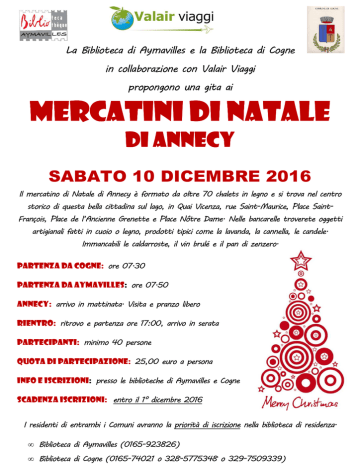 La Biblioteca di Aymavilles e la Biblioteca di Cogne in collaborazione con Valair Viaggi propongono una gita ai MERCATINI DI NATALE di ANNECY SABATO 10 DICEMBRE 2016 Il mercatino di Natale di Annecy è formato da oltre 70 chalets in legno e si trova nel centro storico di questa bella cittadina sul lago, in Quai Vicenza, rue Saint-Maurice, Place SaintFrançois, Place de l’Ancienne Grenette e Place Nôtre Dame. Nelle bancarelle troverete oggetti artigianali fatti in cuoio o legno, prodotti tipici come la lavanda, la cannella, le candele. Immancabili le caldarroste, il vin brulé e il pan di zenzero. PARTENZA DA COGNE: ore 07.30 PARTENZA DA AYMAVILLES: ore 07.50 ANNECY: arrivo in mattinata. Visita e pranzo libero RIENTRO: ritrovo e partenza ore 17:00, arrivo in serata PARTECIPANTI: minimo 40 persone QUOTA DI PARTECIPAZIONE: 25,00 euro a persona INFO e ISCRIZIONI: presso le biblioteche di Aymavilles e Cogne SCADENZA ISCRIZIONI: entro il 1° dicembre 2016 I residenti di entrambi i Comuni avranno la priorità di iscrizione nella biblioteca di residenza. • Biblioteca di Aymavilles (0165-923826) • Biblioteca di Cogne (0165-74021 o 328-5775348 o 329-7509339)