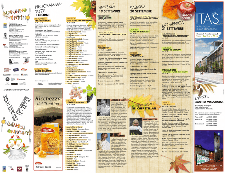 Comune di Trento COMUNE DI TRENTO Servizio Cultura, Turismo e Politiche giovanili Tel. 0461 884290 [email protected] www.comune.trento.it STRADA DEL VINO E DEI SAPORI DEL TRENTINO Via della Villa, 6 - Trento Tel. 0461 921863 www.stradavinotrentino.com Informazioni: Ufficio Relazioni con il Pubblico Via Manci, 2 - 38100 Trento Tel. 0461 884453 - Fax 0461 884457 N. verde 800 017615 In collaborazione con Media Partner 10.30 - 22.30 Chi preferisce gustare una proposta veloce 100% trentina non avrà che l’imbarazzo della scelta! Lo speck che non ti aspetti Speck cotto e Magerspeck con confettura L'alpeggio Caprino bio, 50 - 50, Vezzena, ricotta affumicata con miele In riva al lago Salmerino, tartare di trota, lavarello con mele “La Trentina” Carna salada alle mele “La Trentina” Spätlze alle verdure e Trentingrana Polenta Carbonera Strudel di pasta matta con mele “La Trentina” Trancetto di Torta Sacher Gelato artigianale allo yogurt con frutti di bosco Pane dell’Associazione Panificatori della Provincia di Trento Tutti i giorni in diretta da piazza C. Battisti. www.radiodolomiti.it Con la partecipazione di: Consorzio Vini del Trentino Istituto Trentodoc Associazione Panificatori della Provincia di Trento 10.30 - 22.30 Un luogo di incontro dove poter degustare i vini, il Trentodoc, le birre artigianali e gli sciroppi di frutta prodotti dai soci della Strada del vino e dei sapori del Trentino: Abate Nero Spumanti - Trento Az. Agr. Cesconi - Lavis Az. Agr. De Vescovi - Ulzbach Mezzocorona Az. Agr. Francesco Poli - Vezzano Az. Agr. Letrari - Rovereto Az. Agr. Maso Bergamini - Trento Az. Agr. Maso Furli - Lavis Az. Agr. Moser - Trento Az. Agr. Pisoni - Lasino Az. Agr. Pojer e Sandri - Faedo Az. Agr. Grigoletti - Nomi Az. Agr. Zeni Roberto - San Michele a/A Az. Vin. Del Revì - Aldeno Az. Vin. Bailoni - Trento Birra del Bosco - San Michele a/A Bolognani Az. Vin. - Lavis Cà dei Baghi - Az. Agr. Valcanover Pergine Valsugana Cantina d‘Isera Cantina Sociale di Trento Cantine Ferrari - F.lli Lunelli - Trento Cavit - Trento CEMBRA cantina di montagna - Cembra Maso Martis Az. Agr. - Trento Endrizzi - San Michele a/A Soc. Agr. Zanotelli - Cembra Vivallis - Nogaredo ore 11.00 I campioni di Dolomiti Energia Basket Trento si sfidano ai fornelli cucinando ricette trentine aiutati da un “coach” d’eccezione: chef Diego Zottele dell’Agritur Rincher di Roncegno Terme. Guidati da un sommelier avrete la possibilità di scoprire come nasce il Trentodoc, lo spumante metodo classico trentino. ore 16.30 ore 17.30 Aperitivo a base di Trentodoc in compagnia dei campioni di Dolomiti Energia Basket Trento. ore 19.00 e ore 21.00 Il menù di Leandro Luppi del Ristorante Vecchia Malcesine di Malcesine (VR) in abbinamento ai vini di Cavit di Trento. “Il tonno” del Garda con misticanza, mimosa d'uovo e cipolla rossa marinata Spaghetti Monograno Felicetti Matt alla carbonara di lago Lavarello al tartufo nero della Valle dei Laghi, maionese di patate, porcini e caviale di Trota Oro Minestrone di mele e zenzero Pane dell’Associazione Panificatori della Provincia di Trento, Acqua Levico, Brao Caffè, Casa del Caffè. Il menù viene proposto a € 50,00 Per info e prenotazioni: cell. 349-3209290. Gli chef dovranno dimostrare la propria abilità ai fornelli ma anche sfoderare tutto il loro estro creativo nella realizzazione di una proposta culinaria. Si sfidano in gara: Enrico Croatti, Ristorante DV di Madonna di Campiglio ore 16.30 ore 19.00 e ore 21.00 Il menù di Norbert Niederkofler del Ristorante St. Hubertus di San Cassiano in Badia (BZ) in abbinamento ai vini di Endrizzi di San Michele a/A. C’era una volta una trota. Un itinerario enogastronomico lungo il quale poter scoprire i sapori che caratterizzano la Strada del vino e dei sapori del Trentino, parlare con i produttori e acquistare una selezione di prodotti trentini, dal miele ai vini, dalla grappa alla verdura, dall’olio extravergine di oliva ai prodotti ittici, dai salumi ai formaggi, dalla birra artigianale alla frutta. Presso il negozio Gusto Trentino potrai acquistare le bevande in degustazione presso l’enoteca “Un sorso di Trentino” e alcuni prodotti di: Agraria Riva del Garda Agritur Rincher - Roncegno Terme Apicoltura Peterlini - Rovereto As.T.A. - Asparagicoltori Trentini Associati Az. Agr. Le Mandre - Bedollo Az. Agr. Thomas Capra - Carzano Az. Agr. Troticoltura Armanini - Storo Birra del Bosco - San Michele a/A Cà dei Baghi - Az. Agr. Valcanover Caseificio di Sabbionara Delizie del Baldo - Brentonico Distilleria G. Bertagnolli - Mezzocorona La Trentina Macelleria Cis - Ledro Macelleria Sighel - Baselga di Pinè OlioCRU - Arco Panificio Moderno - Rovereto Panificio Sosi - Trento Pastificio Felicetti - Predazzo Teddy Bier - Mori Trota Oro - Preore Norbert Niederkofler, nato nel 1961 a Luttago (Alto Adige), ha raggiunto in pochissimo tempo la cerchia ristretta dei migliori chef al mondo. Successivamente ha lavorato per 3 anni per Alfons Schuhbeck, a Sylt per Jörg Müller, a Monaco di Baviera per Eckart Witzigmann al Ristorante Aubergine e per Nadia Santini al Ristorante Il Pescatore. Dopo aver operato a New York con David Bouley nel 1993 fece finalmente ritorno in Alto Adige come chef nello Sporthotel Teresa e al Ciastel Colz a La Villa. Dal 1994 lavora nell’Hotel & Spa Rosa Alpina (dal 2000 fa parte della rinomata associazione Relais & Châteaux), dove nel 1996 ha inaugurato come chef il Ristorante St. Hubertus. Gli chef dovranno dimostrare la propria abilità ai fornelli ma anche sfoderare tutto il loro estro nella realizzazione di una proposta culinaria. Si sfidano in gara: Federico Parolari, Osteria a Le Due Spade Stefano Ghetta, Ristorante L’Chimpl di Vigo di Fassa Fusilli di farro Monograno Felicetti alla carbonara tirolese. Costicina di bue brasata, purè di ortiche, salsa al vino rosso. Yogurt, mais, erba di grano. Pane dell’Associazione Panificatori della Provincia di Trento, Acqua Levico, Brao Caffè, Casa