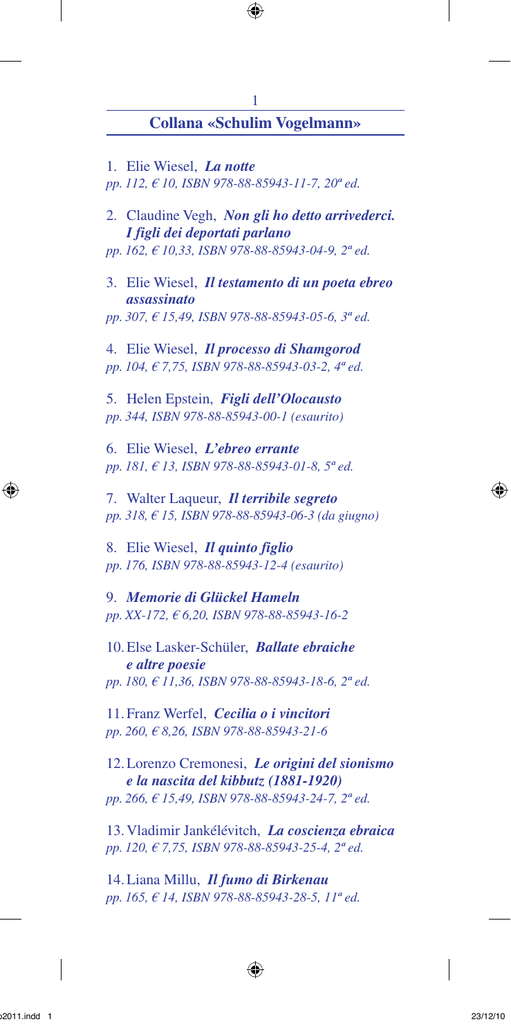 o2011.indd 1 1 Collana «Schulim Vogelmann» 1. Elie Wiesel, La notte pp.112, € 10, ISBN 978-88-85943-11-7, 20ª ed. 2. C laudine Vegh, Non gli ho detto arrivederci. I figli dei deportati parlano pp.162, € 10,33, ISBN 978-88-85943-04-9, 2ª ed. 3. E lie Wiesel, Il testamento di un poeta ebreo assassinato pp.307, € 15,49, ISBN 978-88-85943-05-6, 3ª ed. 4. Elie Wiesel, Il processo di Shamgorod pp.104, € 7,75, ISBN 978-88-85943-03-2, 4ª ed. 5. Helen Epstein, Figli dell’Olocausto pp.344, ISBN 978-88-85943-00-1 (esaurito) 6. Elie Wiesel, L’ebreo errante pp.181, € 13, ISBN 978-88-85943-01-8, 5ª ed. 7. Walter Laqueur, Il terribile segreto pp.318, € 15, ISBN 978-88-85943-06-3 (da giugno) 8. Elie Wiesel, Il quinto figlio pp.176, ISBN 978-88-85943-12-4 (esaurito) 9. Memorie di Glückel Hameln pp.XX-172, € 6,20, ISBN 978-88-85943-16-2 10.Else Lasker-Schüler, Ballate ebraiche e altre poesie pp.180, € 11,36, ISBN 978-88-85943-18-6, 2ª ed. 11.Franz Werfel, Cecilia o i vincitori pp.260, € 8,26, ISBN 978-88-85943-21-6 12.Lorenzo Cremonesi, Le origini del sionismo e la nascita del kibbutz (1881-1920) pp.266, € 15,49, ISBN 978-88-85943-24-7, 2ª ed. 13.Vladimir Jankélévitch, La coscienza ebraica pp.120, € 7,75, ISBN 978-88-85943-25-4, 2ª ed. 14.Liana Millu, Il fumo di Birkenau pp.165, € 14, ISBN 978-88-85943-28-5, 11ª ed. 23/12/10 o2011.indd 2 2 Collana «Schulim Vogelmann» 15.Elie Wiesel, Credere o non credere 28. pp.200, € 14, ISBN 978-88-85943-29-2, 2ª ed. pp. 16.Vladimir Jankélévitch, Perdonare? 29. pp.70, € 7, ISBN 978-88-85943-32-2, 2ª ed. 17.A. B. Yehoshua, Il poeta continua a tacere pp.151, ISBN 978-88-85943-35-7 (esaurito) 18.Giuliana Tedeschi, C’è un punto della terra... Una donna nel Lager di Birkenau pp.167, € 12, ISBN 978-88-85943-39-1, 3ª ed. 19.Elie Wiesel, Cinque figure bibliche pp.129, € 9,30, ISBN 978-88-85943-40-7, 2ª ed. 20.George L. Mosse, Il dialogo ebraico-tedesco. Da Goethe a Hitler pp.124, € 8,26, ISBN 978-88-85943-38-4, 2ª ed. 21.Leslie A. Fiedler, L’ultimo ebreo in America pp.83, € 5,16, ISBN 978-88-85943-44-5 22.Jona Oberski, Anni d’infanzia. Un bambino nei lager pp.120, € 10, ISBN 978-88-85943-49-0, 9ª ed. 23.Elie Wiesel, La città della fortuna pp. 30. pp. 31. pp. 32. pp. 33. pp. 34. pp. 35. pp. 36. pp. pp.181, € 10,33, ISBN 978-88-85943-51-3 37. 24.Jakob Hessing, La maledizione del profeta. Tre saggi su Freud 38. pp.342, € 15,49, ISBN 978-88-85943-37-7 25.A. B. Yehoshua, Elogio della normalità. Saggi sulla Diaspora e Israele pp. pp. 39. pp.154, € 12, ISBN 978-88-85943-55-1, 2ª ed. pp. 26.George L. Mosse, Ebrei in Germania fra assimilazione e antisemitismo 40. pp.275, € 15,49, ISBN 978-88-85943-56-8 pp. 27.Hugh Nissenson, L’elefante e la mia questione ebraica 41. pp.260, € 15,49, ISBN 978-88-85943-57-5 pp. 23/12/10 a... co. ca . o2011.indd 3 3 Collana «Schulim Vogelmann» 28.Rivkah Schärf Kluger, Psiche e Bibbia pp.143, € 10,33, ISBN 978-88-85943-59-9 29.Józef Hen, L’occhio di Dayan pp.198, € 12,91, ISBN 978-88-85943-62-9 30.Jean Baumgarten, Lo yiddish pp.124, € 9,30, ISBN 978-88-85943-68-1, 2ª ed. 31.Jacob Neusner, I fondamenti del giudaismo pp.172, ISBN 978-88-85943-70-4 (esaurito) 32.David Vital, Il futuro degli ebrei pp.155, € 11,88, ISBN 978-88-85943-71-1 33.Siegmund Hurwitz, Psiche e redenzione pp.175, € 12,91, ISBN 978-88-85943-72-8 34.Alter Kacyzne, L’opera dell’ebreo pp.108, € 7,75, ISBN 978-88-85943-74-2 35.Hanna Krall, Ipnosi e altre storie pp.227, € 15, ISBN 978-88-85943-75-9 36.Else Lasker-Schüler, La Terra degli Ebrei pp.167, € 12,91, ISBN 978-88-85943-78-0 37.Giacoma Limentani, Nachman racconta pp.94, € 7,75, ISBN 978-88-85943-81-0 38.Fausto Coen, 16 ottobre 1943. La grande razzia degli ebrei di Roma pp.154, € 10, ISBN 978-88-85943-85-8, 2ª ed. 39.Karl E. Grözinger, Kafka e la Cabbalà pp.239, € 15,49, ISBN 978-88-85943-84-1 40.Józef Hen, Via Nowolipie. A Varsavia prima del ghetto pp.320, ISBN 978-88-85943-91-9 (esaurito) 41.J. Riemer e G. Dreifuss, Abramo: l’uomo e il simbolo pp.167, € 12,39, ISBN 978-88-85943-89-6 23/12/10 o2011.indd 4 4 Collana «Schulim Vogelmann» 42.Mireille Hadas-Lebel, Storia della lingua ebraica pp.146, ISBN 978-88-85943-94-0 (esaurito) 54. pp. 55. 43.Ernest Gugenheim, L’ebraismo nella vita quotidiana pp. pp.188, € 14, ISBN 978-88-8057-000-4, 3ª ed. 56. pp. 44.Henryk Grynberg, Ritratti di famiglia pp.281, ISBN 978-88-85943-99-5 (esaurito) 57. 45.Lawrence Kushner, In questo luogo c’era Dio e io non lo sapevo. Sette commenti a Genesi 28,16 pp. pp.179, € 12,91, ISBN 978-88-85943-97-1 58. pp. 46.Shemuel Y. Agnon, Le storie del Baal Shem Tov pp.321, € 15,49, ISBN 978-88-8057-002-8 59. 47.Yitzhak Katzenelson, Il canto del popolo ebraico massacrato pp. pp.208, testo yiddish traslitterato e in caratteri ebraici, € 13,43, ISBN 978-88-8057-003-5, 2ª ed. 60. 48.Hertha Feiner, Mie carissime bambine. Lettere alle figlie prima della deportazione (1939-1942) 61. pp.103, € 7,75, ISBN 978-88-8057-004-2 pp. 49.Hanna Krall, La festa non è la vostra 62. pp.165, € 13, ISBN 978-88-8057-005-9 50.Roland Goetschel, La Cabbalà pp. pp. pp.131, € 10, ISBN 978-88-8057-006-6, 2ª ed. 63. 51.Friedrich G. Friedmann, Da Cohen a Benjamin. Essere ebrei tedeschi pp. pp.116, € 7,75, ISBN 978-88-8057-007-3 64. 52.Shemuel Y. Agnon, Racconti di Kippur pp.122, € 10,33, ISBN 978-88-8057-008-0 53.Viktor E. Frankl, Sincronizzazione a Birkenwald pp.61, € 5,16, ISBN 978-88-8057-011-0 pp. 65. pp. 66. pp. 23/12/10 Dio i Tov 5 Collana «Schulim Vogelmann» 54.Irène Némirovsky, Un bambino prodigio pp.67, € 8, ISBN 978-88-8057-018-9, 3ª ed. 55.Günther Anders, Noi figli di Eichmann pp.108, € 10, ISBN 978-88-8057-020-2, 2ª ed. 56.Yossel Birstein, Il cappotto del principe pp.103, € 7,75, ISBN 978-88-8057-025-7 57.Gustav Dreifuss, Maschio e femmina li creò. L’amore e i suoi simboli nelle scritture ebraiche pp.137, ISBN 978-88-805