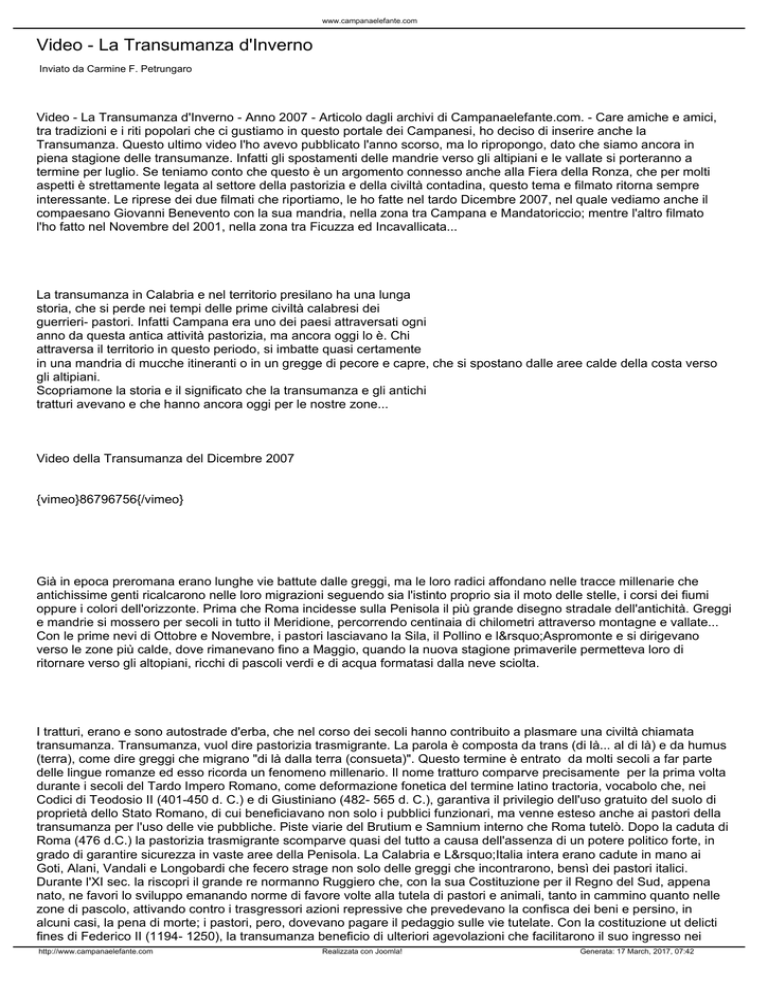 Video - La Transumanza d'Inverno - Anno 2007 - Articolo dagli archivi di Campanaelefante.com. - Care amiche e amici,