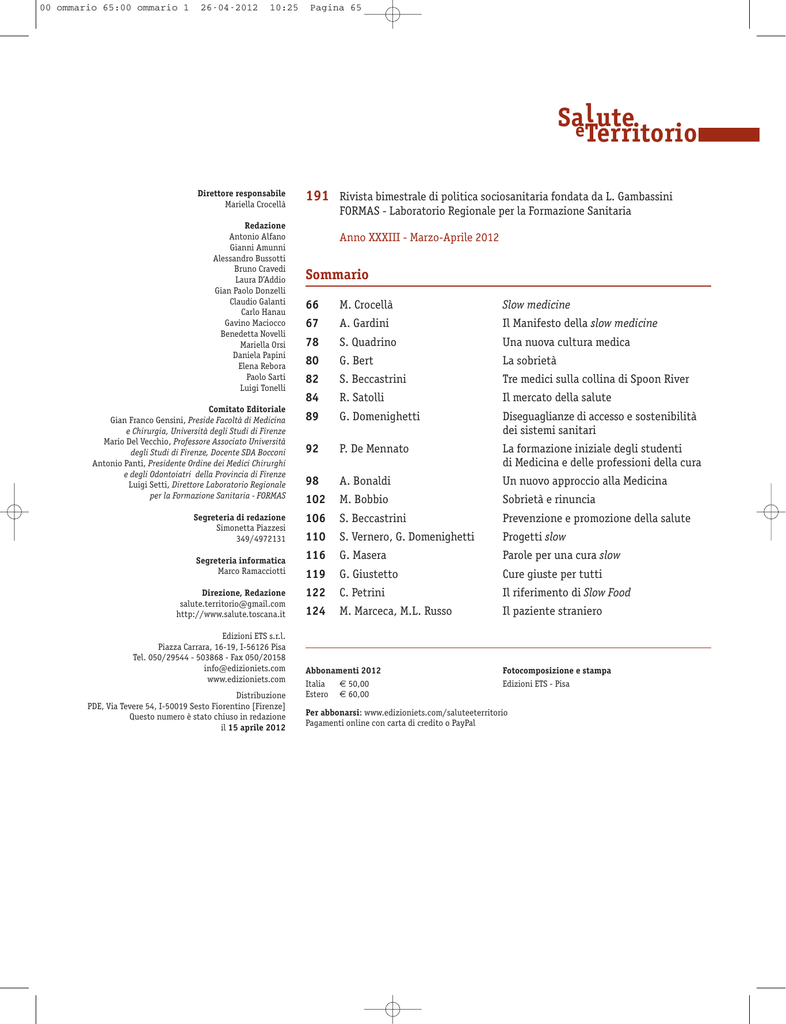 00sommario 65:00sommario 1 26-04-2012 10:25 Pagina 65 Sae l ute Territorio Direttore responsabile Mariella Crocellà Redazione Antonio Alfano Gianni Amunni Alessandro Bussotti Bruno Cravedi Laura D’Addio Gian Paolo Donzelli Claudio Galanti Carlo Hanau Gavino Maciocco Benedetta Novelli Mariella Orsi Daniela Papini Elena Rebora Paolo Sarti Luigi Tonelli Comitato Editoriale Gian Franco Gensini, Preside Facoltà di Medicina e Chirurgia, Università degli Studi di Firenze Mario Del Vecchio, Professore Associato Università degli Studi di Firenze, Docente SDA Bocconi Antonio Panti, Presidente Ordine dei Medici Chirurghi e degli Odontoiatri della Provincia di Firenze Luigi Setti, Direttore Laboratorio Regionale per la Formazione Sanitaria - FORMAS Segreteria di redazione Simonetta Piazzesi 349/4972131 Segreteria informatica Marco Ramacciotti Direzione, Redazione [email protected] http://www.salute.toscana.it Edizioni ETS s.r.l. Piazza Carrara, 16-19, I-56126 Pisa Tel. 050/29544 - 503868 - Fax 050/20158 [email protected] www.edizioniets.com Distribuzione PDE, Via Tevere 54, I-50019 Sesto Fiorentino [Firenze] Questo numero è stato chiuso in redazione il 15 aprile 2012 191 Rivista bimestrale di politica sociosanitaria fondata da L. Gambassini FORMAS - Laboratorio Regionale per la Formazione Sanitaria Anno XXXIII - Marzo-Aprile 2012 Sommario 66 M. Crocellà Slow medicine 67 A. Gardini Il Manifesto della slow medicine 78 S. Quadrino Una nuova cultura medica 80 G. Bert La sobrietà 82 S. Beccastrini Tre medici sulla collina di Spoon River 84 R. Satolli Il mercato della salute 89 G. Domenighetti Diseguaglianze di accesso e sostenibilità dei sistemi sanitari 92 P. De Mennato La formazione iniziale degli studenti di Medicina e delle professioni della cura 98 A. Bonaldi Un nuovo approccio alla Medicina 102 M. Bobbio Sobrietà e rinuncia 106 S. Beccastrini Prevenzione e promozione della salute 110 S. Vernero, G. Domenighetti Progetti slow 116 G. Masera Parole per una cura slow 119 G. Giustetto Cure giuste per tutti 122 C. Petrini Il riferimento di Slow Food 124 M. Marceca, M.L. Russo Il paziente straniero Abbonamenti 2012 Italia € 50,00 Estero € 60,00 Fotocomposizione e stampa Edizioni ETS - Pisa Per abbonarsi: www.edizioniets.com/saluteeterritorio Pagamenti online con carta di credito o PayPal 01Crocella_intro 66:Layout 1 26-04-2012 Sae l ute Territorio 66 10:23 Pagina 66 Slow medicine N. 191 - 2012 Slow medicine U na Medicina “lenta” non si propone come un valore. Chi entra nel tunnel della malattia, vive con ansia e disagio il tortuoso percorso disseminato di esami, analisi, di rimandi a pareri specialistici, di attese obiettivamente troppo lunghe prima di arrivare, sperabilmente, ad una diagnosi. L’insofferenza per l’attesa, del resto, caratterizza tutte le attività dei contemporanei che vivono nei Paesi industrializzati. “Veloce” non è più una connotazione, è un “must”. Deve qualificare una persona sul lavoro; non rispettare i ritmi sempre più accelerati che la cultura informatica ha imposto viene recepito come un handicap e può incidere profondamente sull’autostima di una persona che si sente disadattata rispetto alla norma. La Medicina ha un passo lento ma soltanto rispetto ai “tempi morti” che il paziente deve subire, sia in un ambulatorio medico che durante un ricovero ospedaliero. La deospedalizzazione non fa testo: l’esigenza di dimettere in pochi giorni persone che hanno subìto interventi anche seri ha creato più problemi che benefici. Non esiste in genere, perché non è stata organizzata, una rete di servizi per seguire un convalescente presso il suo domicilio. L’efficienza non ha niente a che fare con la frettolosità che a volte caratterizza le attività dei professionisti della salute. Manca il tempo, si sostiene in questi casi, ed è indubitabile che un’organizzazione sanitaria di tipo aziendalistico stressi al massimo il perseguimento dei risultati. Rimettere in discussione questa prassi rappresenta una sfida, significa tentare di contrastare una cultura generalizzata, ridiscutere modelli di intervento, organizzazione gerarchica del lavoro. Ed è quello che slow medicine si propone, una “provocazione” che sta raccogliendo consensi, stimolando, quando necessario, un ripensamento sul proprio modo di operare per valorizzare l’identità stessa dell’essere medico. Mariella Crocellà Direttore Salute e Territorio 02Gardini 67:Layout 1 26-04-2012 10:22 Pagina 67 Sae l ute Slow medicine Territorio 67 N. 191 - 2012 Andrea Gardini Medico - Direttore sanitario dell’Azienda ospedalierauniversitaria di Ferrara L a storia della Medicina è fatta da donne e uomini che cercano di curare le persone ammalate, hanno delle idee, cercano delle risposte e lottano per ottenerle e migliorare le cure per i loro pazienti. Queste persone vanno ricordate, perché sulle loro spalle poggia la nostra semplice voglia di fare bene. I precursori Alberto Dolara (1), (2), per primo, ha avuto il merito nei suoi scritti anticipatori di mettere in dubbio l’efficacia della fretta e della conseguente superficialità nel migliorare i risultati delle cure dei pazienti cardiopatici e di altre patologie…è suo il primo accostamento fra le parole slow e medicine, fatto in analogia alle parole slow e food, in antitesi a fast food e fast medicine. Carlo Petrini assieme a pochi altri audaci aveva, 20 anni fa, deciso di rifiutare le logiche del cibo industriale rivendicando il diritto degli uomini a mangiare un cibo buono, pulito e giusto, un cibo che privilegiasse la cultura del cibo locale e la valorizzasse, che pensasse al nutrirsi come piacere consapevole e non come consumo indifferenziato, e scelse come simbolo la chiocciola, la ormai ben conosciu- Il Manifesto della slow medicine ta chiocciola di slow food, che, come essere vivente, fa crescere il proprio guscio fino al limite massimo della propria capacità di portarsela addosso, poi si ferma… la chiocciola come esperie