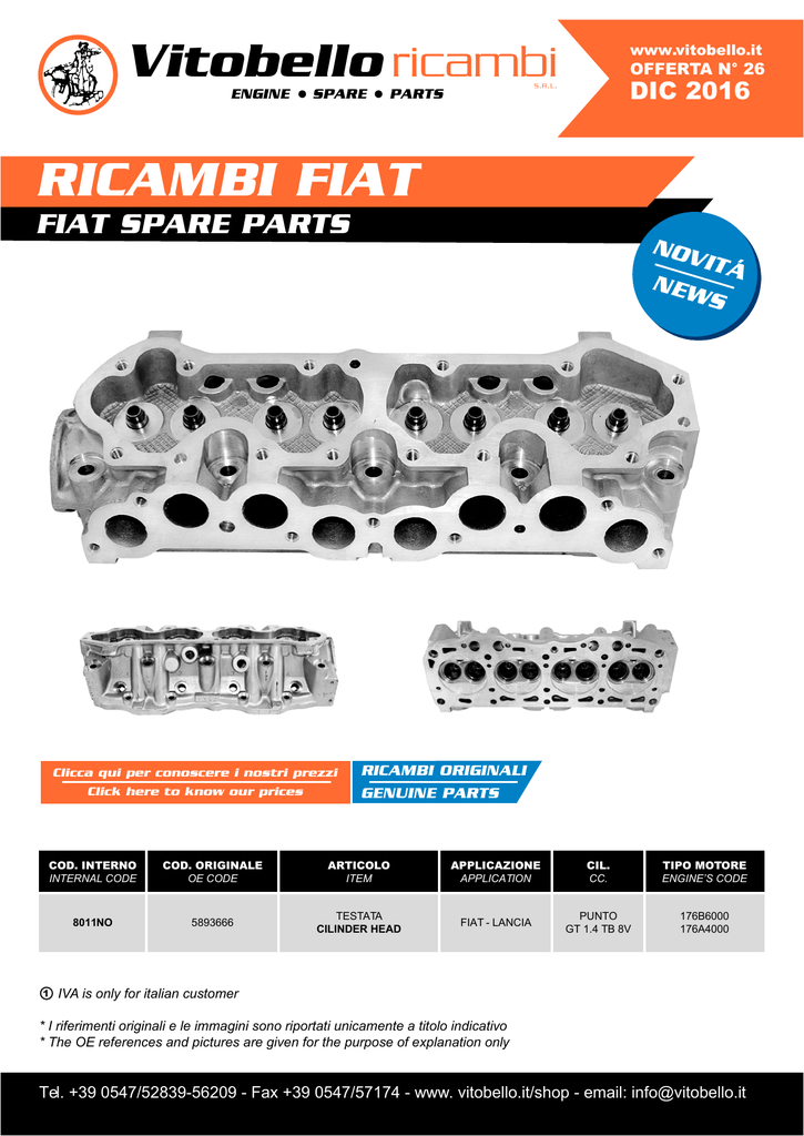 Vitobello ricambi ENGINE SPARE www.vitobello.it OFFERTA N° 26 DIC 2016 S. R. L. PARTS RICAMBI FIAT FIAT SPARE PARTS NOV ITÁ NEW S 1 Clicca qui per conoscere i nostri prezzi Click here to know our prices RICAMBI ORIGINALI GENUINE PARTS COD. INTERNO INTERNAL CODE COD. ORIGINALE OE CODE ARTICOLO ITEM APPLICAZIONE APPLICATION CIL. CC. TIPO MOTORE ENGINE’S CODE 8011NO 5893666 TESTATA CILINDER HEAD FIAT - LANCIA PUNTO GT 1.4 TB 8V 176B6000 176A4000 1 IVA is only for italian customer * I riferimenti originali e le immagini sono riportati unicamente a titolo indicativo * The OE references and pictures are given for the purpose of explanation only Tel. +39 0547/52839-56209 - Fax +39 0547/57174 - www. vitobello.it/shop - email: [email protected]
