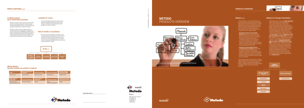 S.p.A. La Media Impresa come interlocutore principale Studio Stefano Pieri Graphic Design_ Stampa Neuberg_ Novembre 2009_ 1.000 PROFILO METODO I prodotti ed i servizi Le soluzioni che Metodo propone alle aziende risolvono sempre le problematiche partendo da una loro visione d’insieme, e permettono una personalizzazione senza destabilizzare il sistema informativo. Metodo ha da sempre rivolto la propria attenzione alla PMI italiana ed alla classica dimensione univoca e personale del tessuto imprenditoriale italiano, un tessuto caratterizzato da esigenze sempre diverse, e sempre in evoluzione. Dalla PMI si è passati a prestare maggiore attenzione alla media impresa, fino a raggiungere una ragguardevole quota di mercato nella classe 50-499 addetti: dopo l’avvenuta acquisizione di Metodo da parte del Gruppo TeamSystem, la quota congiunta sulla media impresa ha raggiunto il 18%, confermando la posizione leader di mercato del Gruppo. PRODUCTS OVERVIEW METODO PRODUCTS OVERVIEW Rete di vendita e di assistenza Nei suoi 20 anni di storia Metodo ha sviluppato una rete di vendita composta da oltre 80 partner su tutto il territorio nazionale. Tali rivenditori seguono i propri clienti sia per la formazione sia per la personalizzazione e la consulenza, ed usano le tecnologie che Metodo offre loro come una vera e propria piattaforma di sviluppo. 20 anni di Esperienza 80 Rivenditori in tutta Italia Oltre 30.000 posti di Lavoro Le soluzioni ideali per una Gestione innovativa dell’Impresa. Offerta Metodo: soluzioni semplici per problemi complessi Enterprise Application Integration Business Intelligence Gestione documentale Gestione contenuti portale Web (CMS) Metodo Evolus All In One Touch OLAP Evolus Suite Knos Enterprise Enterprise Portal CRM e Gestione post-vendita Commercio Elettronico Gestione guidata dagli eventi Certificazione Qualità Configurazione Grafica Composizione Prodotti Enterprise Commerce Synapse Quality & Document Management Prodigio Enterprise Support Microsoft Dynamics CRM La società Metodo S.p.A. nasce nel 1989 a Bassano del Grappa con la volontà di diventare un punto di riferimento nella progettazione di Software Gestionale per le imprese italiane. Nel corso degli anni, lo sviluppo del gestionale Metodo ha permesso l’estensione delle sue funzionalità fino a coprire tutte le aree operative dell’azienda. Dopo questa evoluzione, sono stati due bisogni diversi a fungere da binari dello sviluppo strategico: - Integrazione di dati da applicativi diversi e tra mondi diversi in evoluzione (Desktop, Web) : la necessità di integrarsi con dati provenienti da applicativi e mondi diversi, data la presenza di tanti programmi nelle aziende, e la necessità di far dialogare le tradizionali applicazioni desktop con il nuovo mondo del Web sono state le basi dell’altra direzione di sviluppo delle soluzioni Metodo. Oltre 5.000 Clienti X-ERP Metodo ed il Gruppo TeamSystem S.p.A. - Orientamento proattivo verso la gestione degli eventi: una gestione modulare tradizionale dei processi aziendali è una visione a volte riduttiva del reale funzionamento delle aziende. È necessaria una gestione di più ampio respiro, orientata a comprendere il rapporto tra i processi aziendali e gli eventi che quotidianamente si susseguono. L’obiettivo è stato quindi quello di proporre un ambiente operativo che rendesse gli eventi aziendali naturalmente inseriti nelle logiche gestionali dell’ERP. METODO S.p.A. Architettura ERP basata su Tecnologie Microsoft Metodo Questa strategia orientata a fornire all’utente una migliore ergonomia applicativa ed una profonda coerenza d’insieme a livello di esperienza d’uso permette alle applicazioni Metodo un’integrazione indolore in ogni contesto aziendale, modificabile nel tempo in funzione dell’evoluzione dell’azienda. Divisione Formazione TeamSystem Euroconference Metodo Nuovamacut Zeronove Metodo S.p.A. 36061 Bassano del Grappa (VI) Via Lavarone, 4/6 Tel. 0424/507111 Fax 0424/501178 [email protected] www.metodo.it GRUPPO TEAMSYSTEM Divisione Software e Servizi LexTeam Certified Software Partner Dal 2007 Metodo entra a far parte del Gruppo TeamSystem, leader in Italia nel mercato dei software gestionali e dei servizi rivolti alle piccole e medie imprese, ai professionisti (commercialisti, consulenti del lavoro, avvocati, amministratori di condominio) e alle associazioni. Fondato a Pesaro nel 1979, il Gruppo TeamSystem produce e distribuisce soluzioni informatiche innovative, flessibili e puntualmente aggiornate in funzione delle novità normative e dell’evoluzione tecnologica; inoltre, propone un’offerta formativa altamente qualificata. Oggi il Gruppo, con 27 sedi in Italia, un organico di 800 persone e ricavi netti consolidati per 127 milioni di Euro al 31 dicembre 2008, rappresenta una tra le realtà italiane più dinamiche del settore. Con una presenza capillare e diffusa su tutto il territorio nazionale, il Gruppo TeamSystem offre software e servizi a circa 82.000 clienti (dicembre 2008), sia direttamente che indirettamente con circa 550 software partner selezionati. Al fine di poter garantire la massima efficacia e personalizzazione delle soluzioni, la società dispone di una rete tecnica e commerciale costituita da professionisti qualificati sia sotto il profilo tecnologico che gestionale e amministrativo. Metodo, grazie all’entrata nel Gruppo, ha rafforzato ed aumentato ulteriormente la sua quota di mercato nel mercato delle Medie Imprese con il proprio prodotto di punta Metodo Evolus. S.p.A. La Media Impresa come interlocutore principale Studio Stefano Pieri Graphic Design_ Stampa Neuberg_ Novembre 2009_ 1.000 PROFILO METODO I prodotti ed i servizi Le soluzioni che Metodo propone alle aziende risolvono sempre le problematiche partendo da una loro visione d’insieme, e permettono una personalizzazione senza destabilizzare il sistema informativo. Metodo ha da sempre rivolto la propria attenzione alla PMI italiana ed alla classica dimensione 
