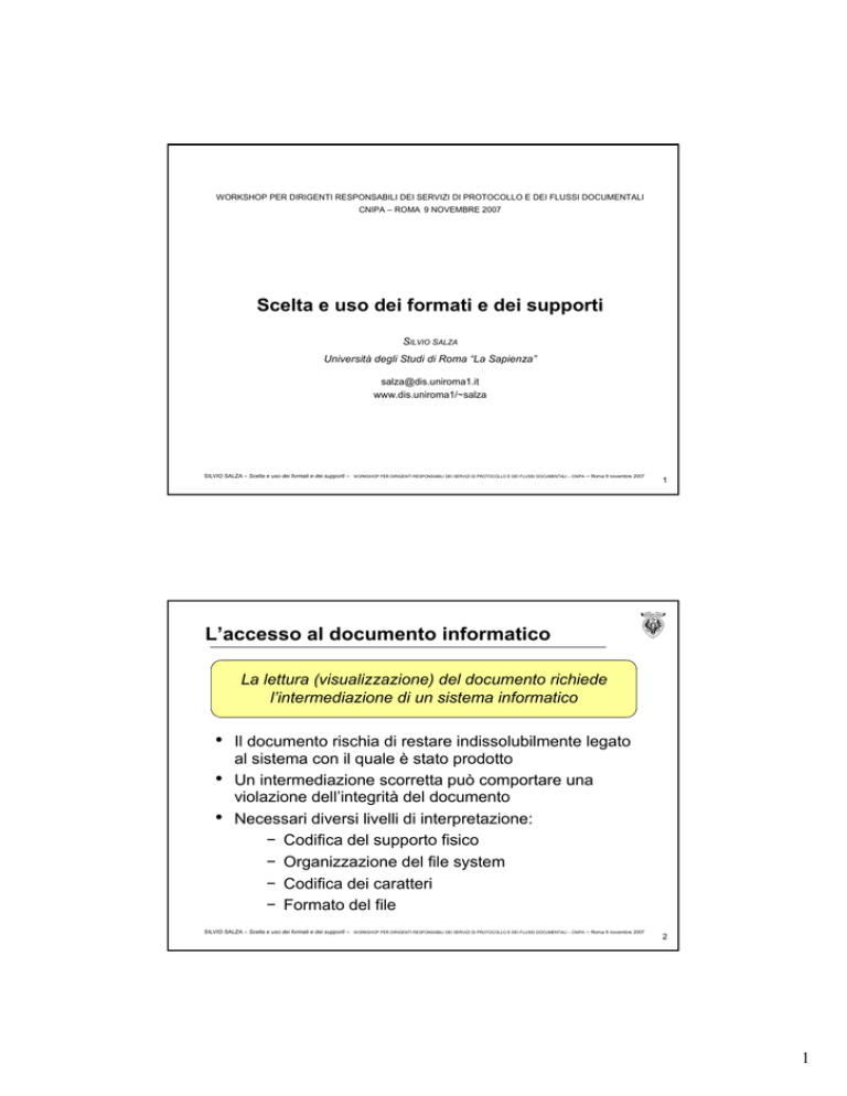 WORKSHOP PER DIRIGENTI RESPONSABILI DEI SERVIZI DI PROTOCOLLO E DEI FLUSSI DOCUMENTALI CNIPA – ROMA 9 NOVEMBRE 2007 Scelta e uso dei formati e dei supporti SILVIO SALZA Università degli Studi di Roma “La Sapienza” [email protected] www.dis.uniroma1/~salza SILVIO SALZA – Scelta e uso dei formati e dei supporti – WORKSHOP PER DIRIGENTI RESPONSABILI DEI SERVIZI DI PROTOCOLLO E DEI FLUSSI DOCUMENTALI – CNIPA – Roma 9 novembre 2007 1 L’accesso al documento informatico La lettura (visualizzazione) del documento richiede l’intermediazione di un sistema informatico • • • Il documento rischia di restare indissolubilmente legato al sistema con il quale è stato prodotto Un intermediazione scorretta può comportare una violazione dell’integrità del documento Necessari diversi livelli di interpretazione: − Codifica del supporto fisico − Organizzazione del file system − Codifica dei caratteri − Formato del file SILVIO SALZA – Scelta e uso dei formati e dei supporti – WORKSHOP PER DIRIGENTI RESPONSABILI DEI SERVIZI DI PROTOCOLLO E DEI FLUSSI DOCUMENTALI – CNIPA – Roma 9 novembre 2007 2 1 La storia dell’archeologo (AD 2010) • • • • Nel 2000 DC un archeologo trova in Mesopotamia una serie di tavolette di terracotta sumere del 2300 AC costituenti l’archivio di Sargon di Akkad. Malgrado i 4300 anni i segni sulle tavolette sono ancora chiaramente intelligibili Basta conoscere la lingua sumera per ‘leggere’ il contenuto dell’archivio Molte lingue antiche sono state tramandate, quasi tutte le altre sono state decifrate Evento notevole ma non eccezionale: riteniamo ‘normale’ che documenti ‘tradizionali’ sopravvivano per millenni SILVIO SALZA – Scelta e uso dei formati e dei supporti – WORKSHOP PER DIRIGENTI RESPONSABILI DEI SERVIZI DI PROTOCOLLO E DEI FLUSSI DOCUMENTALI – CNIPA – Roma 9 novembre 2007 3 La storia dell’archeologo (AD 4000) • • • Nel 4000 DC un archeologo trova in Mesopotamia una serie dischi ottici del 2000 DC, contenenti l’archivio segreto di Saddam Hussein Molto probabilmente i dischi sono illeggibili a livello fisico Comunque, per ‘leggerne’ il contenuto occorrerebbe: – Un lettore di CD/DVD (ma l’ultimo esemplare è andato perduto nel tragico incendio nel Museo della Scienza e della Tecnica di Washington DC, nel 2560 DC) – La specifica del formato proprietario dei file (ma è andata perduta nella confusione conseguente il clamoroso fallimento di Microsoft nel 2025 DC) – Una copia di MS Office 97 che giri sulle micro-piattaforme neuroniche sottocutanee a 1024 bit che hanno sostituito i PC a partire dal 2070 DC SILVIO SALZA – Scelta e uso dei formati e dei supporti – WORKSHOP PER DIRIGENTI RESPONSABILI DEI SERVIZI DI PROTOCOLLO E DEI FLUSSI DOCUMENTALI – CNIPA – Roma 9 novembre 2007 4 2 Leggibilità dei documenti informatici La leggibilità di un documento informatico dipende dalla possibilità e dalla capacità di interpretare ed elaborare correttamente i dati binari che costituiscono il documento, secondo le regole stabilite dal formato con cui esso è stato memorizzato • Iniziale dipendenza dei formati dagli ambienti di elaborazione (anni ’60 - ’80) • • • Proliferazione dei formati proprietari Tendenza attuale verso la standardizzazione dei formati Pericolo di ‘illegibilità’ ridotto, ma tuttora presente SILVIO SALZA – Scelta e uso dei formati e dei supporti – WORKSHOP PER DIRIGENTI RESPONSABILI DEI SERVIZI DI PROTOCOLLO E DEI FLUSSI DOCUMENTALI – CNIPA – Roma 9 novembre 2007 5 Formato del documento informatico Formato: insieme di regole in base alle quali viene effettuata la visualizzazione del documento, cioè la trasformazione dell’informazione binaria contenuta nel documento informatico in forma direttamente leggibile. A. Indicazione dell’applicazione con cui il documento è stato generato B. Definizione di una procedura per visualizzarlo con applicazioni diverse NB: il risultato del processo di visualizzazione deve essere in tutto identico a quello percepito dall’autore del documento. . SILVIO SALZA – Scelta e uso dei formati e dei supporti – WORKSHOP PER DIRIGENTI RESPONSABILI DEI SERVIZI DI PROTOCOLLO E DEI FLUSSI DOCUMENTALI – CNIPA – Roma 9 novembre 2007 6 3 Metadati • Tutte le informazioni significative associate al documento informatico, escluse quelle che ne costituiscono il contenuto • Informazioni su: modi, tempi e soggetti coinvolti nella formazione, nella sottoscrizione, nella gestione e nella conservazione del documento • Nei documenti informatici i metadati possono diventare parte integrante del documento • I metadati agevolano la gestione dei documenti informatici: – Ricerca: individuazione e localizzazione – Accesso: gestione di raccolte tramite cataloghi – Interoperabilità: basata su equivalenze semantiche SILVIO SALZA – Scelta e uso dei formati e dei supporti – WORKSHOP PER DIRIGENTI RESPONSABILI DEI SERVIZI DI PROTOCOLLO E DEI FLUSSI DOCUMENTALI – CNIPA – Roma 9 novembre 2007 7 Standard per i metadati • • • • Garantiscono la definizione di modalità di accesso e gestione generali, cioè indipendenti dal singolo archivio Consentono l’impostazione di ricerche che interessano molteplicità e varietà di archivi diversi (es. cataloghi bibliotecari) Assicurano l’interoperabilità degli archivi e la migrazione dei documenti Esistono consolidati standard di riferimento, cui attenersi, in particolare: – ISAD (International Standard for Archival Description) sviluppato nel 1996-9 dall’ International Council on Archives – Dublin Core (1995) molto diffuso in ambito bibliotecario SILVIO SALZA – Scelta e uso dei formati e dei supporti – WORKSHOP PER DIRIGENTI RESPONSABILI DEI SERVIZI DI PROTOCOLLO E DEI FLUSSI DOCUMENTALI – CNIPA – Roma 9 novembre 2007 8 4 Documento intelligente Documento informatico che contiene al suo interno tutti i metadati ad esso associati • • Termine forse non r