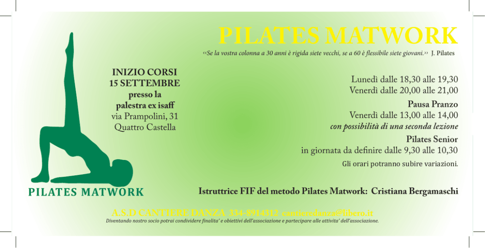 PILATES MATWORK ‹‹Se la vostra colonna a 30 anni è rigida siete vecchi, se a 60 è flessibile siete giovani.›› J. Pilates INIZIO CORSI 15 SETTEMBRE presso la palestra ex isaff via Prampolini, 31 Quattro Castella PILATES MATWORK Lunedì dalle 18,30 alle 19,30 Venerdì dalle 20,00 alle 21,00 Pausa Pranzo Venerdì dalle 13,00 alle 14,00 con possibilità di una seconda lezione Pilates Senior in giornata da definire dalle 9,30 alle 10,30 Gli orari potranno subire variazioni. Istruttrice FIF del metodo Pilates Matwork: Cristiana Bergamaschi A.S.D CANTIERE DANZA 334-8914312 [email protected] Diventando nostro socio potrai condividere �inalita’ e obiettivi dell’associazione e partecipare alle attivita’ dell’associazione. PILATES Matwork Scopo principale del metodo Pilates matwork* e’ quello di portare l’individuo a muoversi con economia, grazia ed equilibrio. Nel metodo Pilates mente e corpo cooperano ricercando controllo, precisione e fluidità dei movimenti, nell’esercizio il movimento è sempre coordinato con la respirazione. Chi pratica gli esercizi del “METODO PILATES” partecipa attivamente con il corpo e con la mente a ciò che sta facendo. PRINCIPI BASE 1. la Respirazione sempre ben controllata e guidata dall’aiuto dell’insegnante (inspirando si prepara il movimento ed espirando lo si esegue) 2. il Baricentro (Power House),è centro di forza e di controllo di tutto il corpo se il centro non è forte e stabile non si possono muovere le estremità 3. la Precisione, aumenta i benefici dell’esercizio 4. la Concentrazione, il pensiero guida il corpo nel movimento 5. il Controllo, ogni movimento va attentamente regolato e accompagnato 6. la Fluidità, i movimenti all’interno di un esercizio devono essere correlati uno all’altro I BENEFICI La pratica costante migliora l’armonia dei gesti, il portamento, tonifica i muscoli, previene la sintomatologia dolorosa dovuta a posture scorrette o a disturbi articolari. In breve questi i benefici che la pratica del Pilates comporta: • Ventre più sodo e più piatto * Il metodo Pilates, è un sistema di allenamento sviluppato da Joseph Pilates negli anni 20, basato • Corpo più snello sull’uso di speciali macchinari con molle e tiranti. Nella versione “Matwork” (lavoro su tappetino) gli • Movimenti più fluidi esercizi vengono eseguiti a corpo libero su di un tappetino. E’ un “programma di esercizi che si concentra sui • Muscoli più sodi e tonici muscoli posturali, cioè quei muscoli che aiutano a tenere il corpo bilanciato e sono essenziali a fornire Per • Migliore respirazione assicurare motivazione e intensità nel matwork le lezioni saranno strutturate anche con il supporto dei piccoli • Migliore circolazione sanguigna attrezzi del Pilates Soft ball, Elastiband, foam, Roller Ring. • Diminuzione dello stress IL PILATES E’ CONSIGLIATO: a persone di mezza età e anziani, persone giovani ed in forma, giovani mamme, sportivi, per riabilitazione.