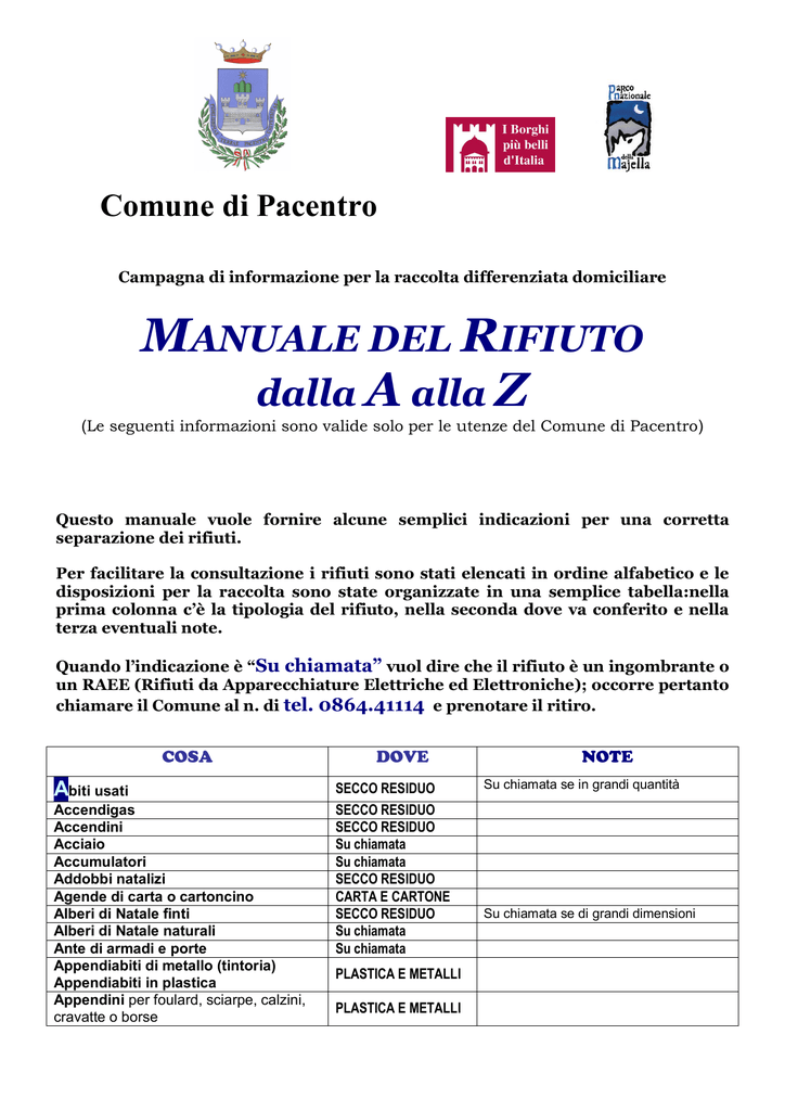 Comune di Pacentro Campagna di informazione per la raccolta differenziata domiciliare MANUALE DEL RIFIUTO dalla A alla Z (Le seguenti informazioni sono valide solo per le utenze del Comune di Pacentro) Questo manuale vuole fornire alcune semplici indicazioni per una corretta separazione dei rifiuti. Per facilitare la consultazione i rifiuti sono stati elencati in ordine alfabetico e le disposizioni per la raccolta sono state organizzate in una semplice tabella:nella prima colonna c’è la tipologia del rifiuto, nella seconda dove va conferito e nella terza eventuali note. Quando l’indicazione è “Su chiamata” vuol dire che il rifiuto è un ingombrante o un RAEE (Rifiuti da Apparecchiature Elettriche ed Elettroniche); occorre pertanto chiamare il Comune al n. di tel. 0864.41114 e prenotare il ritiro. COSA Abiti usati Accendigas Accendini Acciaio Accumulatori Addobbi natalizi Agende di carta o cartoncino Alberi di Natale finti Alberi di Natale naturali Ante di armadi e porte Appendiabiti di metallo (tintoria) Appendiabiti in plastica Appendini per foulard, sciarpe, calzini, cravatte o borse DOVE SECCO RESIDUO SECCO RESIDUO SECCO RESIDUO Su chiamata Su chiamata SECCO RESIDUO CARTA E CARTONE SECCO RESIDUO Su chiamata Su chiamata PLASTICA E METALLI PLASTICA E METALLI NOTE Su chiamata se in grandi quantità Su chiamata se di grandi dimensioni Armadi ed ante Asciugacapelli (phon) Aspirapolvere Assorbenti igienici Su chiamata Su chiamata Su chiamata SECCO RESIDUO Avanzi di cibo ORGANICO Bacinelle in plastica SECCO RESIDUO SECCO RESIDUO ORGANICO Su chiamata Bambole Bambù Bancali in legno o altro materiale Barattoli in metallo per alimenti (alluminio, acciaio, banda stagnata) Barattoli e vaschette in plastica per alimenti Barilotti “sorpresa” per ovetti di cioccolato ed altri contenitori aventi la stessa funzione Barre di polistirolo espanso per imballaggi Bastoncini igienici per le orecchie Bastoncini per caramelle tipo “lollipop” Batterie per auto e per cellulari Batterie a stilo Bende Bicchieri di plastica usa e getta Bicchieri di vetro Bicicletta Biglietti autobus e treni Biglietti Gratta e vinci Bilancia elettronica Bilancia pesa persone Biscotti Blister (astucci per medicine) Bobine in legno per cavi elettrici Boccioni in plastica per acqua Bombola vuota del gas Bombolette spray senza gas (schiuma, panna,…) Borse di tela o pelle Borse per piumoni, plaid ecc. Bottiglie in plastica per bevande Bottiglie di vetro Bottoni Bucce della frutta Bulloneria (grandi quantità) Buste delle lettere con o senza finestra in plastica Buste imbottite Buste in plastica per alimenti (pasta, riso, caffè,…) Buste in plastica per indumenti (camicie, biancheria intima,…) Buste per la spesa in plastica e biodegradabili non compostabili Buste per la spesa compostabili con il marchio ”OK Compost” Solo per le utenze domestiche Rimuovere eventuali involucri e conferirli sgocciolati Piccole dimensioni PLASTICA E METALLI PLASTICA E METALLI PLASTICA E METALLI PLASTICA E METALLI SECCO RESIDUO PLASTICA E METALLI Su chiamata PILE SECCO RESIDUO PLASTICA E METALLI VETRO Su chiamata CARTA E CARTONE SECCO RESIDUO Su chiamata Su chiamata ORGANICO PLASTICA E METALLI Su chiamata PLASTICA E METALLI Su chiamata Svuotarlo da residui di medicinali PLASTICA E METALLI SECCO RESIDUO PLASTICA E METALLI PLASTICA E METALLI VETRO SECCO RESIDUO ORGANICO Su chiamata CARTA E CARTONE SECCO RESIDUO PLASTICA E METALLI PLASTICA E METALLI PLASTICA E METALLI PLASTICA E METALLI Sono utilizzabili come sacchetto per i rifiuti organici Caffè in cialde di carta Caffè in cialde di plastica Calcinacci Calendari Calcolatrici Calzature usate Calze di nylon Cannucce in plastica per bevande Capelli Cappelli Capsule per conserve (es. tappi di barattoli) Caraffe di vetro Carbone e cenere spenti Carne (in piccole quantità) ORGANICO SECCO RESIDUO Su Chiamata CARTA E CARTONE Su Chiamata SECCO RESIDUO SECCO RESIDUO SECCO RESIDUO ORGANICO SECCO RESIDUO Per quantità ridotte Togliere le parti non di carta PLASTICA E METALLI VETRO SECCO RESIDUO ORGANICO Carta assorbente da cucina ORGANICO Carta copiativa Carta da pacchi Carta del pane Carta da parati Carta forno Carta fotografica Carta in alluminio Carta lucida da disegno Carta per alimenti (formaggi o affettati) Carta sporca di prodotti non organici e detergenti, Carta stagnola Carta telefonica Carta termochimica (es. carta fax, scontrini) Carta vetrata Cartone ondulato Cartucce vuote per stampanti (laser e ink-jet) Casco per moto Cassette audio e video Cassette della frutta in cartone Cassette di legno e plastica Cavi elettrici e per antenne (di piccole dimensioni e quantità) CD audio e informatici Cellophane Cera di candela Cerchioni dei pneumatici Cerniere (di metallo e plastica) Cerotti Chiodi e viti Chiusure metalliche/Capsule per conserve (es. tappi di barattoli) Cibo (avanzi freddi sia crudi che cotti) Cinture Cisternette Cocci di ceramica, porcellana, SECCO RESIDUO CARTA E CARTONE CARTA E CARTONE SECCO RESIDUO SECCO RESIDUO SECCO RESIDUO PLASTICA E METALLI SECCO RESIDUO SECCO RESIDUO Nel secco residuo se sporca di prodotti chimici e detergenti Se unta nell’organico Su chiamata se in grandi quantità Priva di residui Priva di residui Priva di residui Priva di residui SECCO RESIDUO SECCO RESIDUO SECCO RESIDUO SECCO RESIDUO SECCO RESIDUO CARTA E CARTONE Su chiamata Sono per utenze domestiche SECCO RESIDUO SECCO RESIDUO CARTA E CARTONE Su chiamata SECCO RESIDUO Su chiamata se in grandi quantità SECCO RESIDUO PLASTICA E METALLI SECCO RESIDUO Su chiamata SECCO RESIDUO SECCO RESIDUO SECCO RESIDUO PLASTICA E METALLI ORGANICO SECCO RESIDUO Su chiamata SECCO RESIDUO Conferirlo sgocciolato terracotta, pirex Colle (grandi quantità) Computer (compresi tastiera stampanti, mouse) Conta gocce Contenitori per diserbanti, pesticidi, fitosanitari Contenitori, coperchi e carta stagnola di chiusura dei vasetti Jogurt Contenitore ceretta depilatoria Contenitori per liquidi fisiologici e per emodiali