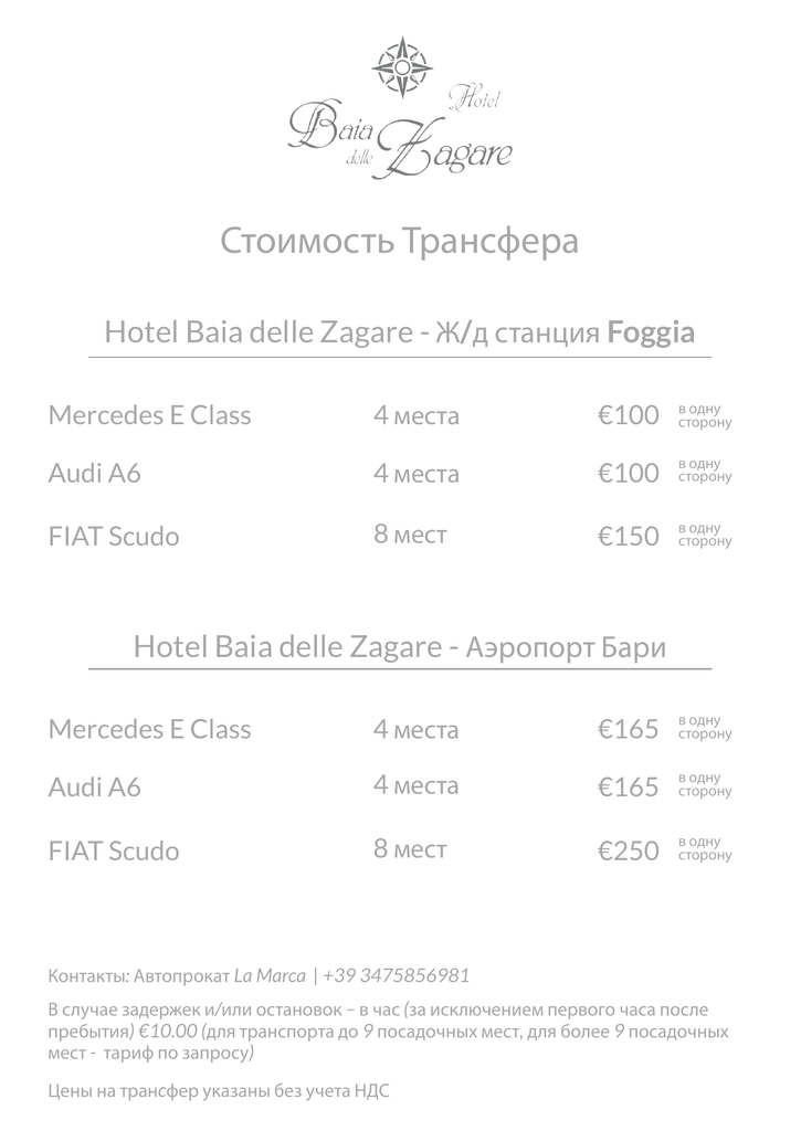 Стоимость Трансфера Hotel Baia delle Zagare - Ж/д станция Foggia Mercedes E Class 4 места €100 в одну сторону Audi A6 4 места €100 в одну сторону FIAT Scudo 8 мест €150 в одну сторону Hotel Baia delle Zagare - Аэропорт Бари Mercedes E Class 4 места €165 в одну сторону Audi A6 4 места €165 в одну сторону FIAT Scudo 8 мест €250 в одну сторону Контакты: Автопрокат La Marca | +39 3475856981 В случае задержек и/или остановок – в час (за исключением первого часа после пребытия) €10.00 (для транспорта до 9 посадочных мест, для более 9 посадочных мест - тариф по запросу) Цены на транcфер указаны без учета НДС