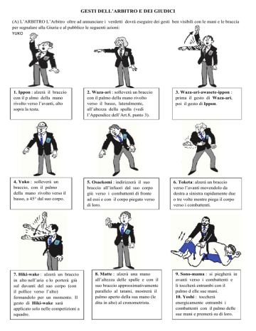 GESTI DELL’ARBITRO E DEI GIUDICI (A) L’ARBITRO L’Arbitro oltre ad annunciare i verdetti dovrà eseguire dei gesti ben visibili con le mani e le braccia per segnalare alla Giuria e al pubblico le seguenti azioni: YUKO.psd 1. Ippon : alzerà il braccio con il p almo della mano rivolto verso l’avanti, alto sopra la testa. 2. Waza-ari : solleverà un braccio con il palmo della mano rivolto verso il basso, lateralmente, all’altezza della spalla (vedi l’Appendice dell’Art.8, punto 3). 3. Waza-ari-awasete-ippon : prima il gesto di Waza-ari, poi il gesto di Ippon. 4. Yuko : solleverà un braccio, con il palmo della mano rivolto verso il basso, a 45° dal suo corpo. 7. Hiki-wake : alzerà un braccio in alto nell’aria e lo porterà giù sul davanti del suo corpo (con il pollice verso l’alto) fermandolo per un momento. Il gesto di Hiki-wake sarà applicato solo nelle competizioni a squadre. 5. Osaekomi : indirizzerà il suo braccio all’infuori dal suo corpo giù verso i combattenti di fronte ad essi e con il corpo piegato verso di loro. 8. Matte : alzerà una mano all’altezza delle spalle e con il suo braccio approssimativamente parallelo al tatami, mostrerà il palmo aperto della sua mano (le dita in alto) al cronometrista. 6. Toketa: alzerà un braccio verso l’avanti movendolo da destra a sinistra rapidamente due o tre volte mentre piega il corpo verso i combattenti. 9. Sono-mama : si piegherà in avanti verso i combattenti e li toccherà entrambi con il palmo d elle sue mani. 10. Yoshi : toccherà energicamente entrambi i combattenti con il palmo delle sue mani e premerà su di loro. 11. Per indicare la cancellazione di un giudizio dichiarato :ripeterà con una mano il gesto del giudizio precedentemente assegnato mentre alzerà l’altra mano sopra la testa davanti agitandola da destra a sinistra due o tre volte 12. Hantei : in preparazione della chiamata di hantei l’Arbitro alzerà entrambe le mani in avanti a 45° con la giusta bandierina in ogni mano (la bandierina nella mano deve corrispondere al colore del combattente che è posizionato da quel lato), quindi all’annuncio di hantei egli alzerà la bandierina alta sulla sua testa per indicare la sua opinione 13. Kachi (per indicare il vincitore di un combattimento) : alzerà una mano, palmo aperto, all’altezza sopra la spalla verso il vincitore facendo un passo avanti. 15. Per indicare di registrare un esame medico : segnala con una mano aperta verso il combattente e con l’altra mano, alza il dito indice verso il tabellonista per il primo esame ed il dito indice ed il medio per il secondo esame (vedi l’Appendice dell’Art.29, Notizia del Dicembre 1991). 14. Indicare al combattente (i) di riaggiustare il judogi : incrocia la mano sinistra sopra la destra, p almi rivolti verso l’interno, all’altezza della cintura. 16. Libero di toccare (Free-Touch): in caso di infortunio minore (naso san guinante, unghia rotta, ecc.), segnala con una mano, aperta, palmo in alto, verso il combattente. 17. Libero esame (Free-Examination) : segnala con entrambe le mani, aperte, palmo in alto, verso il combattente 18. Per annunciare una penalità (shido1, shido2, shido3, hansoku-make) : co n il dito indice disteso e pugno chiuso indica verso il combattente da sanzionare. 19. Non combattività : ruota, con un movimento in avanti, gli avambracci all’altezza del petto e poi indica con il dito indice il combattente. 20. Falso attacco : distende entrambe le braccia in avanti co n le mani chiuse e le porta entrambe verso il basso. 21. Trascinamento a terra in maniera scorretta : distende entrambe le braccia in avanti con le mani chiuse e roteando i pugni chiusi le porta entrambe verso il basso. 15, Prese alle g ambe e/o bloccaggi (punto XXV) Tutti gli attacchi diretti con una o due mani o con una o due braccia al di sotto della cintura, saranno proibiti e sanzionati come segue: 1° attacco HANSOKU MAKE Attenzione, si parla solo di attacco diretto; difatti le prese al di sotto della cintura saranno consentite, ma solo dopo una sequenza di tecniche (Renraku) od in caso di contrattacco (Kaeshi). E’ evidente che tale serie di tecniche dovrà essere reale e sincera e mettere in pericolo l’equilibrio dell’avversario così che la successiva presa di gamba non debb a essere determinante per la compromissione dell’equilibrio ma abbia un’utilità accessoria per il completamento della tecnica; altro requisito è che esista una effettiva continuità dell’azione, in mancanza della quale l’Arbitro dovrà fermare il combattimento e procedere alla prescritta sanzione. Analogamente il contrattacco sarà permesso solo in presenza di una sequenza di tecniche, effettuate senza interruzione, da parte dell’avversario. Le prese alle gambe sono quindi consentite solo dopo l’esecuzione di una tecnica, da parte di uno dei due combattenti, sempre che la stessa sia reale e ben evidente. (Una tecnica reale è una tecnica la cui intenzione è quella di proiettare l’avversario; l’esatto contrario del falso attacco) Gli attacchi simultanei o casi simultanei con presa di una o due gambe sono proibiti; la relativa sanzione sarà, in questo caso, quella di HANSOKU MAKE. Senza il contatto dei corpi la presa di gambe è proibita Esempi di contatto dei corpi per contrattacco Eccezione: la presa d i gamba/e consentita quando l’avversario in una posizione di prese incrociate N.B. – l’eccezionalità riferita solo alla presa dell’esempio e esclusivamente se l’esecutore chiude per eseguire una tecnica e porta i corp i in contatto. Solamente in q uesta evenienza è co nsentita la presa di gamba/e per un contrattacco; in mancanza di questi presupposti l’Arbitro infliggerà Hansoku Make a chi tiene la gamba o, trascorsi 3/5 secondi, Shido all’esecutore della presa. E’ proibito, in posizione di normale Kumi Kata, fuggire passando la testa sotto il braccio dell’avversario e prendere la/e gamba/e. La relativa sanzione sarà quella di HANSO