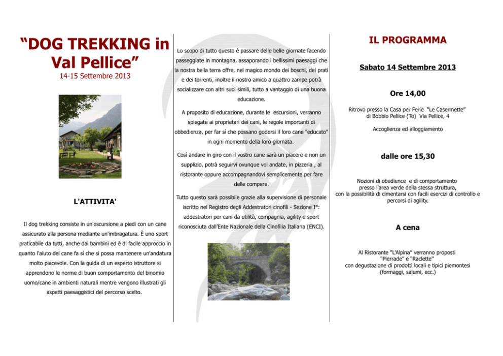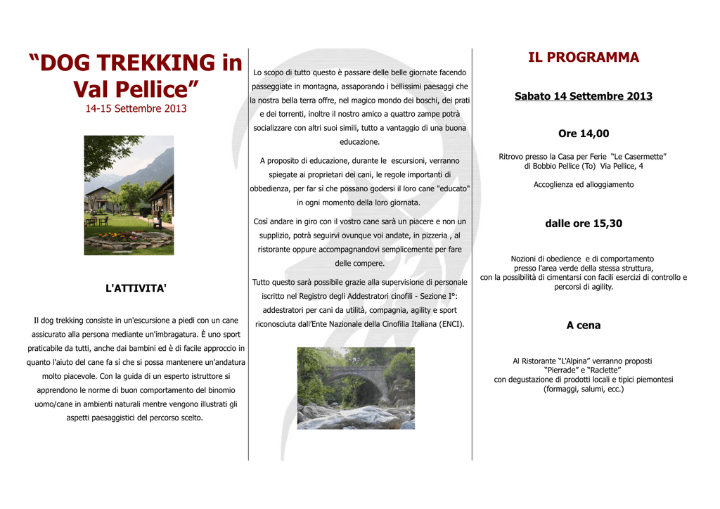 “DOG TREKKING in Val Pellice” 14-15 Settembre 2013 IL PROGRAMMA Lo scopo di tutto questo è passare delle belle giornate facendo passeggiate in montagna, assaporando i bellissimi paesaggi che la nostra bella terra offre, nel magico mondo dei boschi, dei prati Sabato 14 Settembre 2013 e dei torrenti, inoltre il nostro amico a quattro zampe potrà socializzare con altri suoi simili, tutto a vantaggio di una buona educazione. A proposito di educazione, durante le escursioni, verranno spiegate ai proprietari dei cani, le regole importanti di obbedienza, per far sì che possano godersi il loro cane "educato" Ore 14,00 Ritrovo presso la Casa per Ferie “Le Casermette” di Bobbio Pellice (To) Via Pellice, 4 Accoglienza ed alloggiamento in ogni momento della loro giornata. Così andare in giro con il vostro cane sarà un piacere e non un dalle ore 15,30 supplizio, potrà seguirvi ovunque voi andate, in pizzeria , al ristorante oppure accompagnandovi semplicemente per fare delle compere. L'ATTIVITA' Tutto questo sarà possibile grazie alla supervisione di personale Nozioni di obedience e di comportamento presso l'area verde della stessa struttura, con la possibilità di cimentarsi con facili esercizi di controllo e percorsi di agility. iscritto nel Registro degli Addestratori cinofili - Sezione I°: addestratori per cani da utilità, compagnia, agility e sport Il dog trekking consiste in un'escursione a piedi con un cane assicurato alla persona mediante un'imbragatura. È uno sport riconosciuta dall’Ente Nazionale della Cinofilia Italiana (ENCI). A cena praticabile da tutti, anche dai bambini ed è di facile approccio in quanto l'aiuto del cane fa sì che si possa mantenere un'andatura molto piacevole. Con la guida di un esperto istruttore si apprendono le norme di buon comportamento del binomio uomo/cane in ambienti naturali mentre vengono illustrati gli aspetti paesaggistici del percorso scelto. Al Ristorante “L'Alpina” verranno proposti “Pierrade” e “Raclette” con degustazione di prodotti locali e tipici piemontesi (formaggi, salumi, ecc.) Domenica 15 Settembre 2013 Dalle ore 8,30 Colazione presso la Casa per Ferie “Le Casermette” ore 10,30 Partenza per il Trekking COSA SERVE AL PROPRIETARIO A.S.D. PASSIONE CANE Per godersi una buona passeggiata con il nostro cane è importante equipaggiarsi nella maniera corretta, per evitare vesciche ai piedi, slogature, e fatiche inutili. L'attrezzatura base dovrebbe prevedere un buon paio di scarpe da trekking, calzoni sportivi (anche i jeans x i primi livelli possono andare),meglio se con tasche laterali tipo militare, magliette e maglioni a seconda della stagione, e un giubbotto comodo da poter all'occorrenza mettere nello zainetto. Maira cell. 347/5079813 e.mail [email protected] sito: www.Clubcinofilopassionecane.org CASA PER FERIE “LE CASERMETTE” Stefano cell. 370/3075287 COSA SERVE AL AMICO A QUATTRO ZAMPE e.mail [email protected] A parte il tipo di collare e guinzaglio, anche per il nostro amico è buona norma portarsi dell'acqua, salviette di pulizia ecc. Non sottovalutiamo il tipo di collare o Dalla struttura ricettiva si partirà a piedi e guinzaglio nella scelta del materiale, da loro a volte dopo circa 300 mt di strada asfaltata ci si tufferà nel bosco dipende la sicurezza del nostro amico e perciò sulla tipologia di modelli e materiali o accessori saremo ben lieti percorrendo tratti sterrati di piste, mulattiere e sentieri a bassa di consigliarvi quelli più appropriati. Esistono accessori di pendenza, dai quali ammirare scorci unici. facile trasporto e pieghevoli come ciotole, trasportini, zainetti, da poter usare in escursioni come queste per gestire meglio il cane in ogni situazione. Durante le soste nelle nostre passeggiate saremo a vostra disposizione per qualsiasi informazione. sito: www.centrovacanzebobbio.com Quota €. 80,00 (Comprede: Quanto proposto nel programma e tessera associativa A.S.D. PassioneCane obbligatoria) Per i soci Quota €. 60,00 rientro previsto per le ore 16,00 PER PRENOTAZIONE ED INFO: