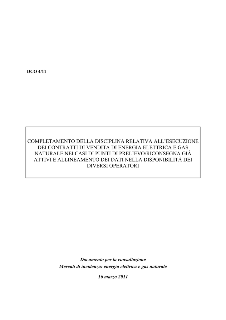 DCO 4/11 COMPLETAMENTO DELLA DISCIPLINA RELATIVA ALL’ESECUZIONE DEI CONTRATTI DI VENDITA DI ENERGIA ELETTRICA E GAS NATURALE NEI CASI DI PUNTI DI PRELIEVO/RICONSEGNA GIÁ ATTIVI E ALLINEAMENTO DEI DATI NELLA DISPONIBILITÀ DEI DIVERSI OPERATORI Documento per la consultazione Mercati di incidenza: energia elettrica e gas naturale 16 marzo 2011 Premessa Il presente documento per la consultazione illustra gli orientamenti dell’Autorità per l’energia elettrica e il gas (di seguito: l’Autorità) in materia di completamento della disciplina relativa all’esecuzione dei contratti di fornitura di energia elettrica e gas naturale, con particolare riferimento ai casi di punti di prelievo/riconsegna già attivi e nella titolarità di altri clienti finali. Il documento si inquadra nel procedimento avviato con la deliberazione dell’Autorità 16 marzo 2011 –ARG/com 21/11 Il documento per la consultazione viene diffuso per offrire l’opportunità, a tutti i soggetti interessati, di formulare osservazioni e proposte in merito agli argomenti trattati. Oltre agli spunti di consultazione presenti nel documento è possibile segnalare ulteriori problematiche non evidenziate, indicando anche le proposte per le possibili soluzioni. I soggetti interessati sono invitati a far pervenire all’Autorità osservazioni e suggerimenti entro e non oltre il 15 aprile 2011. Al fine di agevolare la pubblicazione dei contenuti dei documenti pervenuti in risposta alla presente consultazione si chiede di inviare, ove possibile, tali documenti in formato elettronico. I soggetti che intendono salvaguardare la riservatezza o la segretezza, in tutto o in parte, della documentazione inviata sono tenuti a indicare quali parti della propria documentazione sono da considerare riservate. È preferibile che i soggetti interessati inviino le proprie osservazioni e commenti attraverso il servizio interattivo messo a disposizione sul sito internet dell'Autorità. In alternativa, osservazioni e proposte dovranno pervenire al seguente indirizzo tramite uno solo di questi mezzi: e-mail (preferibile) con allegato il file contenente le osservazioni, fax o posta. Indirizzo a cui far pervenire osservazioni e suggerimenti: Autorità per l’energia elettrica e il gas Piazza Cavour 5 20121 Milano Direzione Mercati Unità Retail tel. 02.655.65.284/290 fax 02.655.65.265 e-mail: [email protected] Direzione Consumatori Unità Informazione e tutela dei consumatori tel. 02.655.65.263/313/387 fax 02.65.565.230 e-mail: [email protected] sito internet: www.autorita.energia.it 2 PARTE I: ASPETTI GENERALI 5 1 INTRODUZIONE 1.1 Premessa 1.2 Le ragioni dell’intervento 1.3 Gli aspetti innovativi e le integrazioni necessarie alla regolazione vigente 2 2.1 2.2 2.3 2.4 2.5 2.6 2.7 2.8 LA REGOLAZIONE VIGENTE FUNZIONALE ALL’ESECUZIONE CONTRATTO DI VENDITA Premessa La prestazione di disattivazione della fornitura su richiesta del cliente finale Il recesso dal contratto La prestazione di attivazione della fornitura La prestazione di voltura La procedura di cambio del fornitore (switching) Gli Standard di comunicazione rilevanti Corrispettivi applicati alle prestazioni di attivazione, disattivazione e voltura 5 5 6 7 DI UN 8 8 9 10 11 13 13 14 14 PARTE II: ASPETTI CONNESSI AL DIRITTO DI SOTTOSCRIZIONE E RECESSO DI UN CONTRATTO DI VENDITA 16 3 ASPETTI CONNESSI AL DIRITTO DEL CLIENTE ENTRANTE A SOTTOSCRIVERE UN CONTRATTO DI VENDITA RELATIVO AD UN PUNTO GIÀ ATTIVO 16 3.1 Premessa 16 3.2 Proposte di intervento 16 4 LA RICHIESTA DI RECESSO CON DISATTIVAZIONE DELLA FORNITURA DA PARTE DEL CLIENTE USCENTE 17 4.1 Premessa 17 4.2 Presenza della richiesta di recesso con o senza richiesta di disattivazione della fornitura 17 4.3 Assenza della richiesta di recesso 18 PARTE III: ASPETTI RILEVANTI E PROPOSTE DI MODIFICA ALLA REGOLAZIONE VIGENTE IN MATERIA DI ATTIVAZIONE DELLA FORNITURA FINALIZZATE ALL’ESECUZIONE DI UN CONTRATTO DI UN PUNTO GIÀ ATTIVO 20 5 PREMESSA 6 MODIFICHE ALLE PROCEDURE FUNZIONALI ALL’ATTIVAZIONE E SPECIFICITÀ NEL CASO DI ATTIVAZIONE CON CONTESTUALE VARIAZIONE DEI DATI IDENTIFICATIVI DEL PUNTO 22 Informazioni funzionali alla richiesta di attivazione 22 Presentazione della richiesta di attivazione da parte del venditore all’impresa di distribuzione e suoi effetti in caso di variazione dei dati identificativi del punto 22 Standard per l’esecuzione della prestazione di attivazione con contestuale variazione dei dati identificativi del punto da parte del distributore 23 Comunicazioni al venditore uscente 24 Raccolta della misura 24 6.1 6.2 6.3 6.4 6.5 20 3 6.6 Settlement relativo a richieste di nuova attivazione in corso del mese 6.7 Trasferimento di capacità di trasporto e di stoccaggio 26 29 PARTE IV: ALLINEAMENTO DEI DATI NELLA DISPONIBILITÀ DEI DIVERSI OPERATORI 30 7 CRITICITÀ ESISTENTI 7.1 Premessa 30 30 8 PROPOSTE DI INTERVENTO 8.2 Prima procedura di allineamento dei dati 8.3 Disciplina pagamento dei contributi in quota fissa 8.4 Conseguenze del mancato allineamento dei dati 31 31 32 32 4 PARTE I: ASPETTI GENERALI 1 Introduzione 1.1 Premessa 1.1.1 A seguito della sottoscrizione di un contratto di vendita da parte di un cliente finale il venditore deve intraprendere una serie di attività funzionali all’esecuzione di tale contratto, interfacciandosi con l’impresa di distribuzione al fine di perfezionare tutti gli aspetti contrattuali e tecnici che consentano al cliente finale il prelievo di energia elettrica o gas naturale. 1.1.2 La regolazione vigente, sia con riferimento al settore elettrico che al settore gas, definisce in modo dettagliato le condizioni per l’esecuzione dei contratti di vendita con riferimento a punti di prelievo/riconsegna non attivi. In particolare le procedure di “attivazione” previste dalla vigente disciplina stabiliscono gli obblighi, i flussi informativi e le tempistiche attraverso le quali è assicurata la possibilità di dare esecuzione al contratto attivando la fornitura presso un punto non 