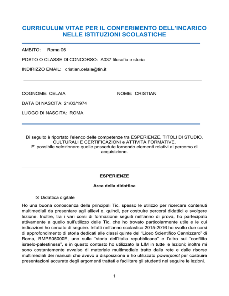 CURRICULUM VITAE PER IL CONFERIMENTO DELL’INCARICO NELLE ISTITUZIONI SCOLASTICHE AMBITO: Roma 06 POSTO O CLASSE DI CONCORSO: A037 filosofia e storia INDIRIZZO EMAIL: [email protected] COGNOME: CELAIA NOME: CRISTIAN DATA DI NASCITA: 21/03/1974 LUOGO DI NASCITA: ROMA Di seguito è riportato l’elenco delle competenze tra ESPERIENZE, TITOLI DI STUDIO, CULTURALI E CERTIFICAZIONI e ATTIVITÀ FORMATIVE. E’ possibile selezionare quelle possedute fornendo elementi relativi al percorso di acquisizione. ESPERIENZE Area della didattica ☒ Didattica digitale Ho una buona conoscenza delle principali Tic, spesso le utilizzo per ricercare contenuti multimediali da presentare agli allievi e, quindi, per costruire percorsi didattici e svolgere lezione. Inoltre, tra i vari corsi di formazione seguiti nell’anno di prova, ho partecipato attivamente a quello sull’utilizzo delle Tic, che ho trovato particolarmente utile e le cui indicazioni ho cercato di seguire. Infatti nell’anno scolastico 2015-2016 ho svolto due corsi di approfondimento di storia dedicati alle classi quinte del “Liceo Scientifico Cannizzaro” di Roma, RMPS05000E, uno sulla “storia dell’Italia repubblicana” e l’altro sul “conflitto israelo-palestinese”, e in questo contesto ho utilizzato la LIM in tutte le lezioni; inoltre mi sono costantemente avvalso di materiale multimediale tratto dalla rete e dalle risorse multimediali dei manuali che avevo a disposizione e ho utilizzato powerpoint per costruire presentazioni accurate degli argomenti trattati e facilitare gli studenti nel seguire le lezioni. 1 ☒ Didattica innovativa Ho una buona esperienza nell’organizzare una didattica alternativa alla lezione frontale di stampo tradizionale che, a mio avviso, rimane comunque fondamentale. Esempi di questa didattica innovativa che ho messo in pratica durante gli 11 anni di insegnamento che costituiscono la mia esperienza professionale sono: il t-group, il cooperative learning, il mastery learning, la classe capovolta, il certamen dialettico su un tema a scelta sul quale gli studenti devono confrontarsi immedesimandosi e interpretando il pensiero dei vari filosofi, l’uso delle Tic e l’elaborazione di contenuti multimediali sia per svolgere lezione sia come compito richiesto agli studenti. ☒ Legalità e cittadinanza Ho cercato, nel mio piccolo, di contribuire al superamento di pregiudizi e discriminazioni di natura sociale, culturale e religiosa nella scuola. Infatti, durante la mia esperienza professionale più che decennale, ogni volta che mi sono state chieste dagli studenti delucidazioni su argomenti di attualità inerenti i flussi migratori, il razzismo, i conflitti religiosi, il terrorismo, ho cercato di suscitare nei ragazzi una maggiore consapevolezza dei loro pregiudizi e una maggiore apertura nei confronti della diversità, in qualunque modo essa si presenti. Nello specifico nell’anno scolastico 2013–2014, presso il “Liceo Scientifico Primo Levi” di Roma, RMPS520003, ho svolto una supplenza annuale per l’attività sostitutiva della religione cattolica riguardante il tema “Etica e diritti umani”. Nell’anno scolastico 2015-2016, durante l’anno di prova presso il “Liceo Scientifico Cannizzaro” di Roma, RMPS05000E, ho accettato molto volentieri l’incarico, propostomi dalla vicepresidenza, di accompagnare alcuni studenti delle classi quinte ad una conferenza introduttiva sulla legalità nell’ambito del concorso “ambasciatori diritti umani”. Infine, anche durante lo svolgimento dei miei corsi pomeridiani di storia, ho potuto affrontare in varie occasioni i temi concernenti la legalità, i diritti umani e la cittadinanza attiva in merito al conflitto israelo-palestinese, agli anni di piombo in Italia e alle mafie. ☒ Pratica musicale Suono la chitarra e per diversi anni ho suonato in un gruppo. Area dell'accoglienza e dell'inclusione ☒ Educazione degli adulti Ho insegnato in corsi serali dedicati agli adulti presso l’ Istituto Paritario “A. Poliziano”, Roma, RMPS00500L. ☒ Inclusione (disabilità, disturbi specifici dell’apprendimento,…) In qualità di coordinatore di classe e di coordinatore del dipartimento di filosofia e storia, insieme ai colleghi, ho curato la redazione del PDP per gli studenti che presentavano 2 disturbi specifici dell’apprendimento (DSA) e per gli studenti che presentavano bisogni educativi speciali (BES). Area organizzativa e progettuale ☒ Coordinatore/referente di disciplina/dipartimento Ho svolto in molte occasioni la funzione di coordinatore di classe in diversi licei di Roma e di coordinatore del dipartimento di storia e filosofia presso il liceo scientifico “A. Poliziano” di Roma, RMPS00500L. ☒ Tutor tirocinanti/neoassunti Nell’anno scolastico 2007-2008 ho svolto la funzione di tutor per una tirocinante SSIS presso il liceo scientifico “ A. Poliziano” di Roma, RMPS00500L per la classe di concorso A037, filosofia e storia. Nell’anno scolastico 2012-13, presso lo stesso liceo e per la stessa classe di concorso, ho svolto la funzione di tutor per due tirocinanti TFA. TITOLI UNIVERSITARI, CULTURALI E CERTIFICAZIONI ☒ Dottorato su tematiche didattico-metodologiche ovvero alla classe di concorso 27/05/2011 Scuola dottorale in Pedagogia e Servizio Sociale, sezione Pedagogia, con borsa di studio presso l’università degli studi Roma Tre. Durante i tre anni del dottorato ho potuto formarmi in maniera approfondita nel campo pedagogico e imparare a fare ricerca. La mia tesi di dottorato, dal titolo “Paradigmi, modelli, teorie della mente. Questioni di pedagogia tra formazione e traduzione”, è stata pubblicata con il titolo “Pedagogia come traduzione”, Roma, Armando, 2012. Il volume propone un modello teorico inedito di pedagogia che si fonda sull’analogia strutturale e formale con la traduzione. La ricerca si presenta come un’indagine epistemologico-metateorica volta a definire l’assetto disciplinare della pedagogia