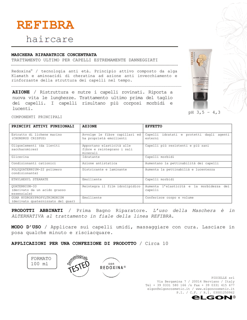 MASCHERA RIPARATRICE CONCENTRATA TRATTAMENTO ULTIMO PER CAPELLI ESTREMAMENTE DANNEGGIATI Redoxina® / tecnologia anti età. Principio attivo composto da alga Klamath e aminoacidi di cheratina ad azione anti invecchiamento e rinforzante della struttura dei capelli nel tempo. AZIONE / Ristruttura e nutre i capelli rovinati. Riporta a nuova vita le lunghezze. Trattamento ultimo prima del taglio dei capelli. I capelli risultano più corposi morbidi e lucenti. pH 3,5 – 4,3 COMPONENTI PRINCIPALI PRINCIPI ATTIVI FUNZIONALI AZIONE EFFETTO Estratto di lichene marino (CHONDRUS CRISPUS) Avvolge le fibre capillari ed ha proprietà emollienti Capelli esterni Oligoelementi (da lieviti saccharomices) Capelli più resistenti e più sani Glicerina Apportano elasticità alle fibre e reintegrano i sali minerali Idratante Condizionanti cationici Azione antistatica Aumentano la pettinabilità dei capelli POLYQUATERNIUM-22 polimero condizionante) Districante e laminante Aumenta la pettinabilià e lucentezza ETHYLHEXYL STEARATE Emolliente Capelli morbidi QUATERNIUM-33 (derivato da un acido grasso essenziale) GUAR HYDROXYPROPYLTRIMONIUM (derivato quaternizzato del guar) Reintegra il film idrolipidico Aumenta capelli Emolliente Conferisce corpo e volume idratati e protetti dagli agenti Capelli morbidi l’elasticità PRODOTTI ABBINATI / Prima Bagno Riparatore. L’uso della ALTERNATIVA al trattamento in fiale della linea REFIBRA. e la morbidezza Maschera dei è in MODO D’USO / Applicare sui capelli umidi, massaggiare con cura. Lasciare in posa qualche minuto e risciacquare. APPLICAZIONI PER UNA CONFEZIONE DI PRODOTTO / Circa 10 FORMATO 100 ml PIDIELLE srl Via Bergamina 7 / 20014 Nerviano / Italy Tel + 39 0331 580 166 /& Fax + 39 0331 415 677 [email protected] / www.elgoncosmetic.it P.I. / C.F. / R.I. 03001250962 CONCENTRATED RESTORING MASK ULTIMATE TREATMENT FOR EXTREMELY DAMAGED HAIR Restructuring cosmetic mask with high nourishing power for damaged hair. brings lengths back to life. Ultimate treatment before hair cutting. Hair is denser, softer and shinier. Redoxina®/ Anti-age technology. Active ingredients Klamath algae and keratin amino acids provide lasting antiageing and strengthening action. MAIN INGREDIENTS pH 3,5 – 4,3 FUNCTIONAL ACTIVE INGREDIENTS ACTION Sea lichen extract (CHONDRUS CRISPUS) It wraps properties EFFECT Oligoelements (from saccharomices yeasts) Stronger and healthier hair Glycerine They provide elasticity to fibers and restore mineral salts moisturizing Cationic conditioners Antistatic action Hair is combed more easily POLYQUATERNIUM-22 Untangling and laminating action Hair is combed more easily, it is brighter ETHYLHEXYL STEARATE Emollient Soft hair QUATERNIUM-33 (derived from an essential fatty acid) GUAR HYDROXYPROPYLTRIMONIUM (quaternized derivative of guar) It restores the hydrolipidic film Hair is more elastic and softer Emollient Provides body and volume hair fibers; softening Moisturized and protected hair from external agents Soft hair COMPLEMENTARY PRODUCTS / Before Restoring Shampoo. The use of the Mask in as ALTERNATIVE to the phials treatment REFIBRA. METHOD / apply on damp hair, massage thoroughly. Leave on for some minutes and rinse. APPLICATIONS PER ONE FLACON OF PRODUCT/ approx. 10. MASCARILLA REPARADORA CONCENTRADA TRATAMIENTO ÚLTIMO PARA CABELLOS EXTREMAMENTE DAÑADOS Mascarilla cosmética reestructurante con alto poder nutritivo para el cabello dañado. El cabello renace en toda su longitud. Tratamiento último antes del corte del cabello. El pelo recobra nueva vida y resulta más voluminoso, suave y brillante. Redoxina® / Tecnología antiedad. Principio activo formado por alga Klamath y aminoácidos de queratina de acción antienvejecimiento y fortalezadora de la estructura de los cabellos en el tiempo. COMPONENTES PRINCIPALES PRINCIPIOS ACTIVOS FUNCIONALES ACCIÓN EFECTO Extracto de liquen marino (CHONDRUS CRISPUS) envuelve las fibras capilares y tiene propiedades emolientes cabello hidratado y protegido de los agentes externos Oligoelementos (de levaduras saccharomices) Glicerina aportan elasticidad a las fibras y reintegran los sales minerales hidratante cabello más resistente y más sano Acondicionadores catiónicos acción antiestática aumento la peinabilidad del cabello POLYQUATERNIUM-22 desenredante y abrillantador aumenta peinabilidad y brillo ETHYLHEXYL STEARATE emoliente cabello suave cabello suave QUATERNIUM-33 (derivado de un ácido graso reintegra la película hidrolipídica aumenta la elasticidad y la suavidad del cabello esencial) GUAR HYDROXYPROPYLTRIMONIUM (derivado emoliente confiere consistencia y volumen cuaternizado del guar) PRODUCTOS COMBINADOS / antes Baño Reparador MODO DE EMPLEO / aplicar sobre cabellos mojados, masajear con cuidado. Dejar actuar durante algún minuto y aclarar. El uso de la mascarilla es una ALTERNATIVA al tratamiento en ampollas REFIBRA. APLICACIONES PARA 1 ENVASE DE PRODUCTO / unas 10 PIDIELLE srl Via Bergamina 7 / 20014 Nerviano / Italy Tel + 39 0331 580 166 /& Fax + 39 0331 415 677 [email protected] / www.elgoncosmetic.it P.I. / C.F. / R.I. 03001250962